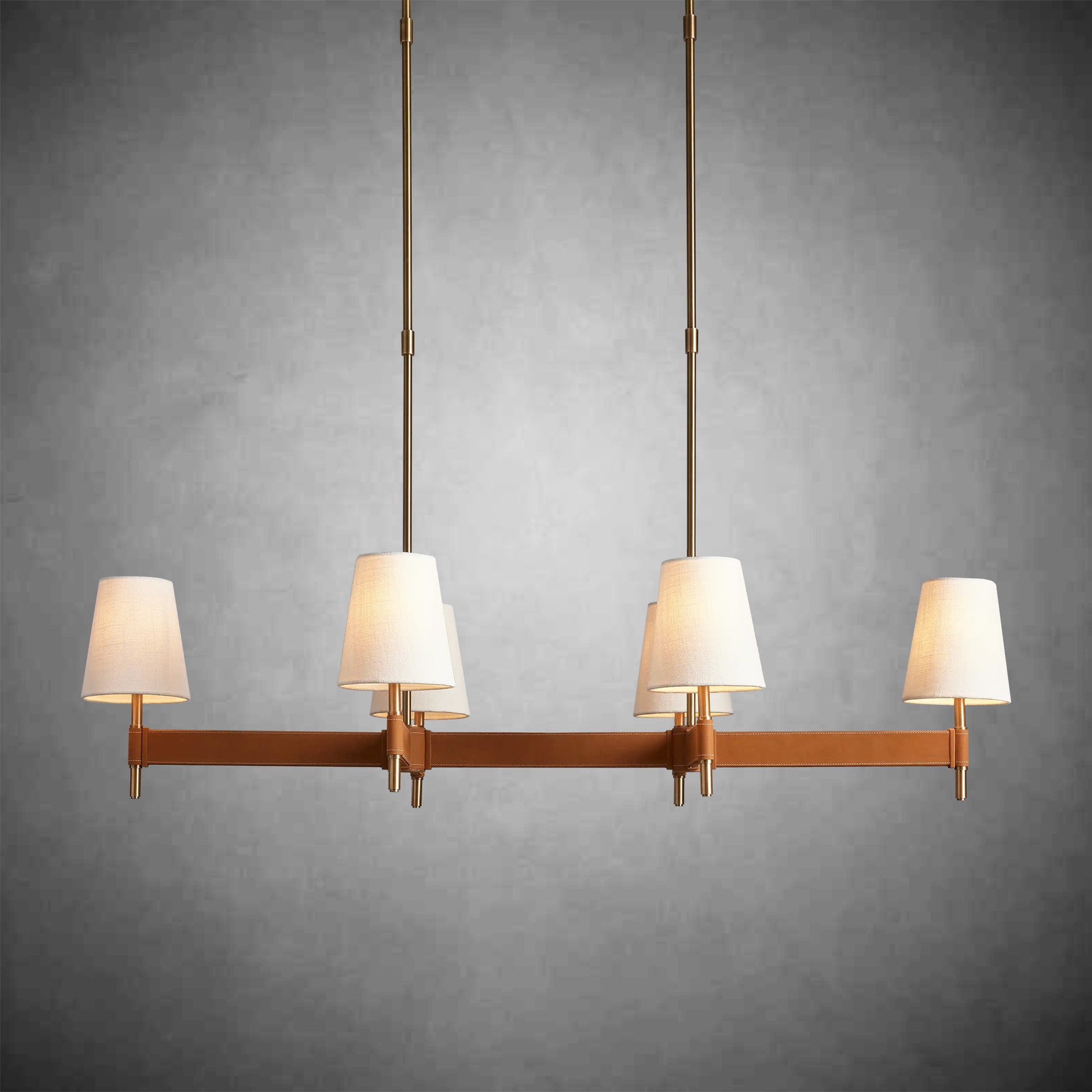 - Crafted from brass with an antiqued finish complemented by leather details and white linen shade.
