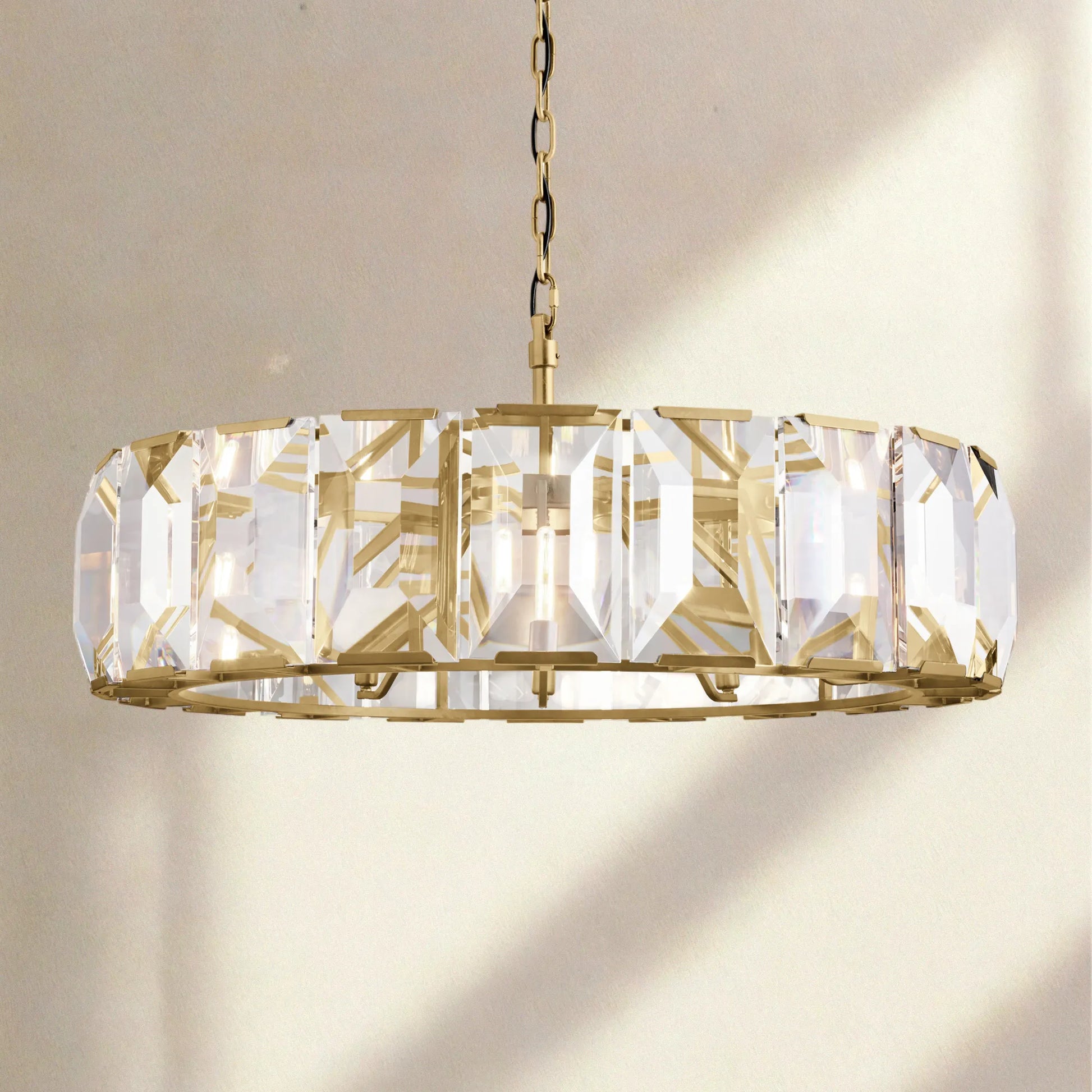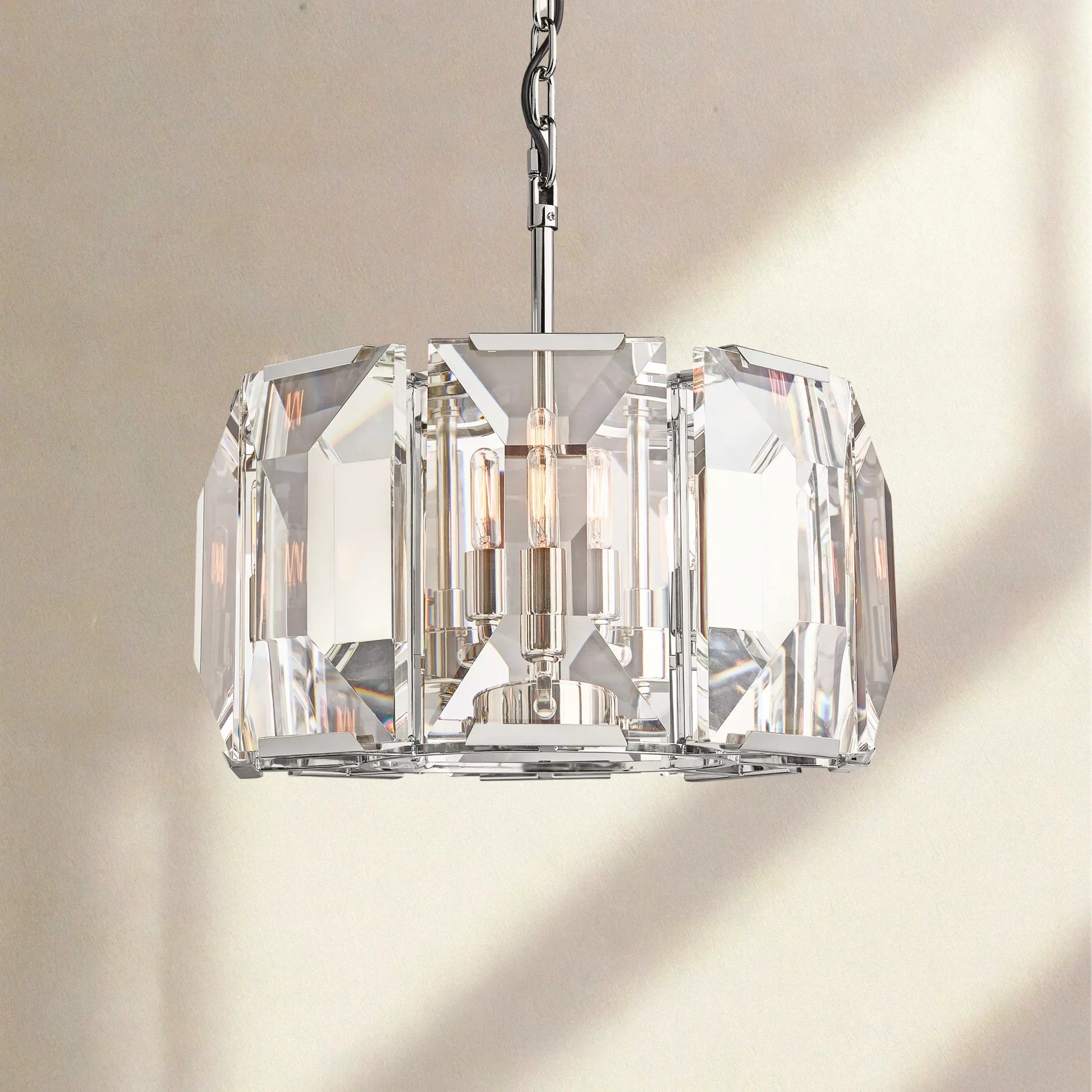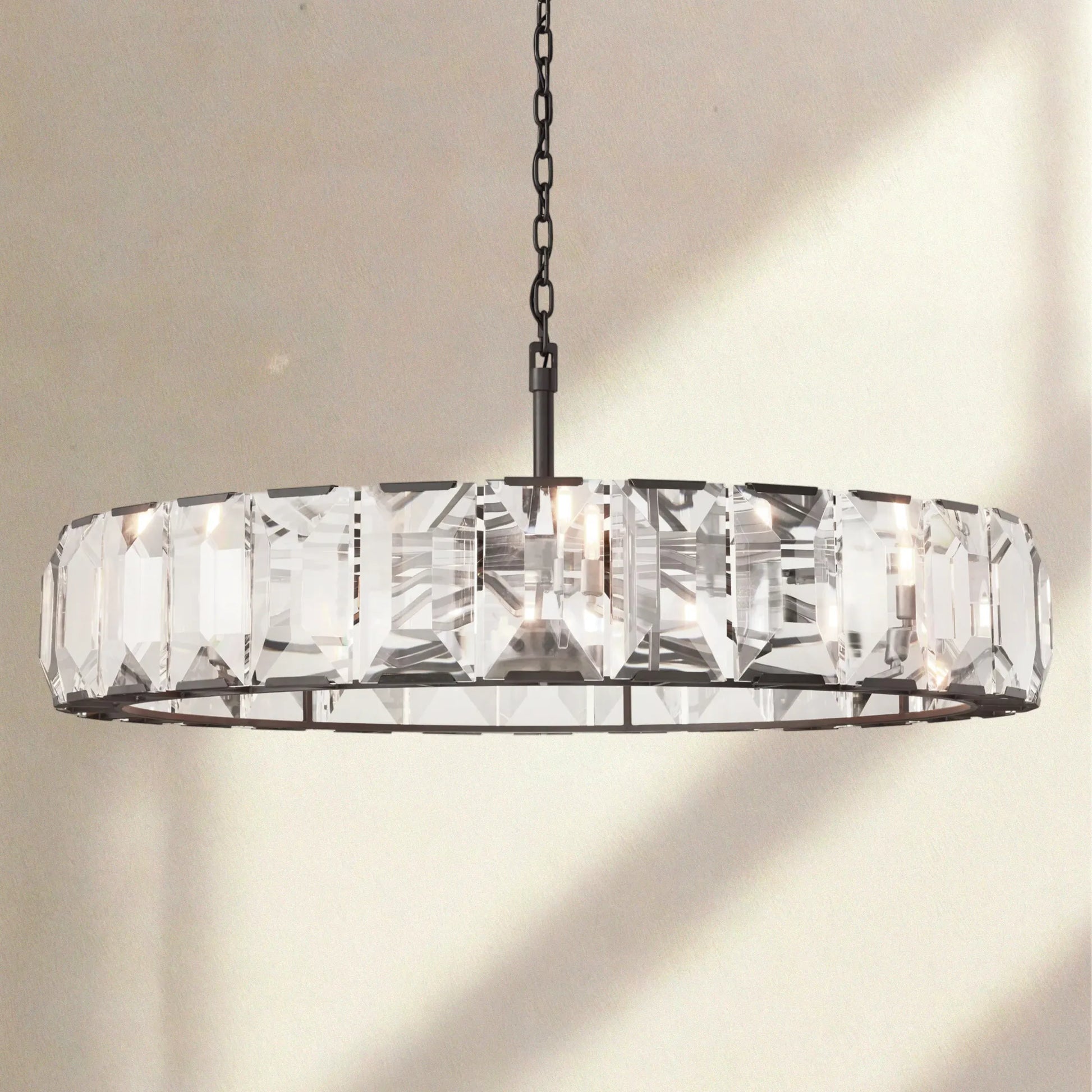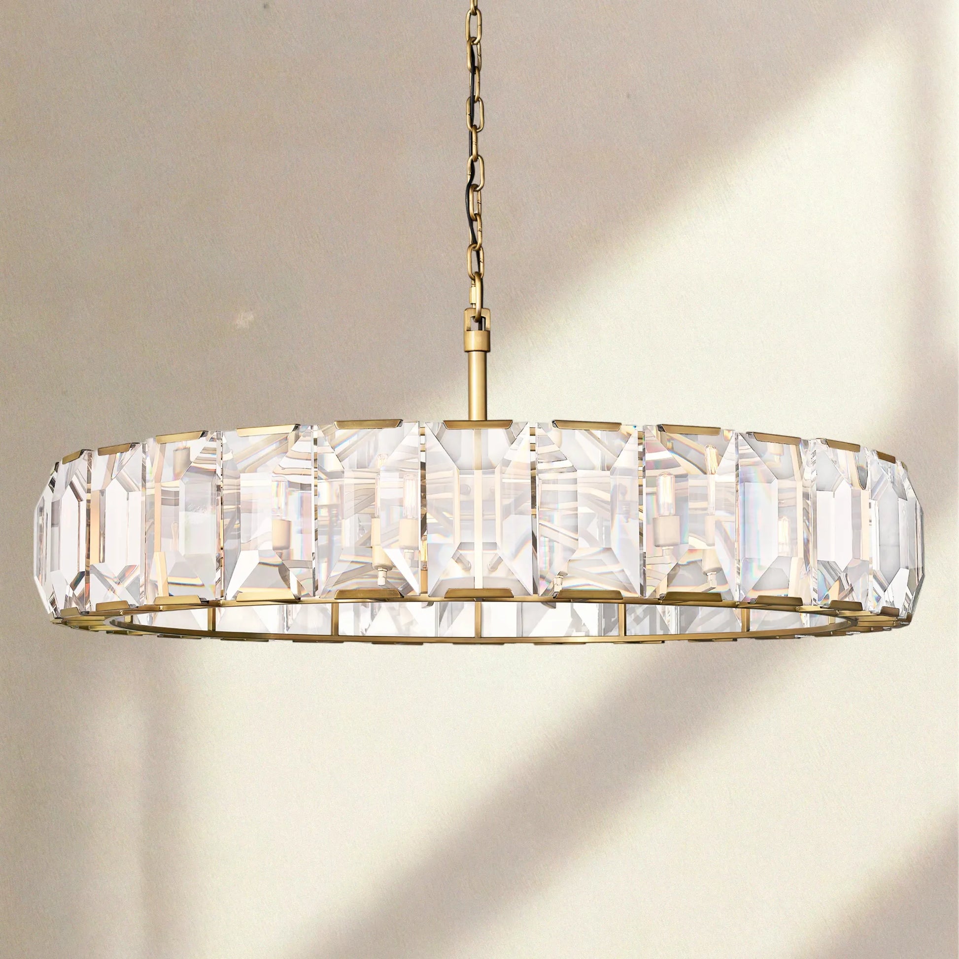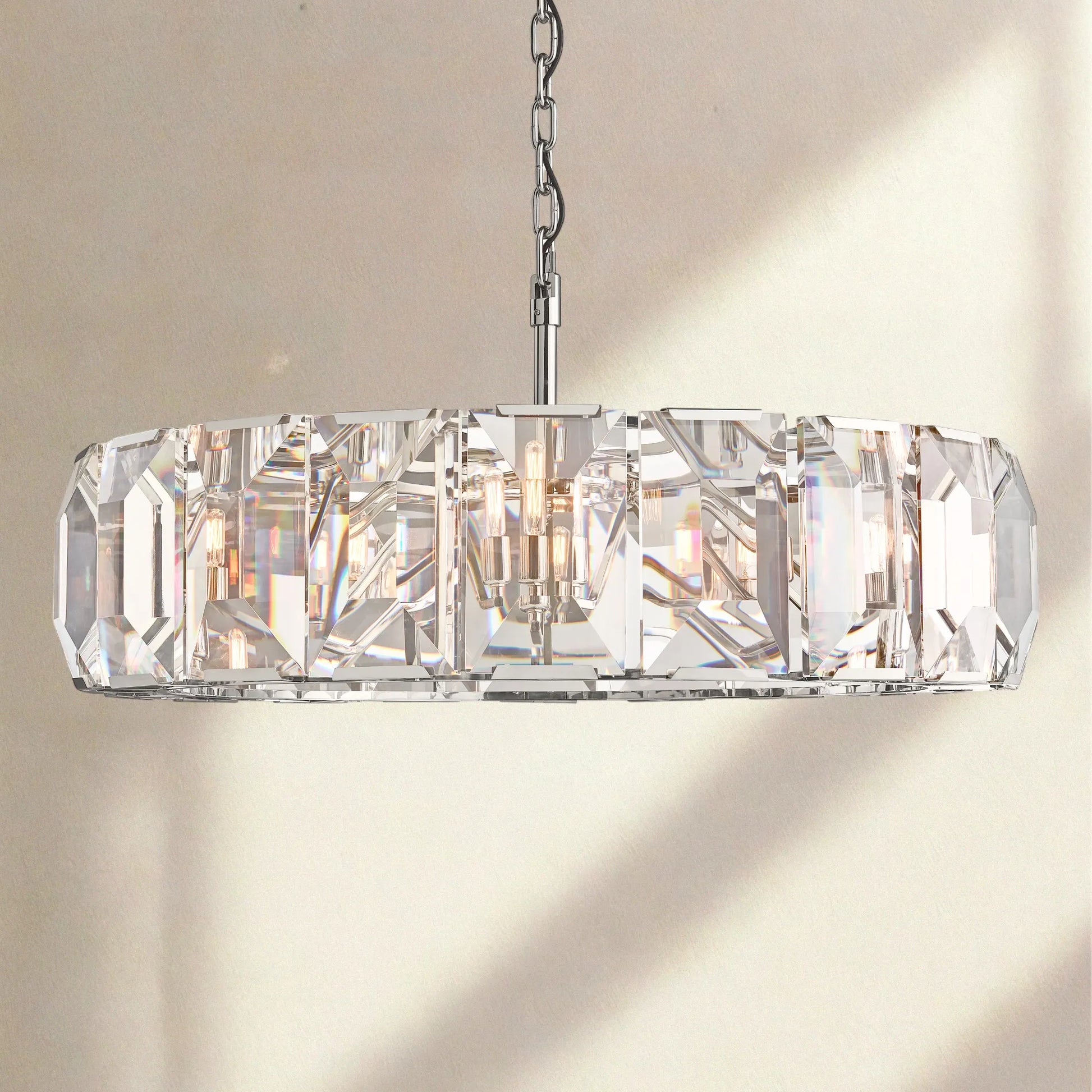 Drawing inspiration from German chandeliers of the 1970s, our lighting pieces channel the daring and elegance of that period. Utilizing a ring of faceted crystal glass prisms to bend and scatter light, the designer embodies the spirit of an emerald-cut diamond.