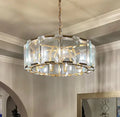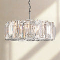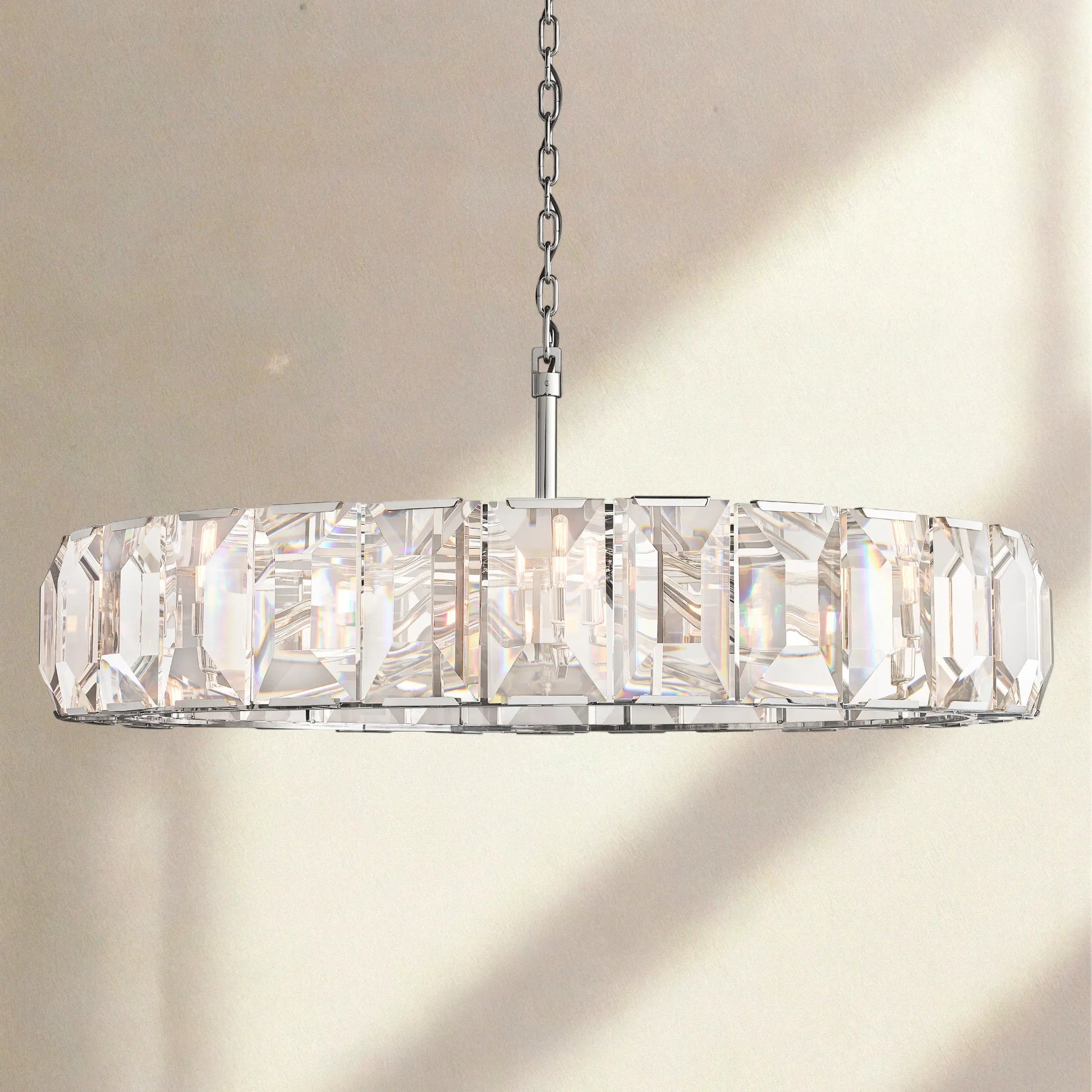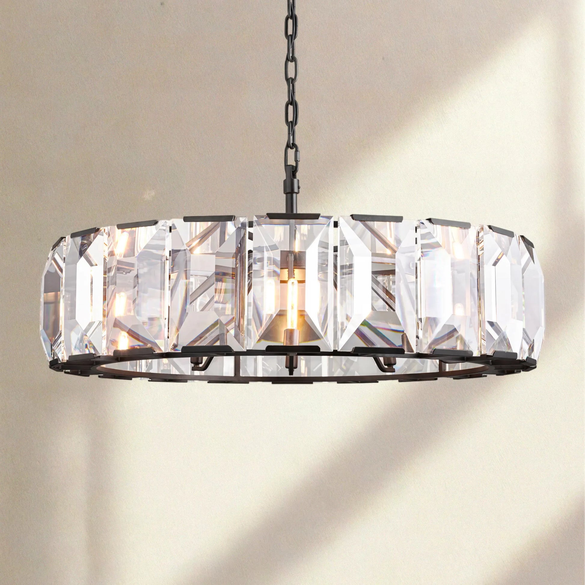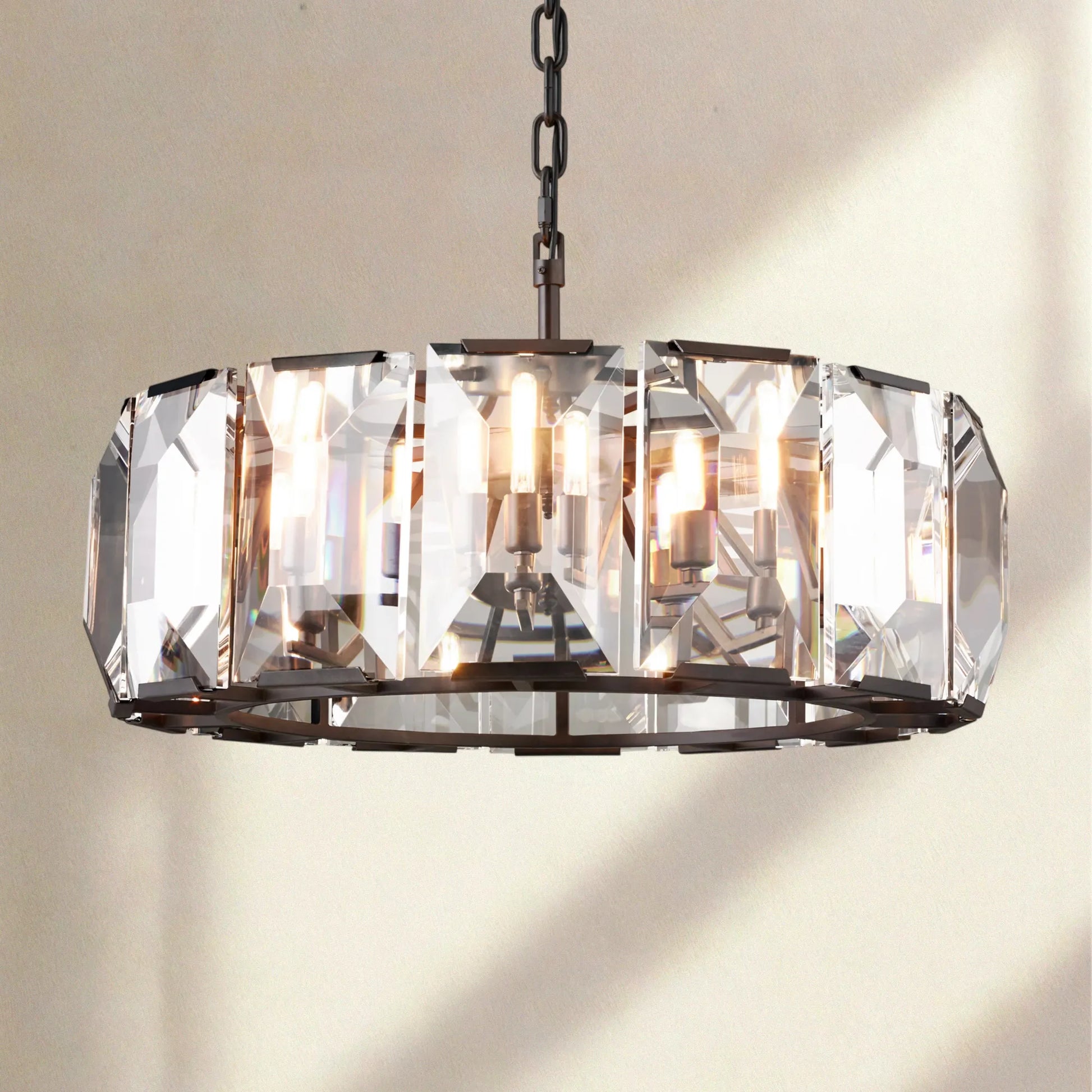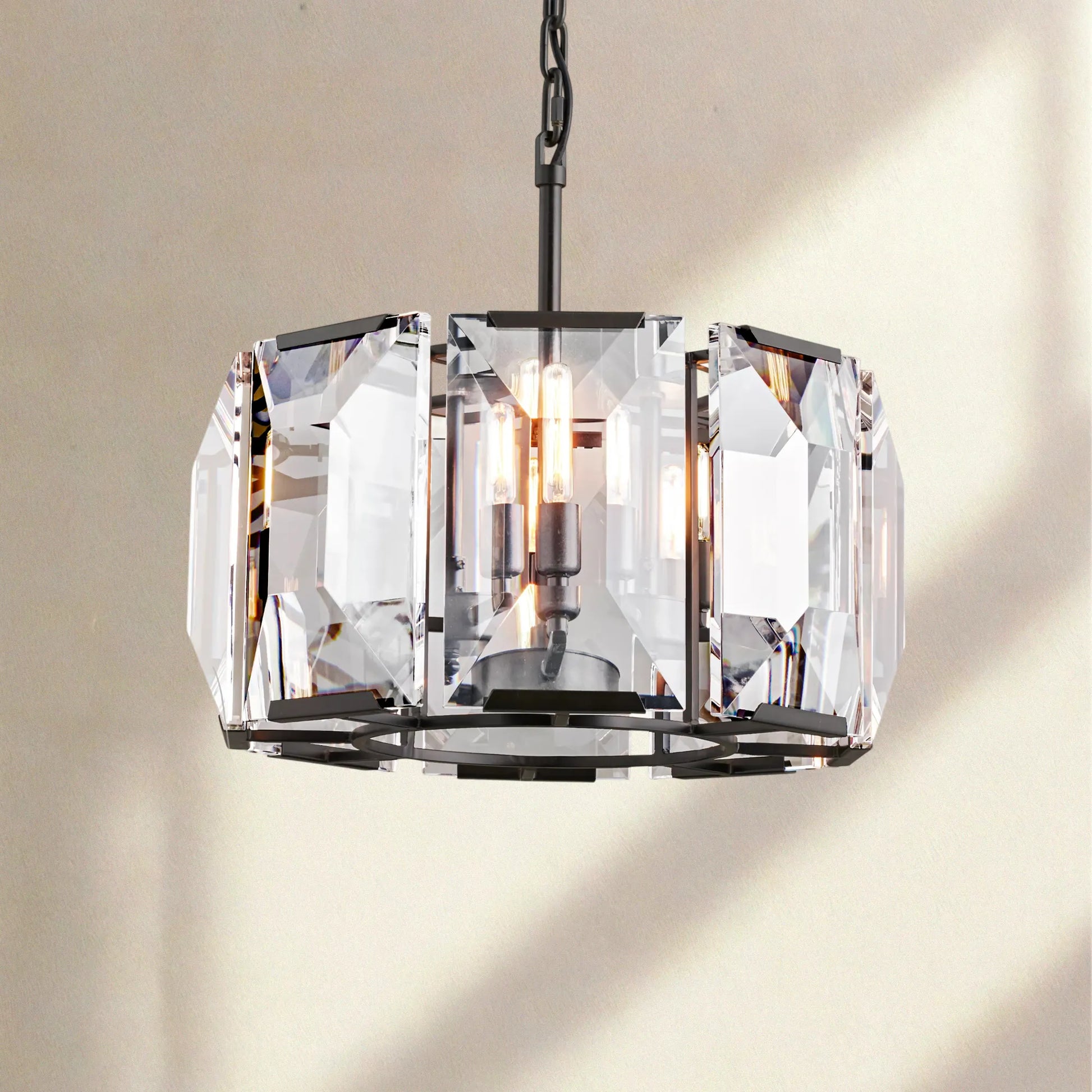 Drawing inspiration from German chandeliers of the 1970s, our lighting pieces channel the daring and elegance of that period. Utilizing a ring of faceted crystal glass prisms to bend and scatter light, the designer embodies the spirit of an emerald-cut diamond.