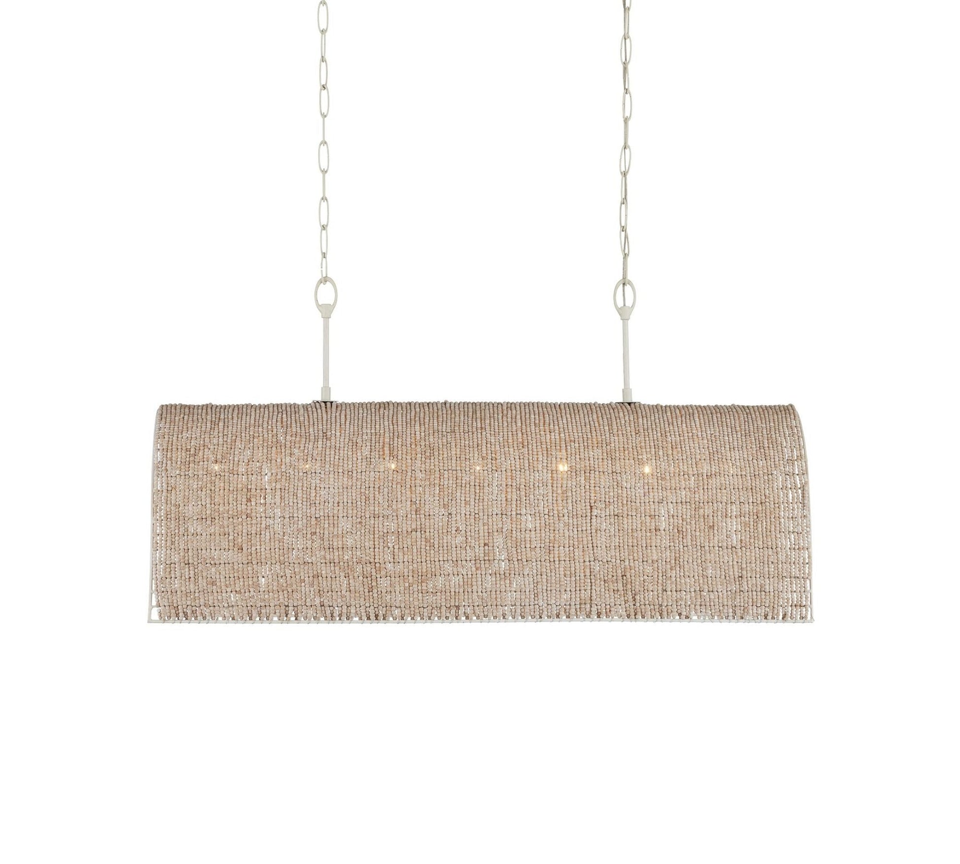- Handcrafted of wooden beads with a Whitewash finish and iron with a White finish.