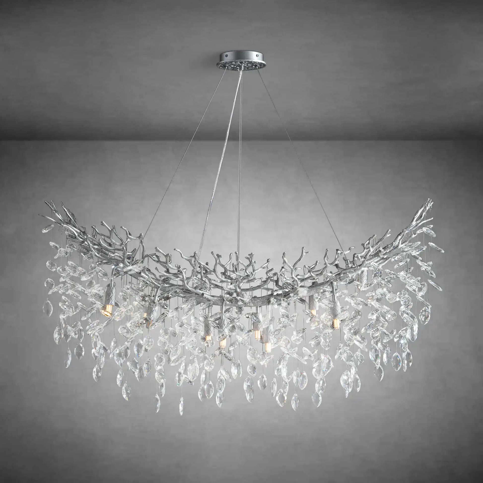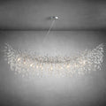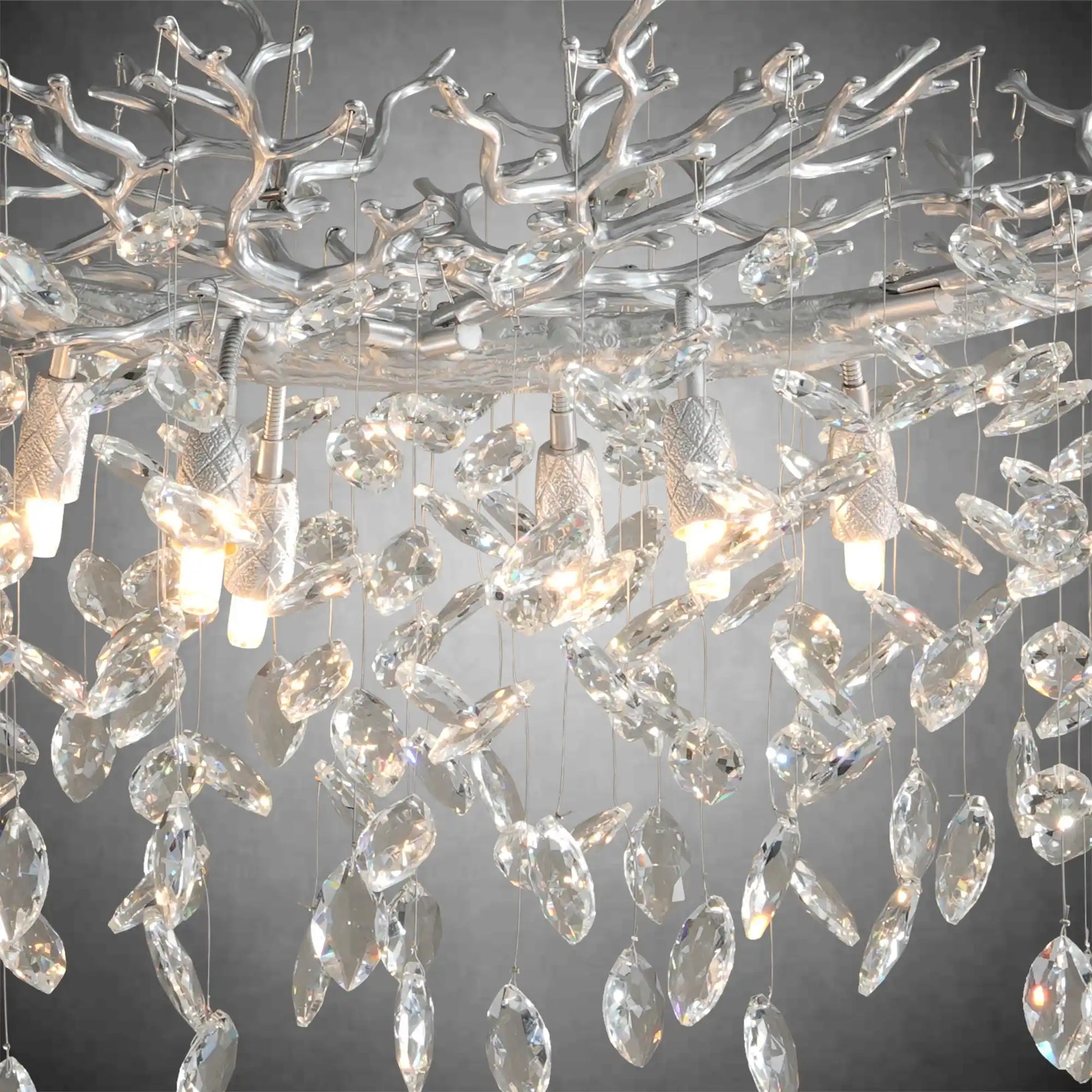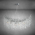 This modern rectangular crystal chandelier is inspired by nature and cosmic forms, featuring a sculptural branch-like structure adorned with premium K9 crystal strands. Crafted from aluminum with a metallic real-silver powder-coated finish, it creates a striking balance between artistic design and refined luxury.