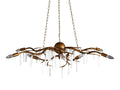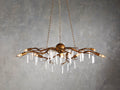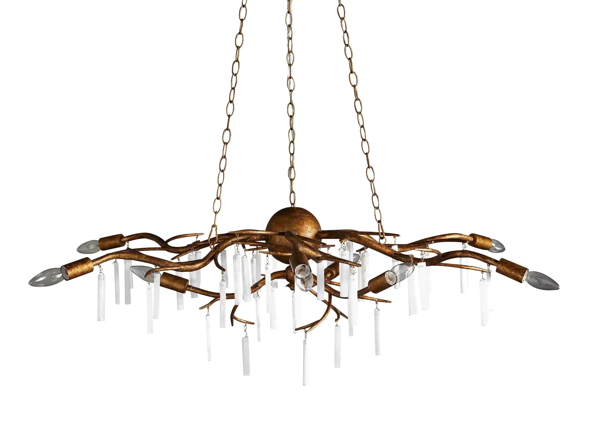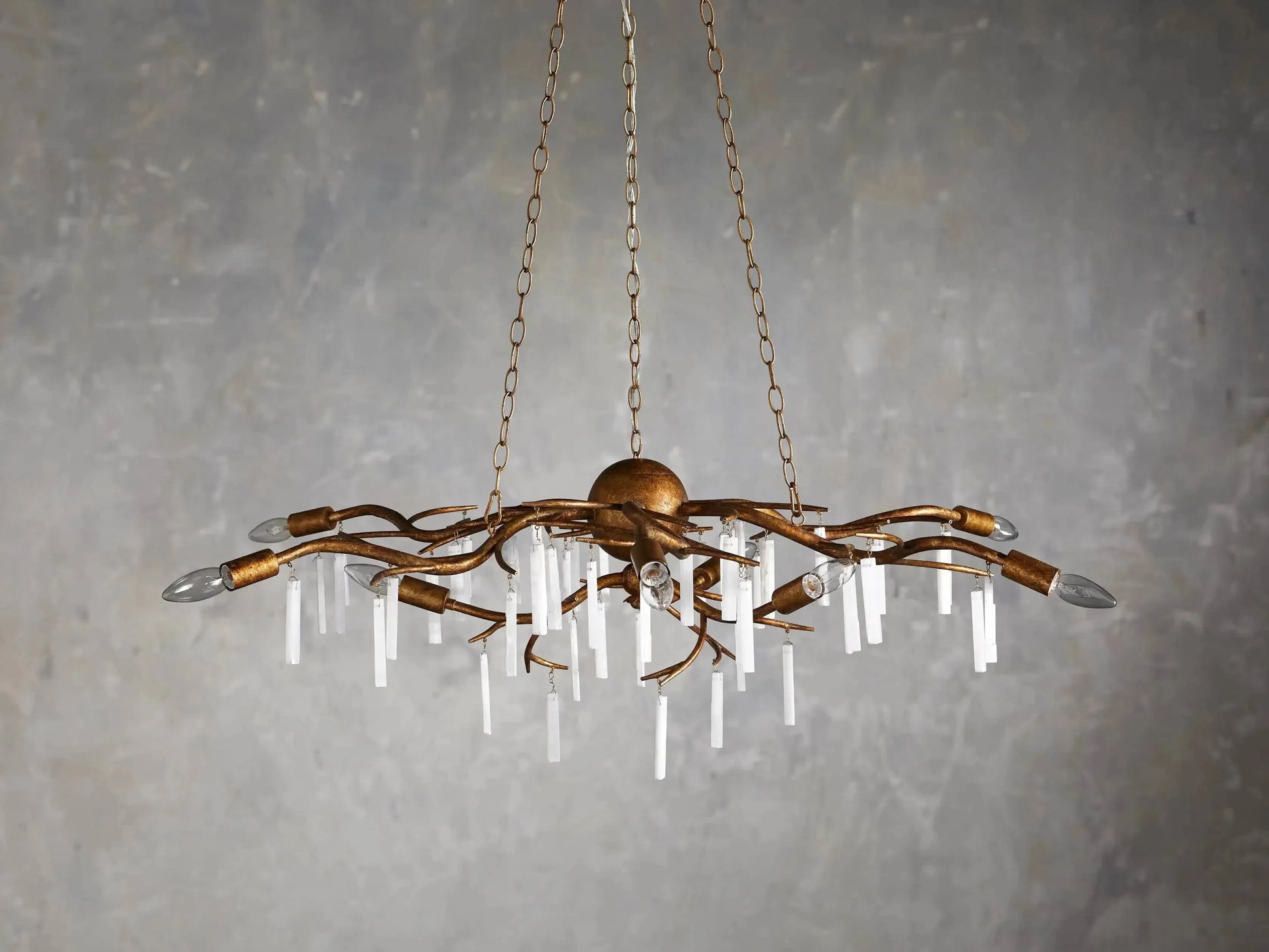 - Fifty-one glimmering, natural selenite crystals adorn our Jada 9-Light Chandelier, reflecting light as they hang elegantly beneath the chandelier’s iron frame. An antiqued, gold-foil finish is hand-brushed by our artisans, creating a glamorous aesthetic.