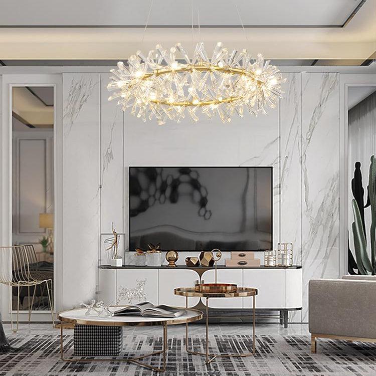 | This lovely family of modern crystal fixtures includes both single and double-tiered ring chandeliers. The chandeliers are adjustable and made of polished steel with a gold finish and adorned with clear crystal. Use them throughout the house in hallways, living rooms, bedrooms, or wherever you please. |