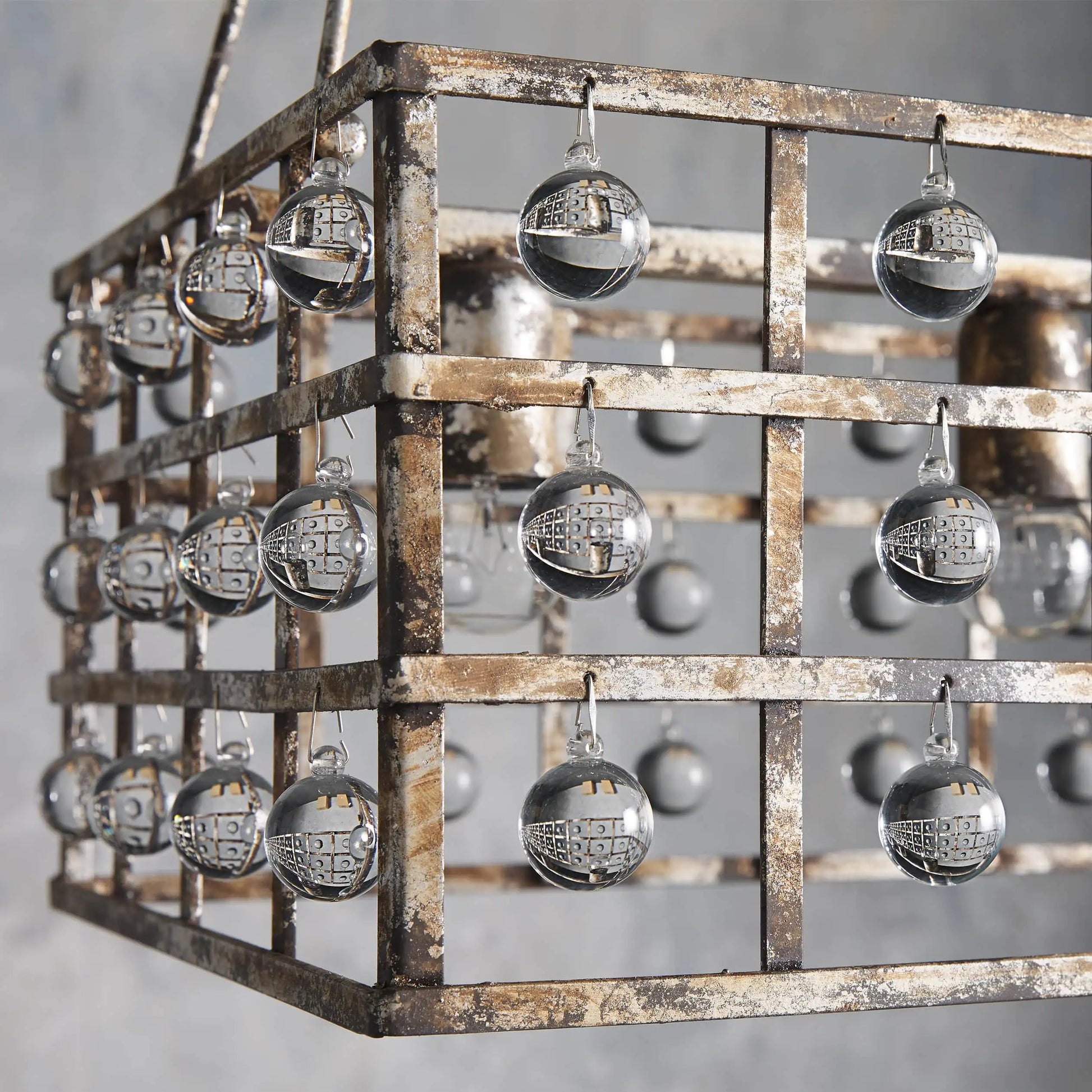 - Industrial chic meets modern flair in this eye-catching chandelier. Crafted in Italy, this fixture’s iron cage frame with antiqued patina is inspired by vintage factory lighting. Glass crystal spheres add unexpected glamour.