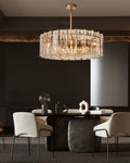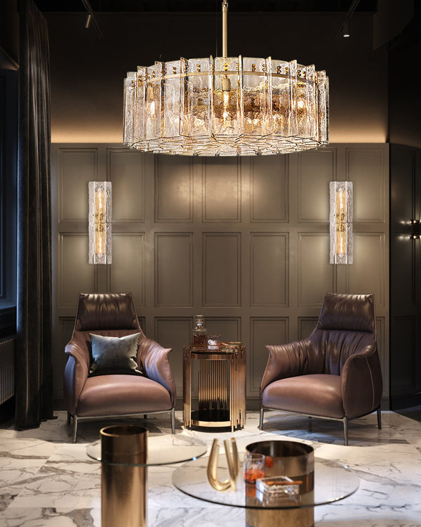| Crafted of solid cast glass, the collection's interlocking planes recall the geometric precision of the midcentury International Style. A study in repetition and rhythm, the linear form employs open space to lend a weightless feel. Gently rounded corners on the fluid, rippled panes subtly soften the outline, while diffused light glows from within. |