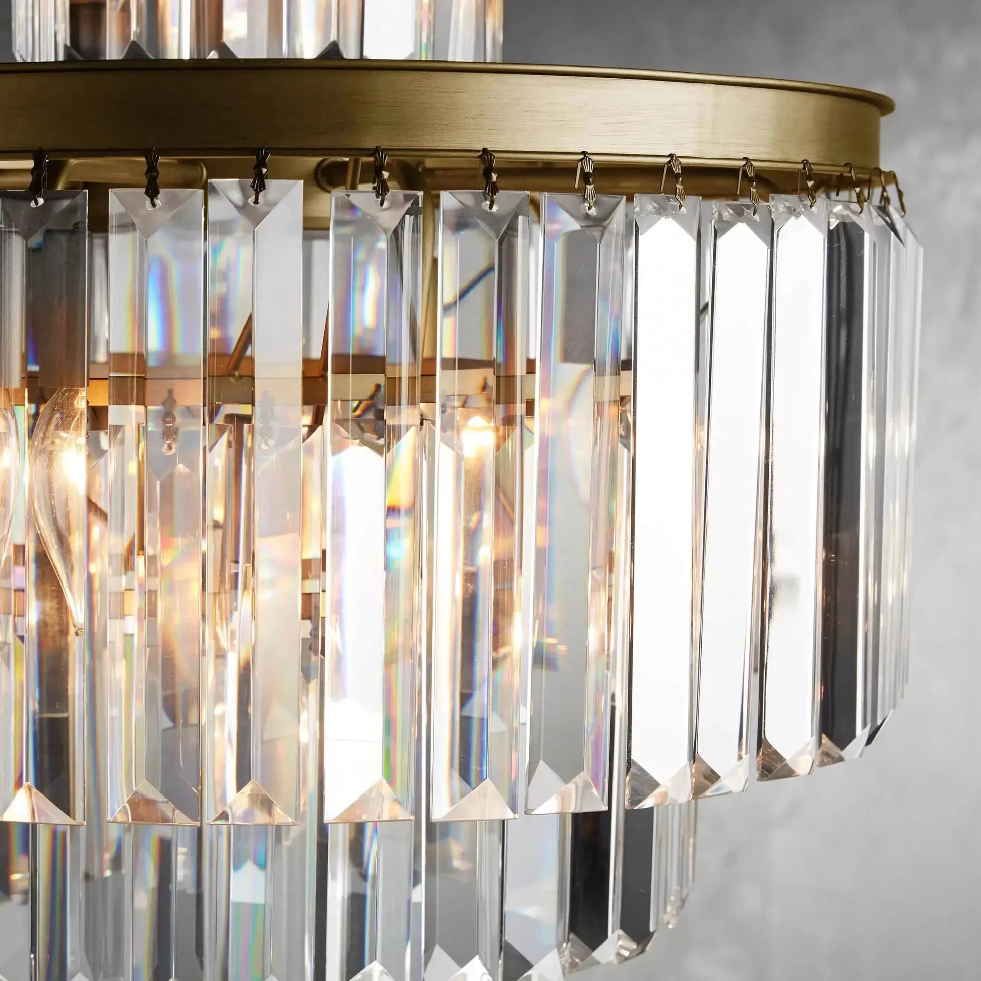 French Art Deco style of the 1920s is reborn in our glamorous Leyland Lighting Collection, featuring layered rows of faceted glass prisms from a rustic iron frame.