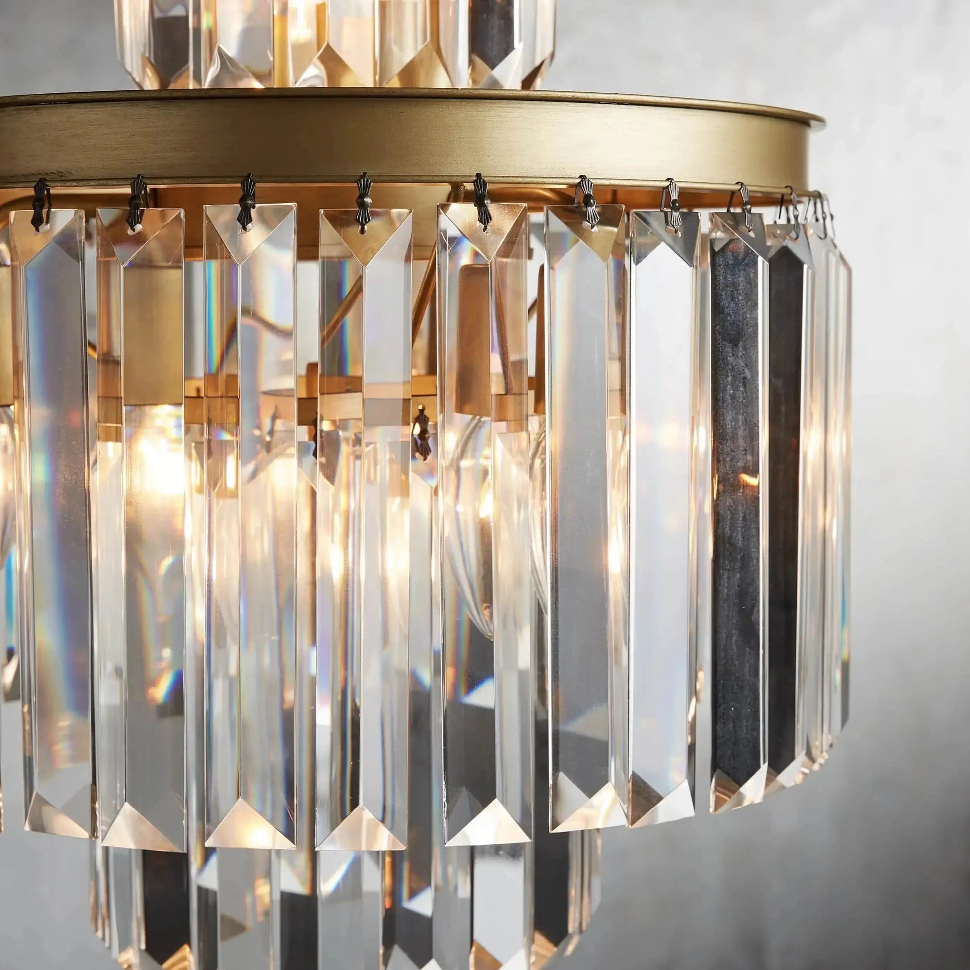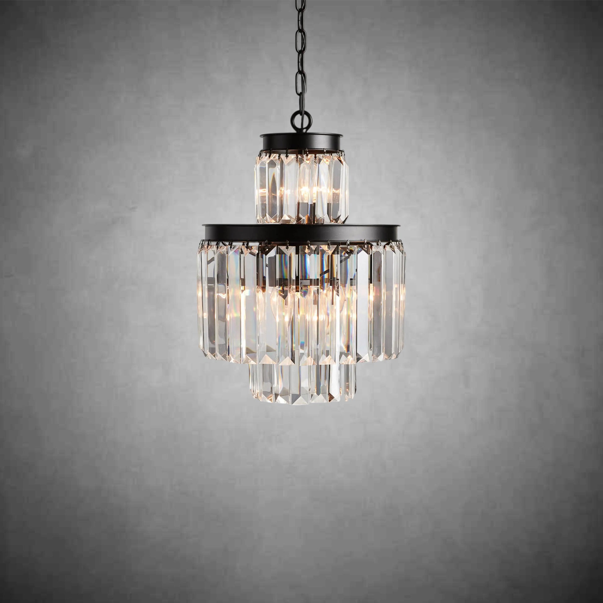 - French Art Deco style of the 1920s is reborn in our glamorous Leyland Lighting Collection, featuring layered row upon row of faceted glass crystals from a rustic iron frame.