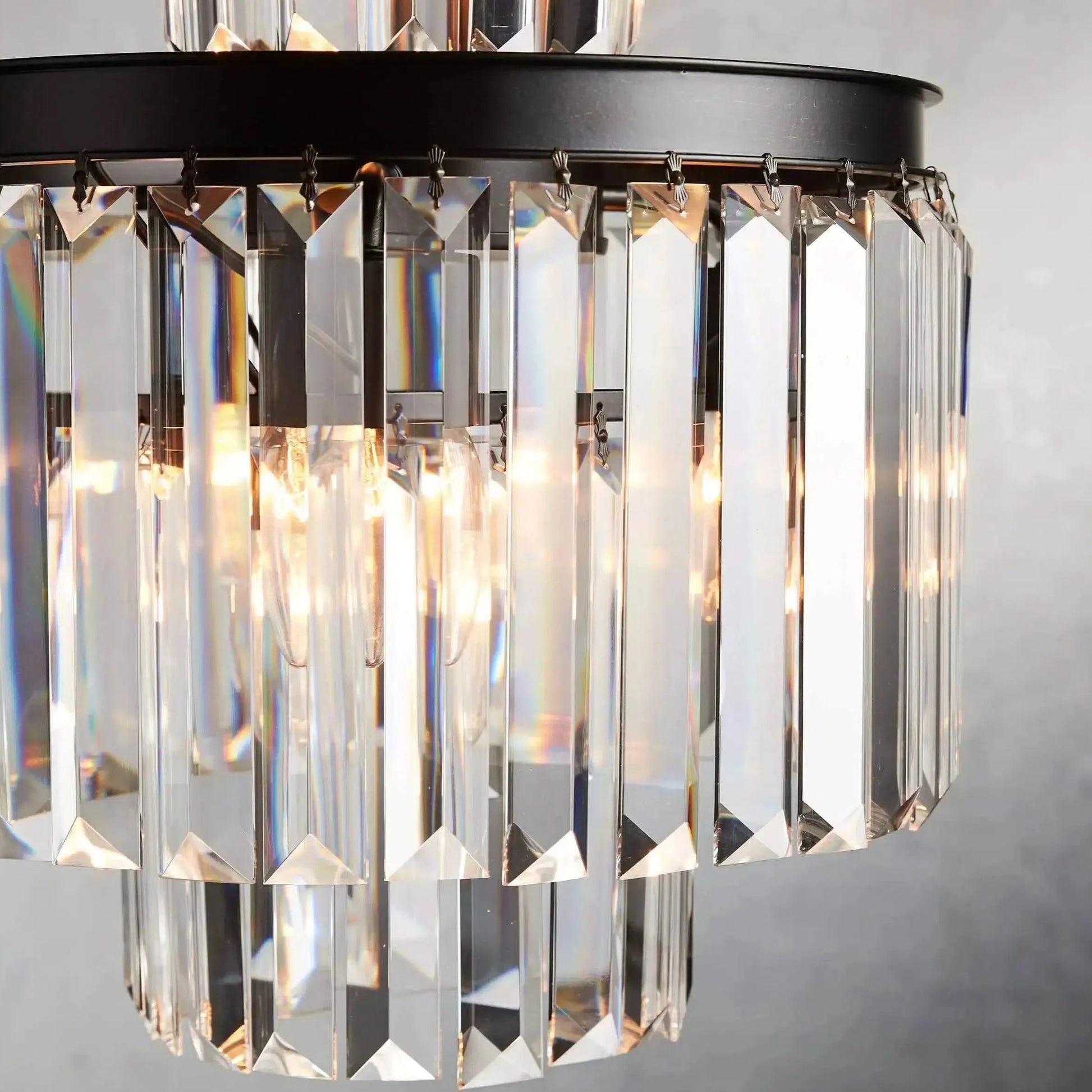 - Crafted from multifaceted K9 glass crystals with an iron frame and oil-rubbed finish.