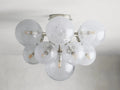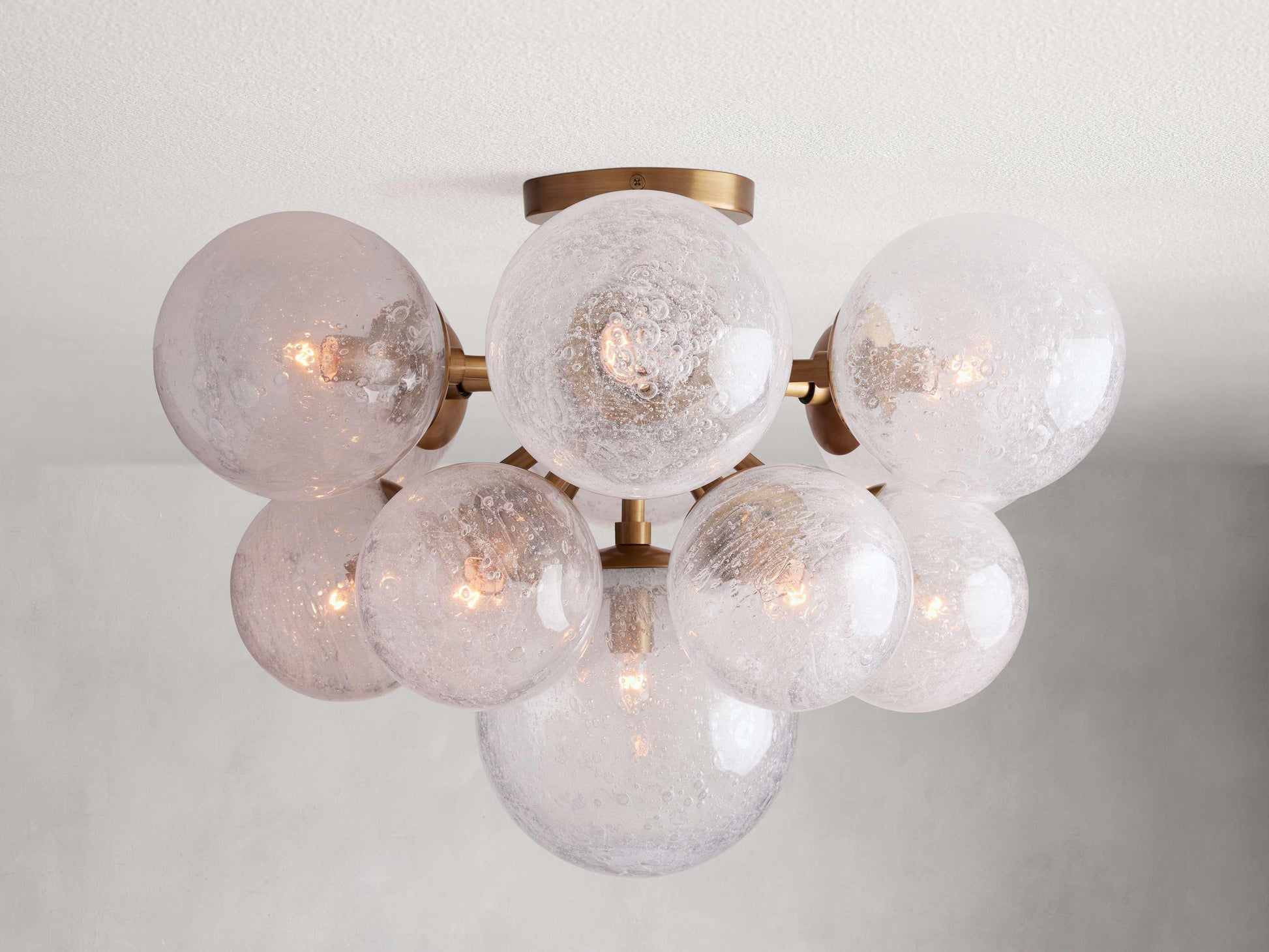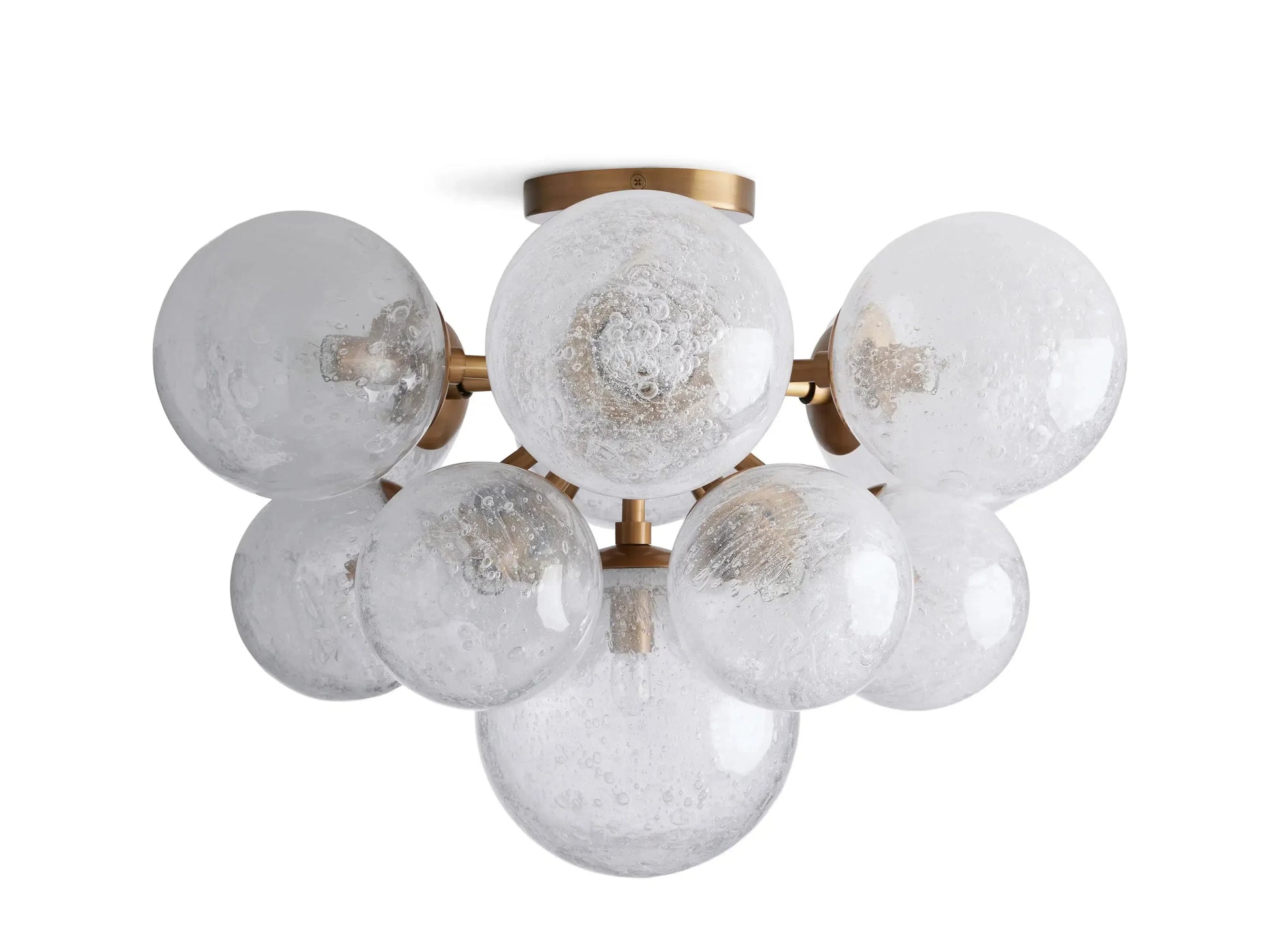 - Crafted from burnished brass-finished steel and aluminum with hand-blown glass globes.