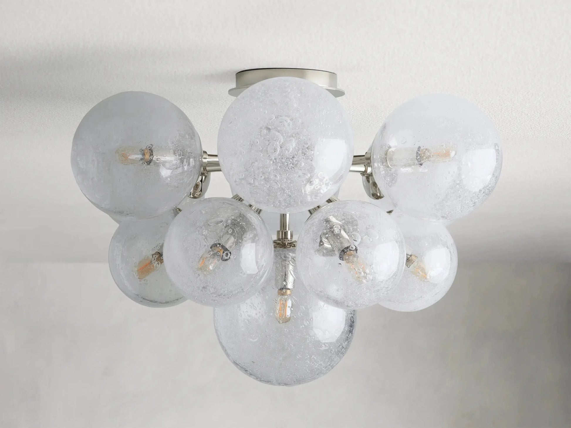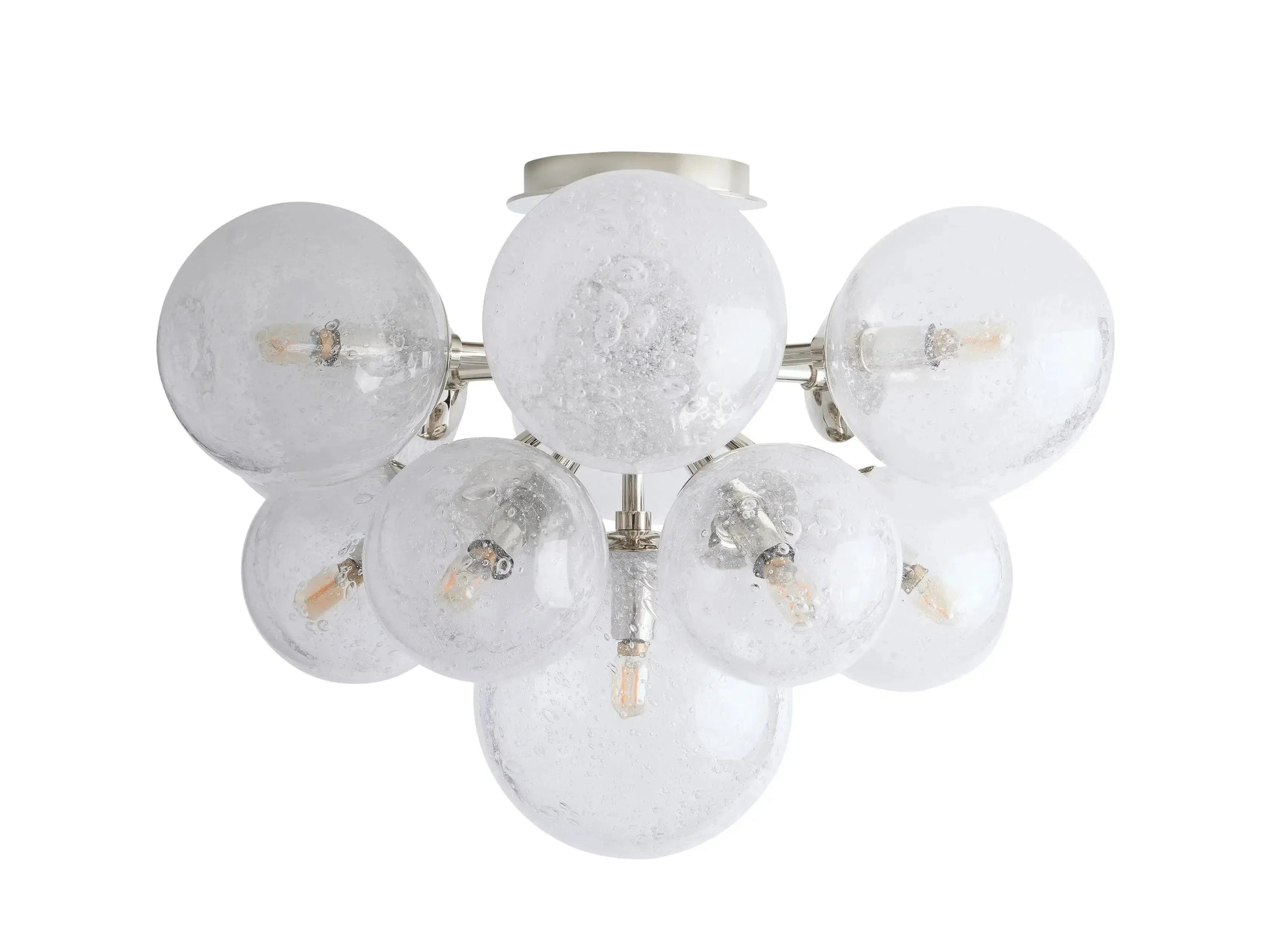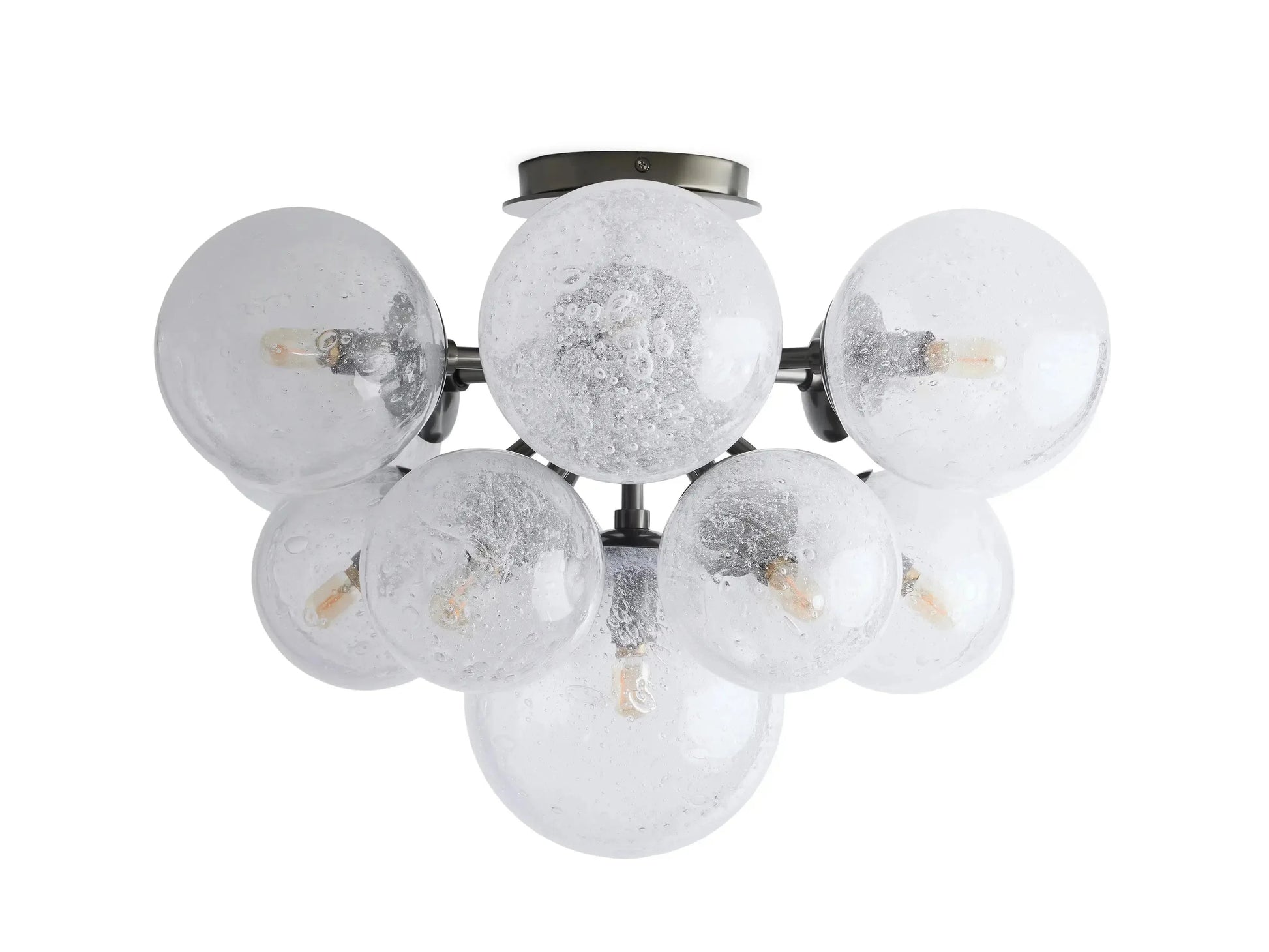 - A fusion of rustic charm and industrial design, our Mandoza Collection features stunning silhouettes and mixed-material style. Each individual glass globe is hand-blown with a reactive technique, creating a dense network of bubbles under a thick layer of glass. The result has a striking effect when illuminated from within, casting light from every angle.