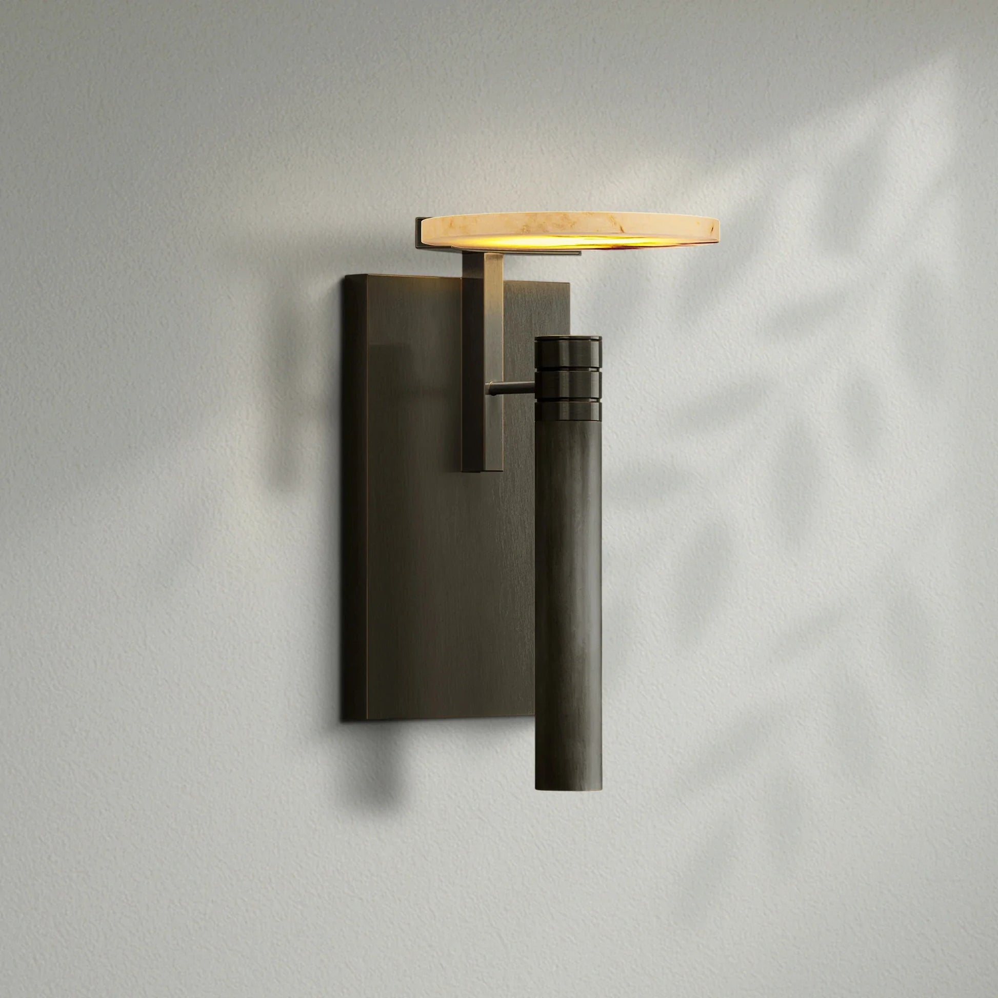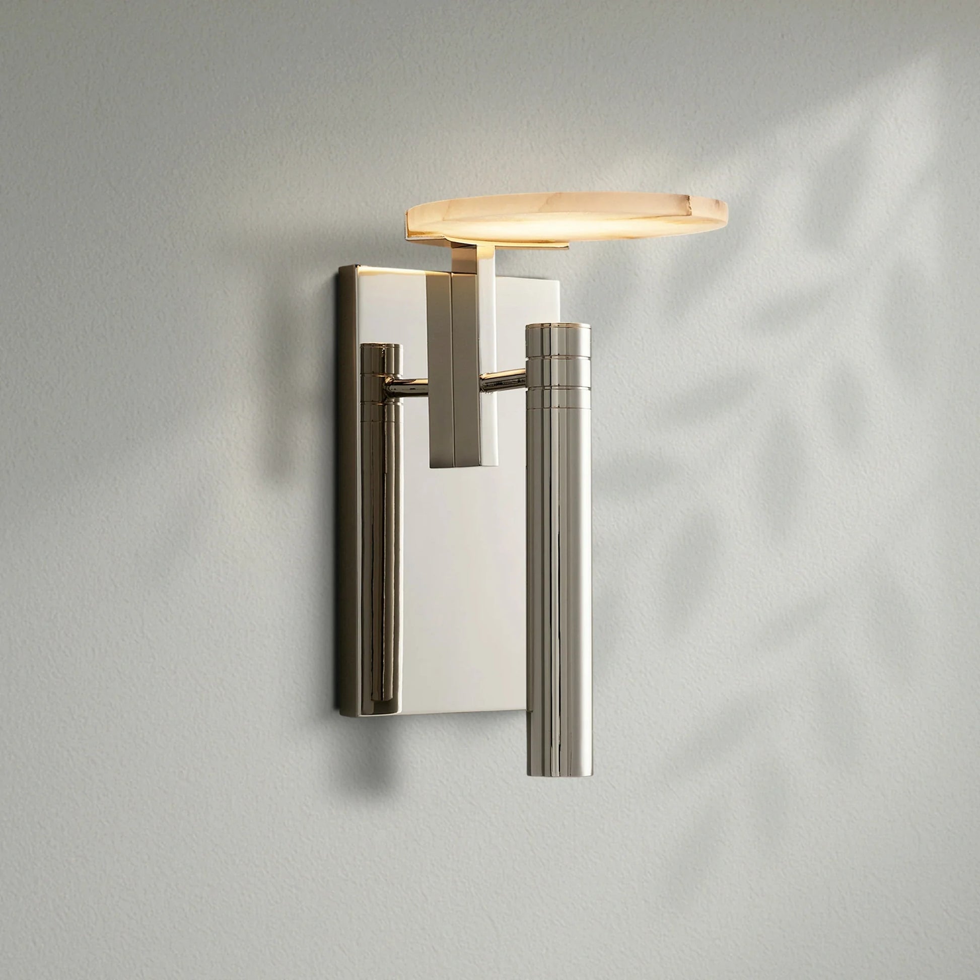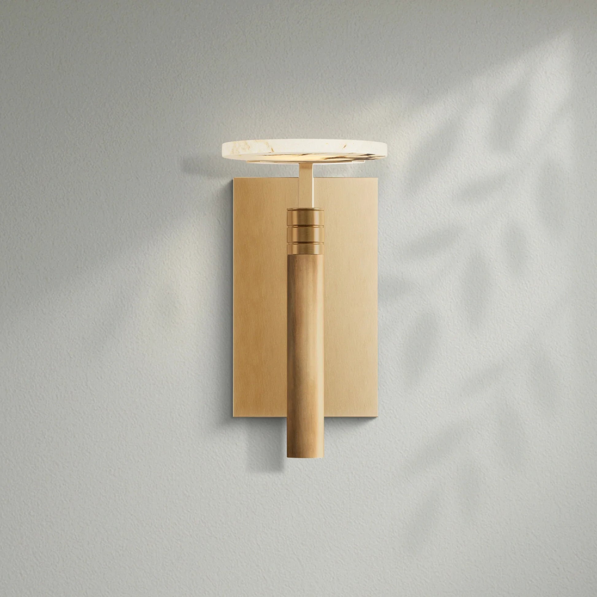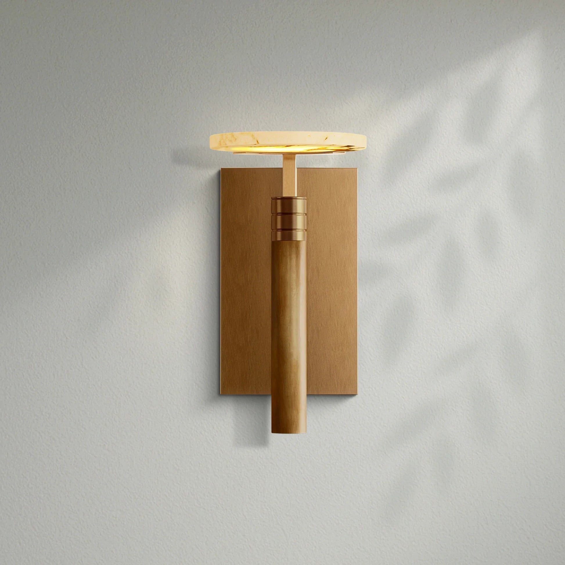 Rich, natural alabaster lends a refined sensibility to the Mélange collection, inspired by midcentury Italian design. The slender alabaster disc appears to float above an industrial brass armature. Light delivers a warm glow as it passes through the translucent stone.