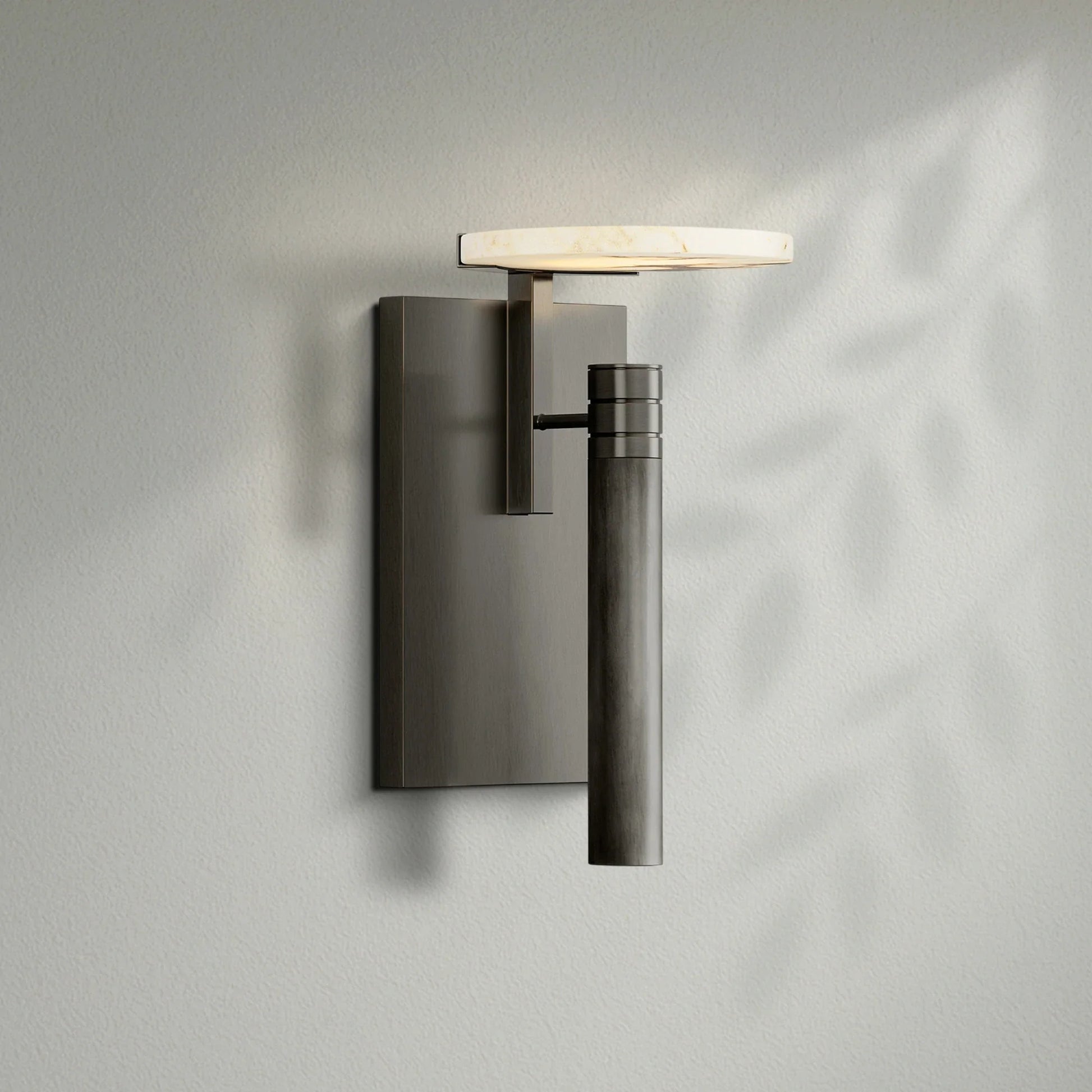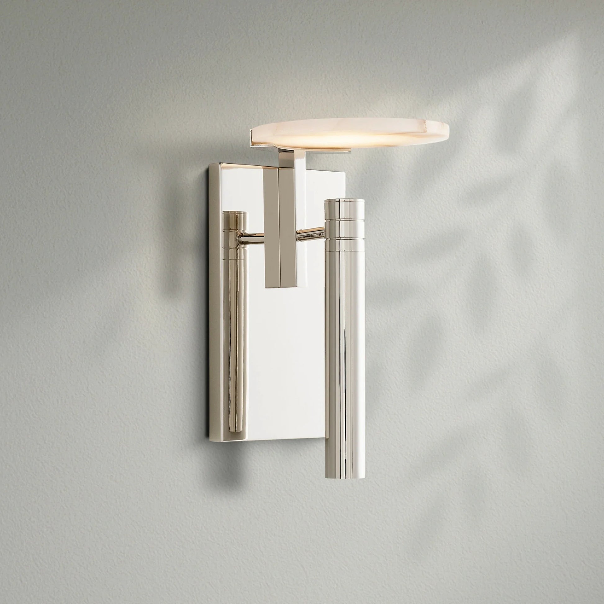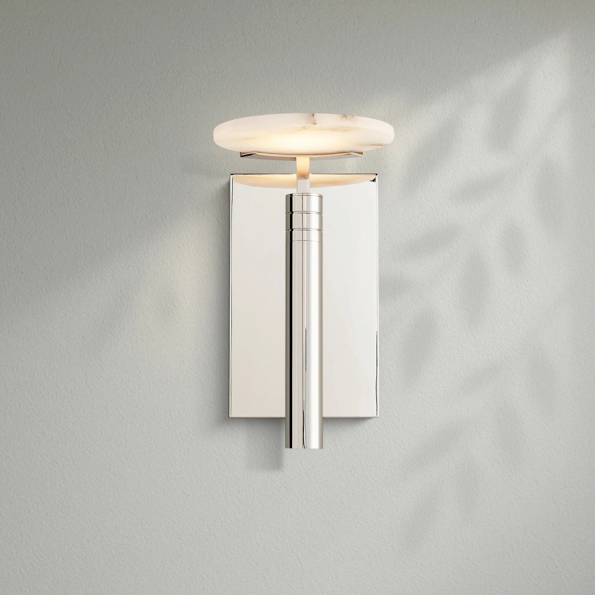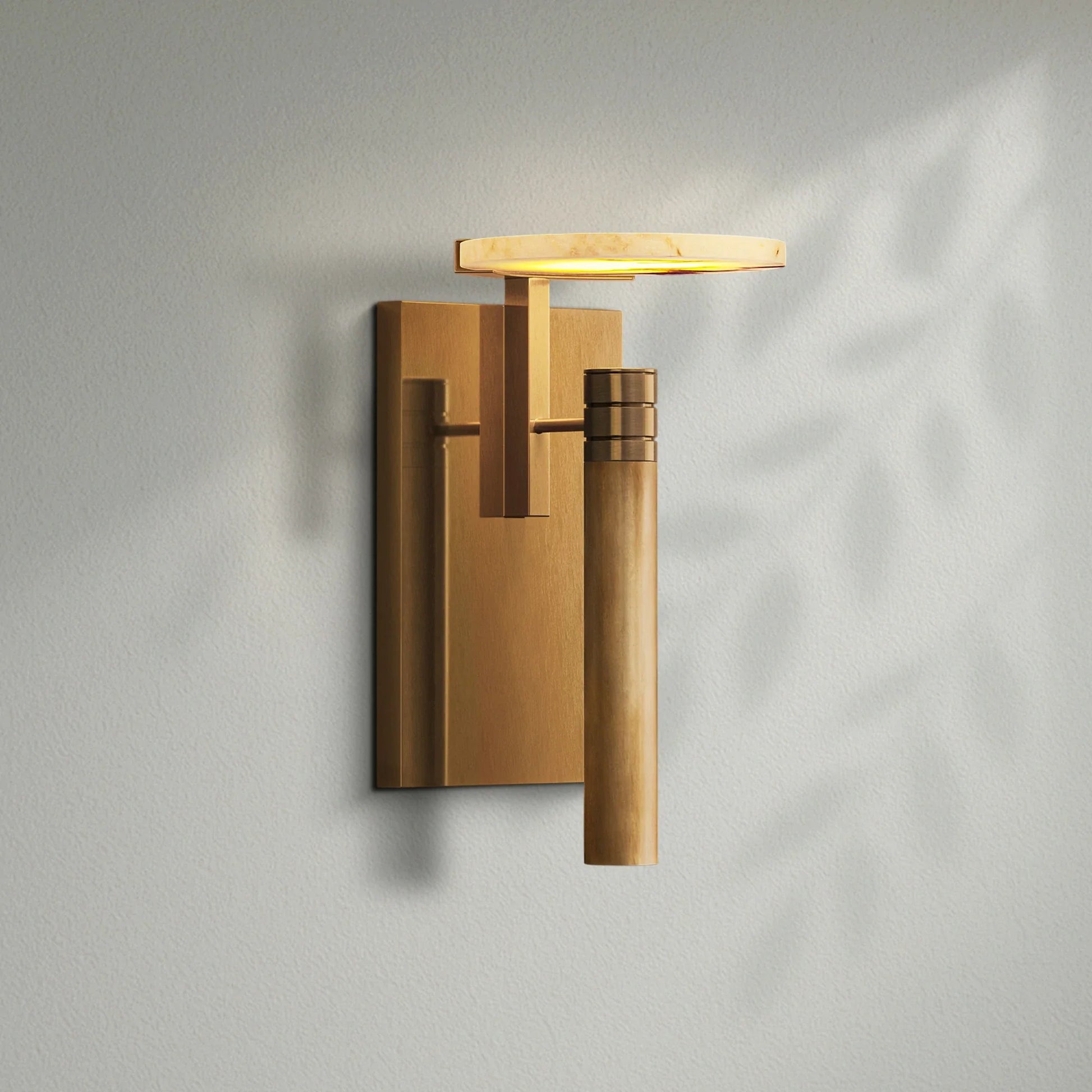 Rich, natural alabaster lends a refined sensibility to the Mélange collection, inspired by midcentury Italian design. The slender alabaster disc appears to float above an industrial brass armature. Light delivers a warm glow as it passes through the translucent stone.
