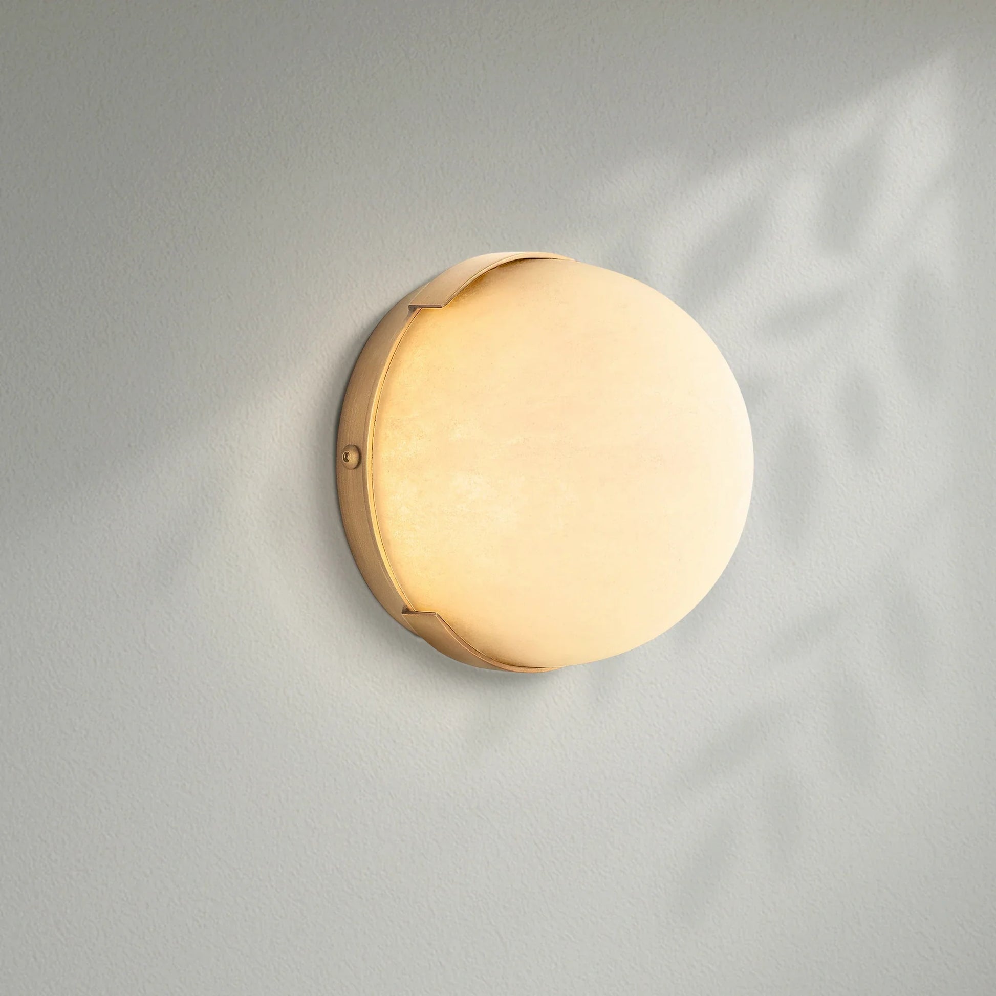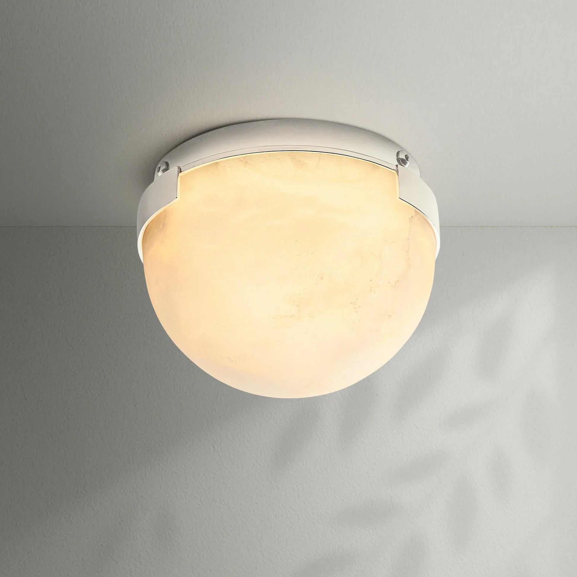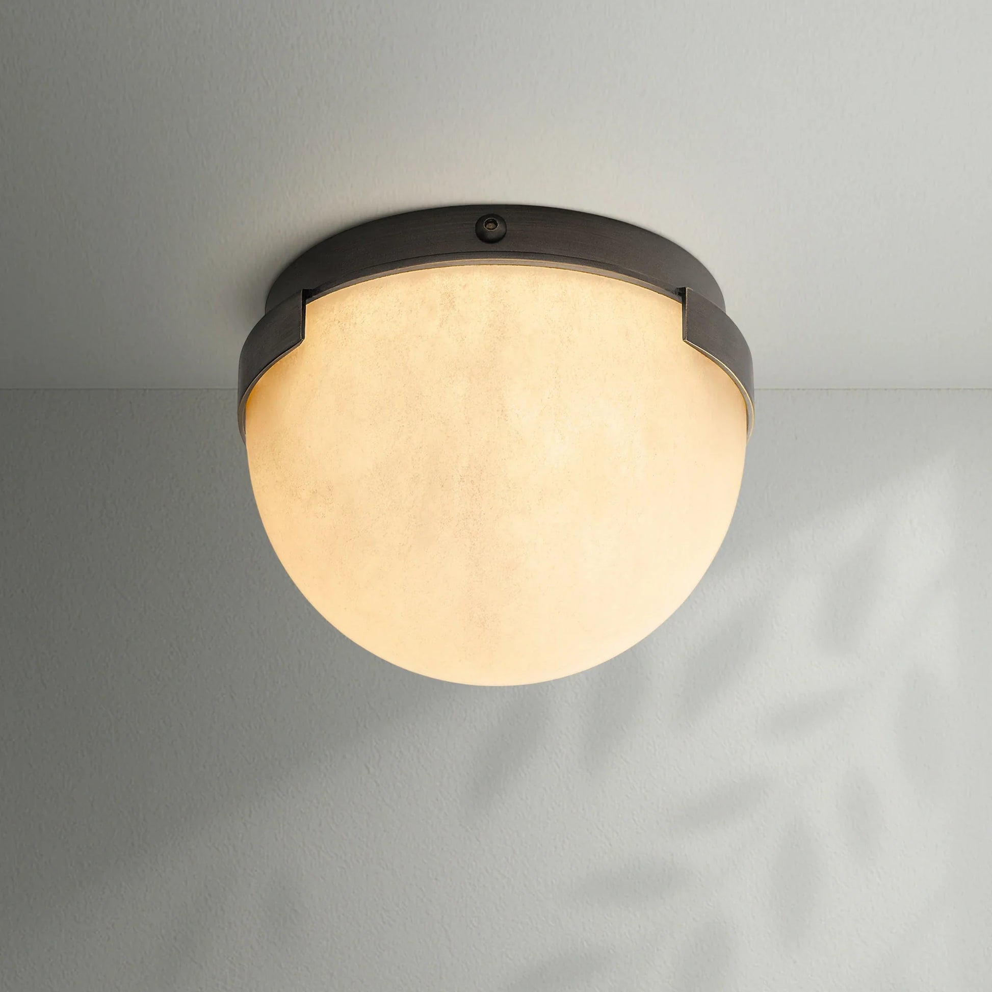 A round shade of richly figured alabaster lends a refined sensibility to our fixture, inspired by midcentury Italian design. Light delivers a warm glow as it passes through the translucent stone, supported by its restrained metal armature.