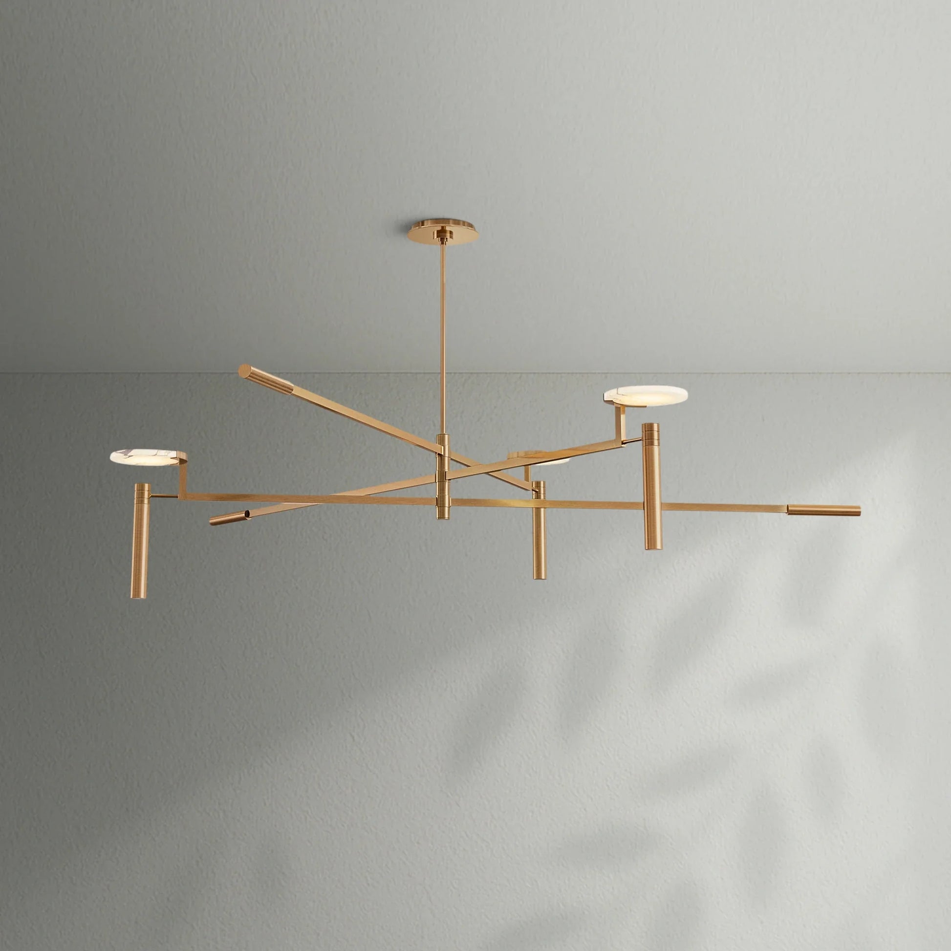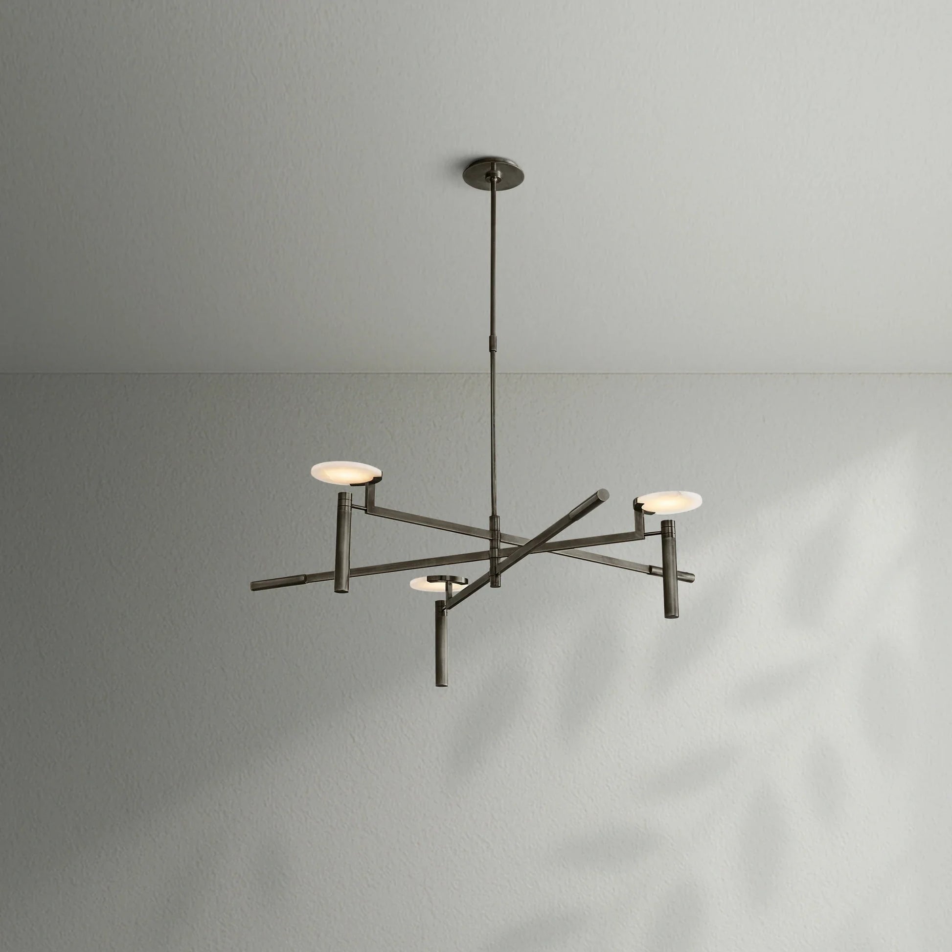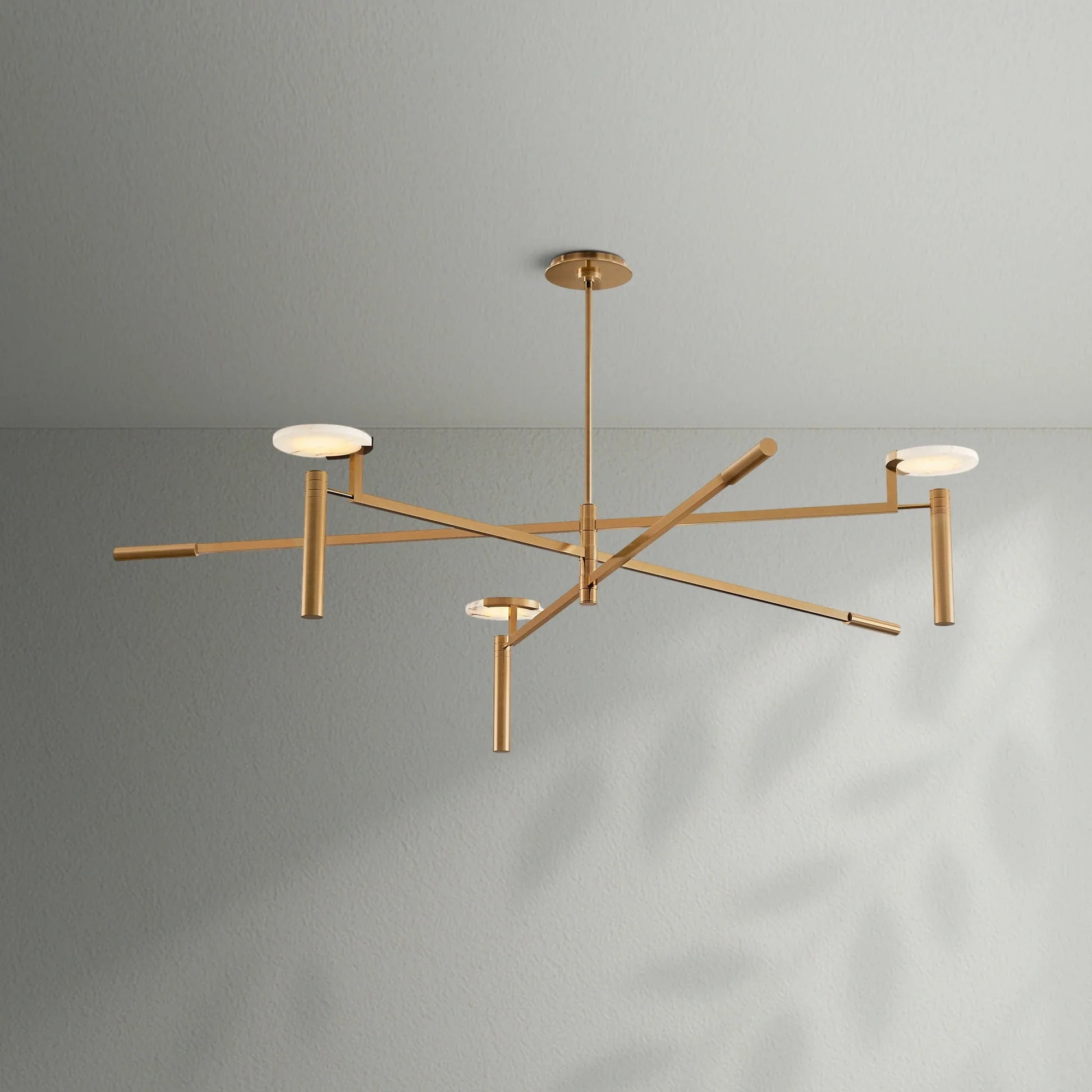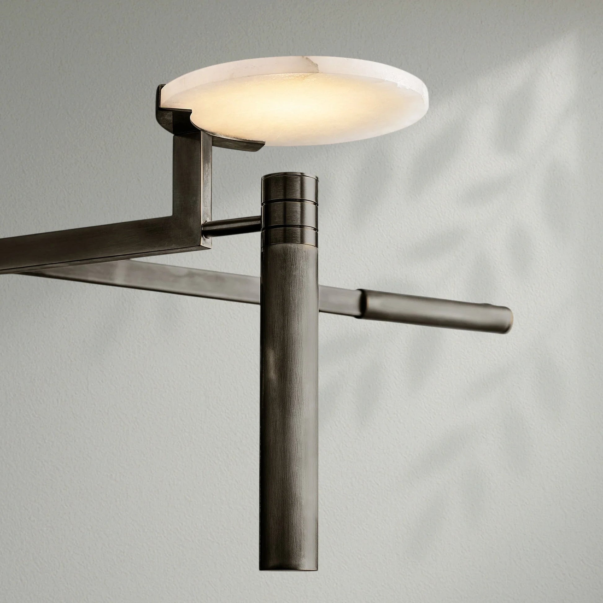 Rich, natural alabaster lends a refined sensibility to the Mélange collection, inspired by midcentury Italian design. The three slender alabaster discs appear to float above a restrained brass armature. Light delivers a warm glow as it passes through the translucent stone.