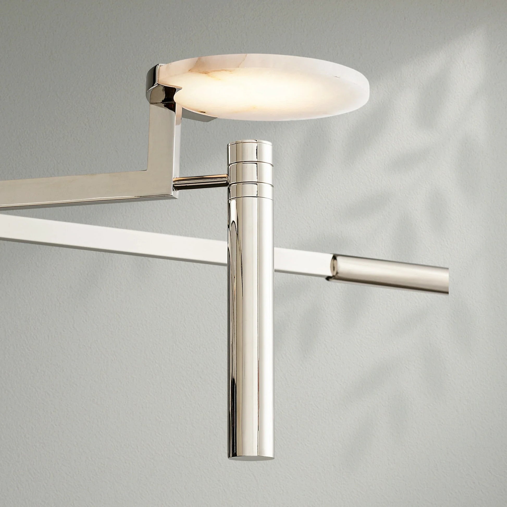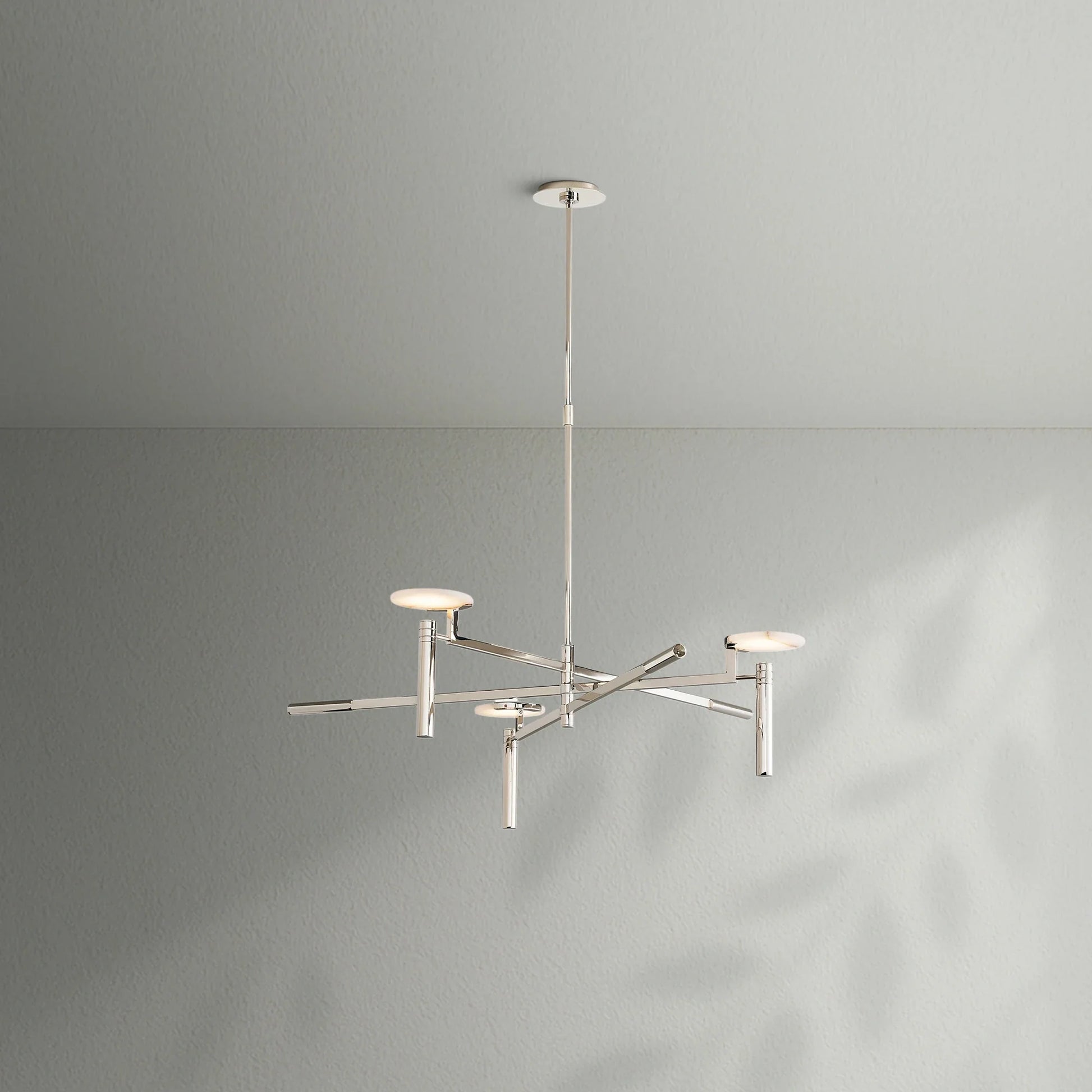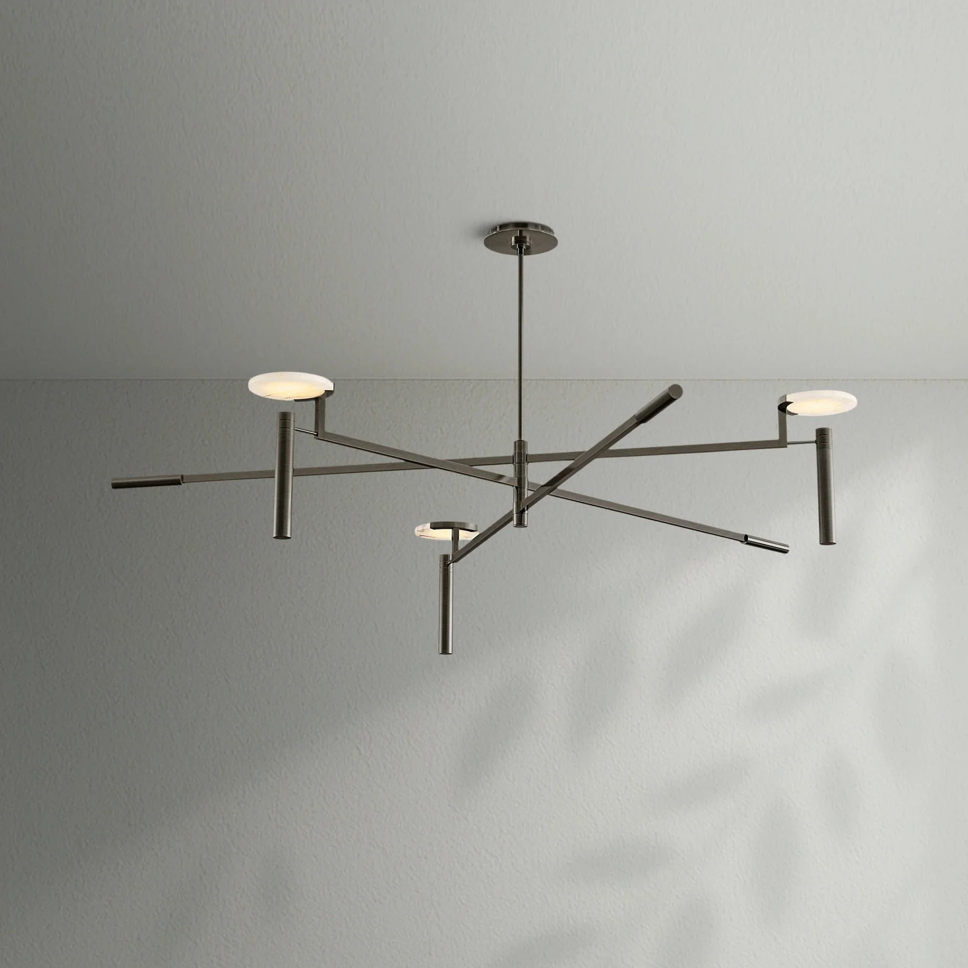 Rich, natural alabaster lends a refined sensibility to the Mélange collection, inspired by midcentury Italian design. The three slender alabaster discs appear to float above a restrained brass armature. Light delivers a warm glow as it passes through the translucent stone.