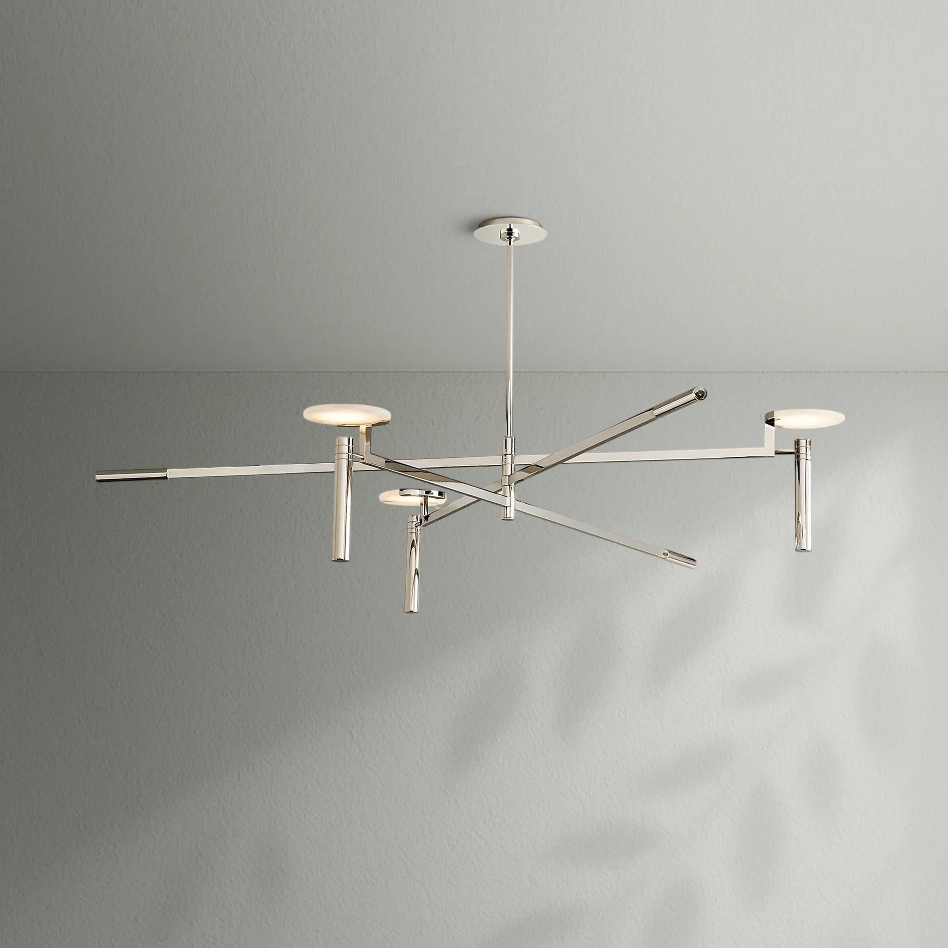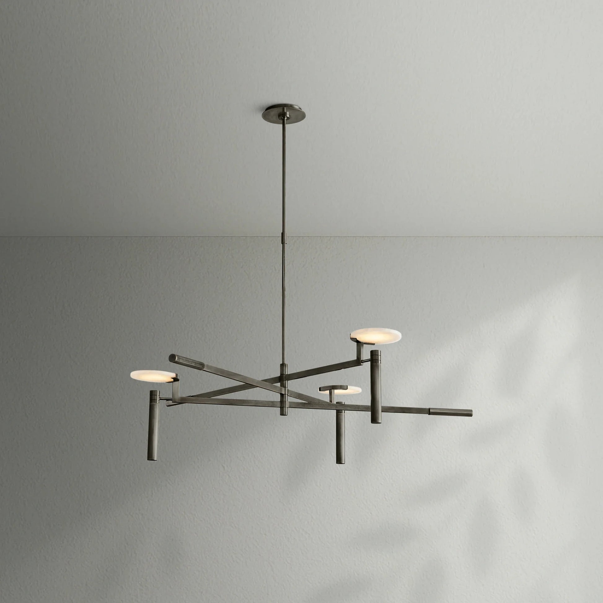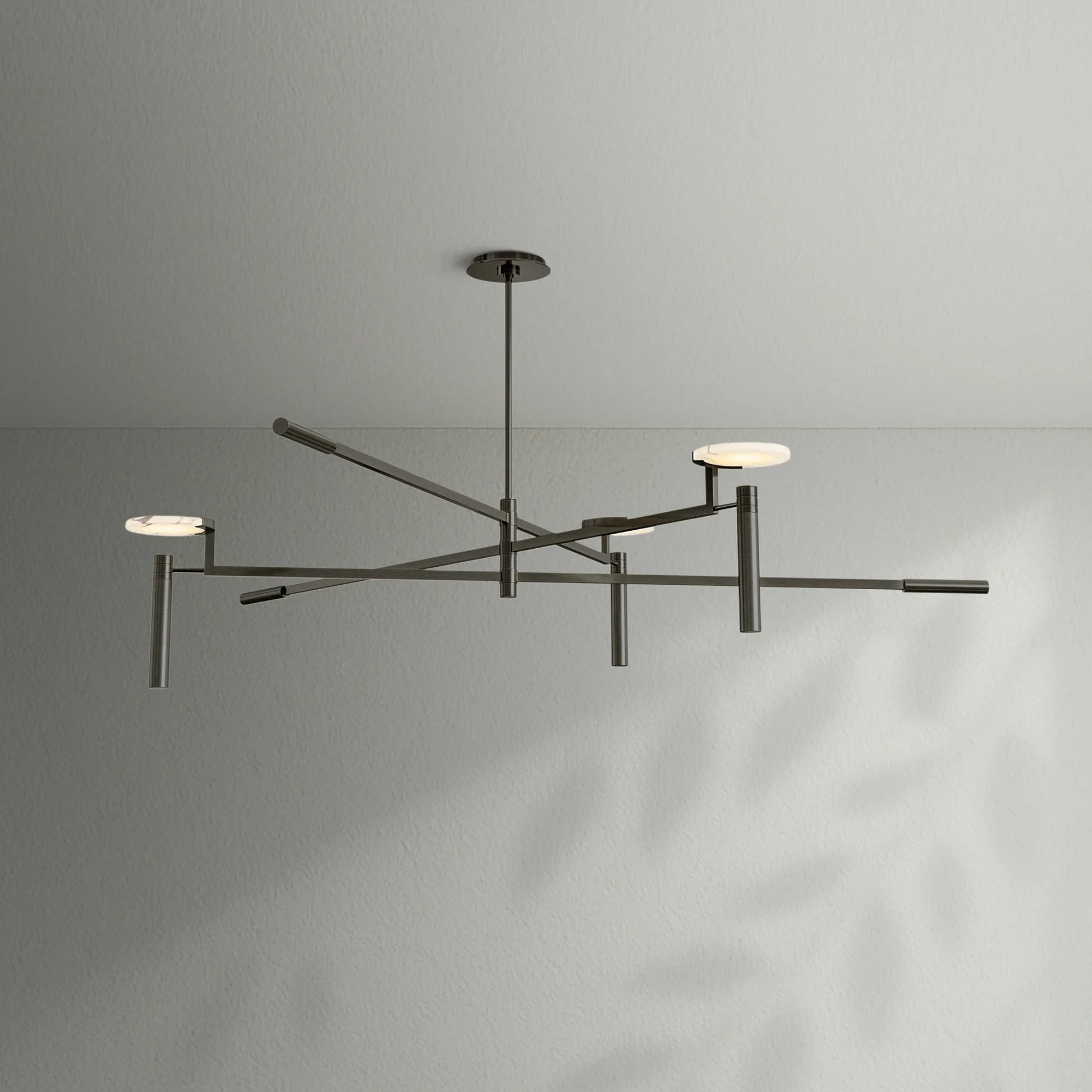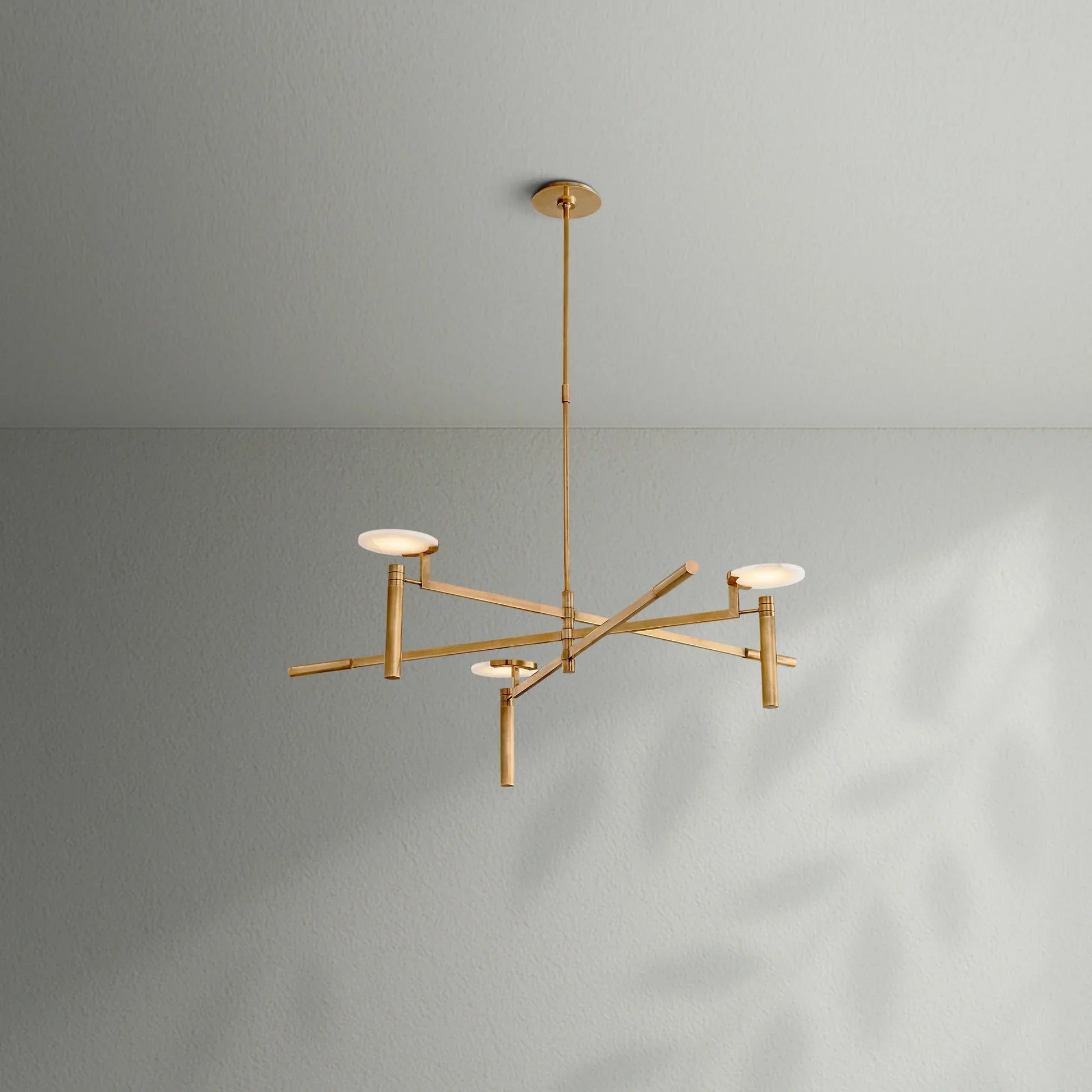 Rich, natural alabaster lends a refined sensibility to the Mélange collection, inspired by midcentury Italian design. The three slender alabaster discs appear to float above a restrained brass armature. Light delivers a warm glow as it passes through the translucent stone.