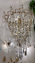This crystal chandelier, using clear light bubble droplet pendant, light effect refraction radiant, with all-brass branch modeling, lamp branch modeling exquisite, natural and realistic, uniform force, dense all-brass branches and clear light droplet pendant layer by layer formed by the continuous accumulation of the pyramid. The resonance of art and life is given to the artistic mood of the space through the concise lines.