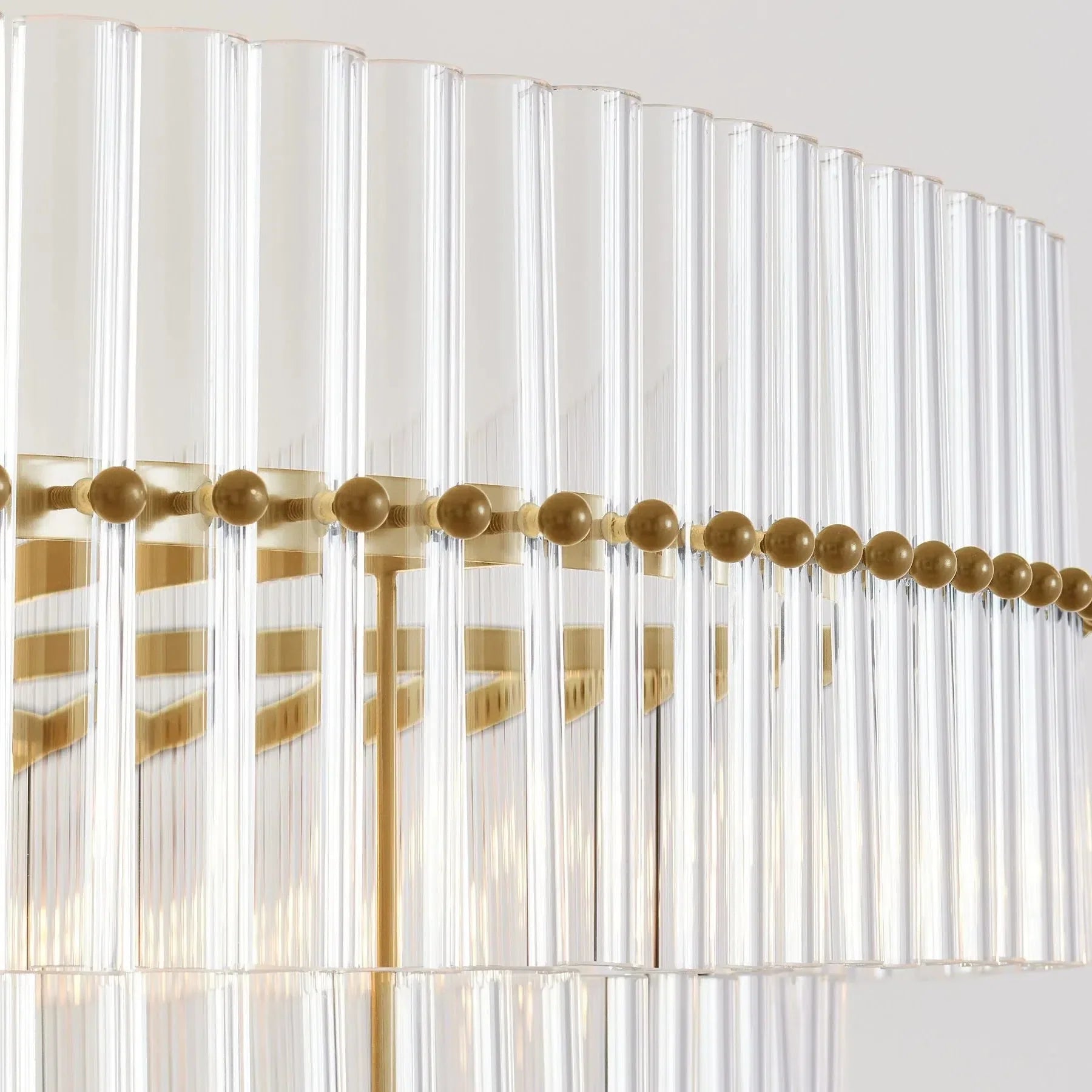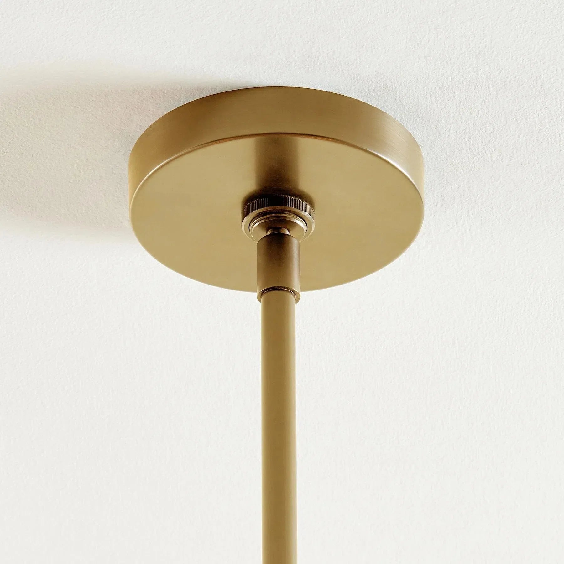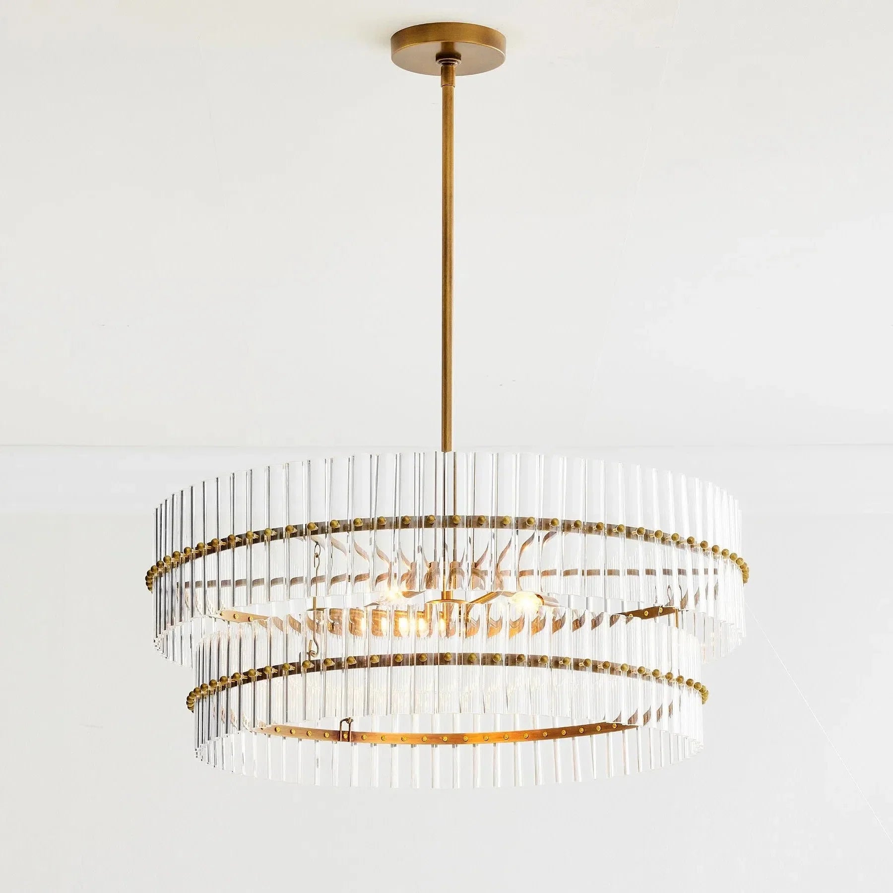 - Crafted from iron, crystals and blown glass with a Tumbled Brass finish.