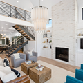 Besides the general rule that the chandelier’s bottom should be at least 7 and a half feet away from the floor. For two stories, what you also need to consider is how will it look from the second floor. In general, staircase chandeliers will be a good choice for space. In term of placing, below are two commonly seen guidance: