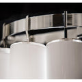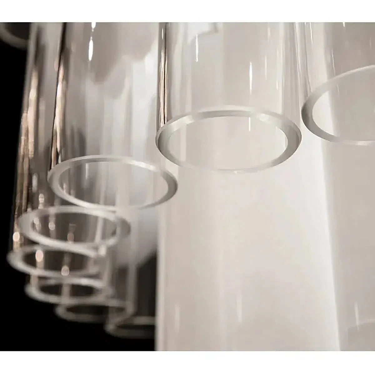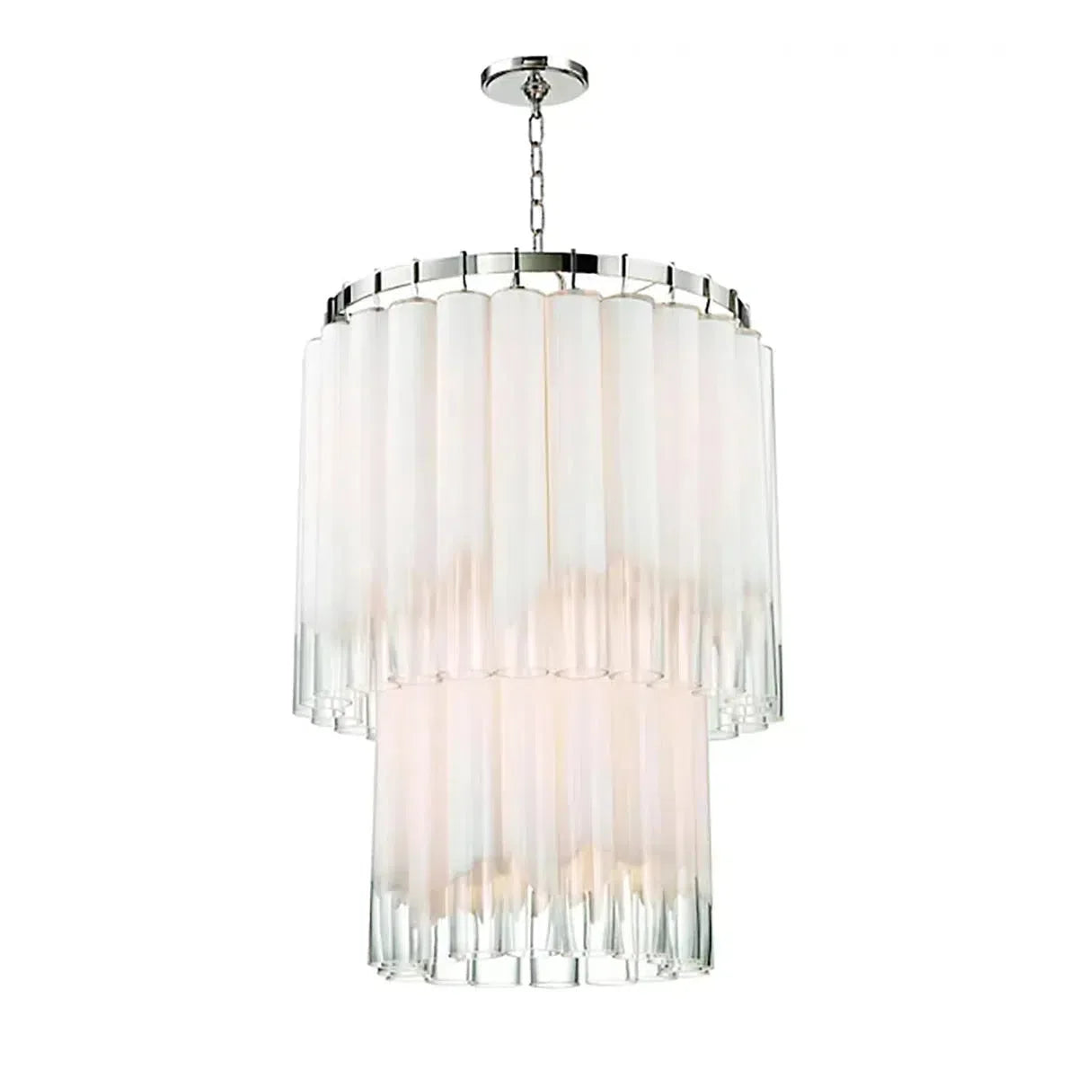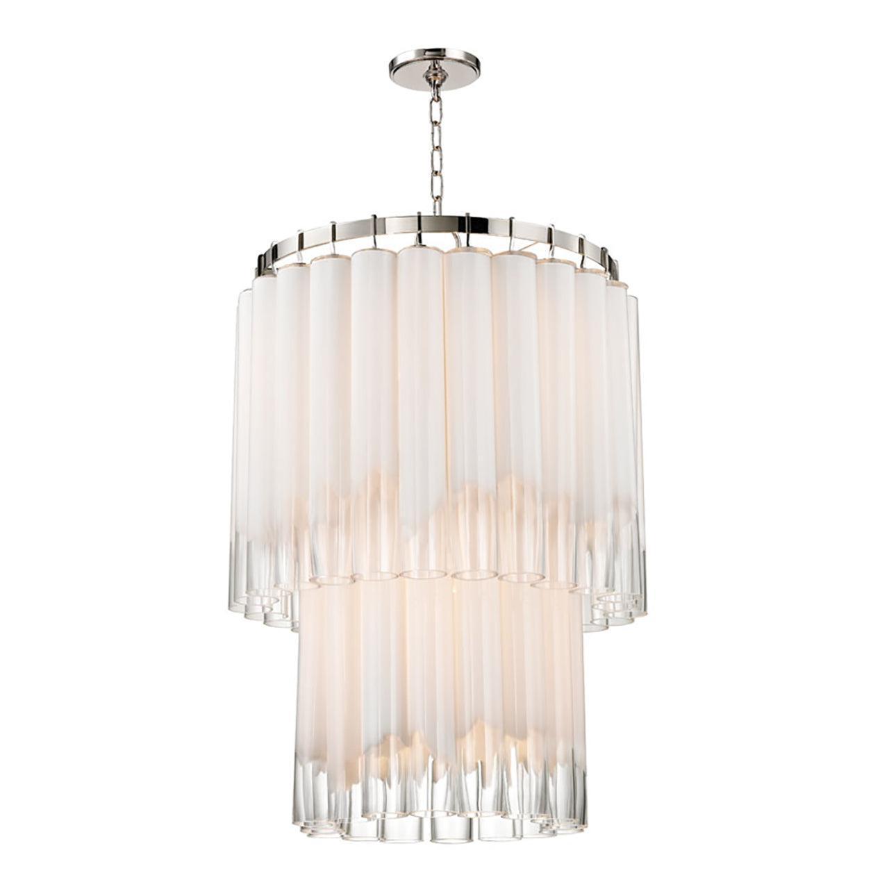 Each of the glass tubes in the Morna chandelier is imperfect, frosted opalescent at the top and perfectly clear at the bottom. The sheen of the outer layer gives them a glossy sheen that creates a mysterious and seductive diffused effect as light streams from candelabra bulbs perpendicular to each layer of glass tubes.Morna adds a 21st-century twist to a modernist classic.