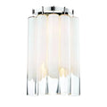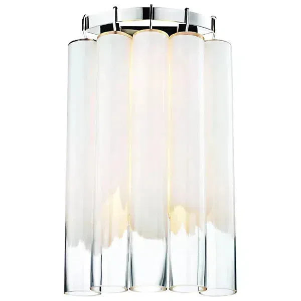 Each of the glass tubes in the Morna chandelier is imperfect, frosted opalescent at the top and perfectly clear at the bottom. The sheen of the outer layer gives them a glossy sheen that creates a mysterious and seductive diffused effect as light streams from candelabra bulbs perpendicular to each layer of glass tubes.Morna adds a 21st-century twist to a modernist classic.