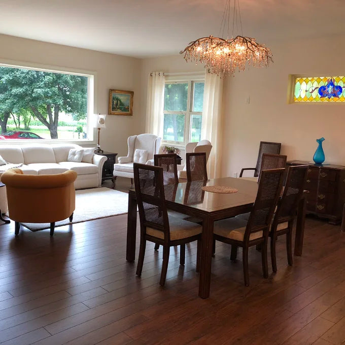 If you are hanging the chandelier above your dining table or kitchen island, you can also decide the size of the chandeliers based on the size of your dining table or kitchen island. We generally recommend that the length or diameter of the chandelier should be between 1/2 and 3/4 of the length of the dining table or kitchen island.