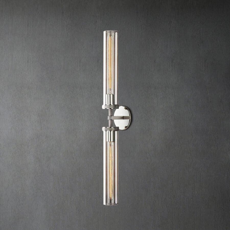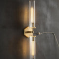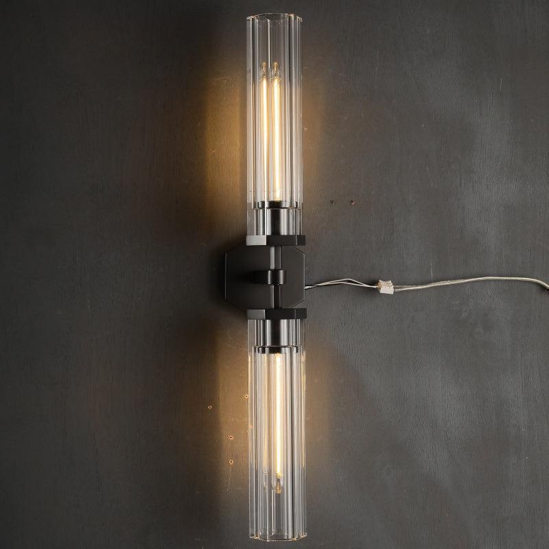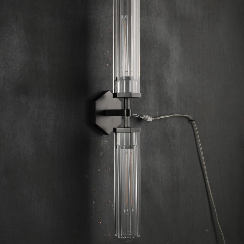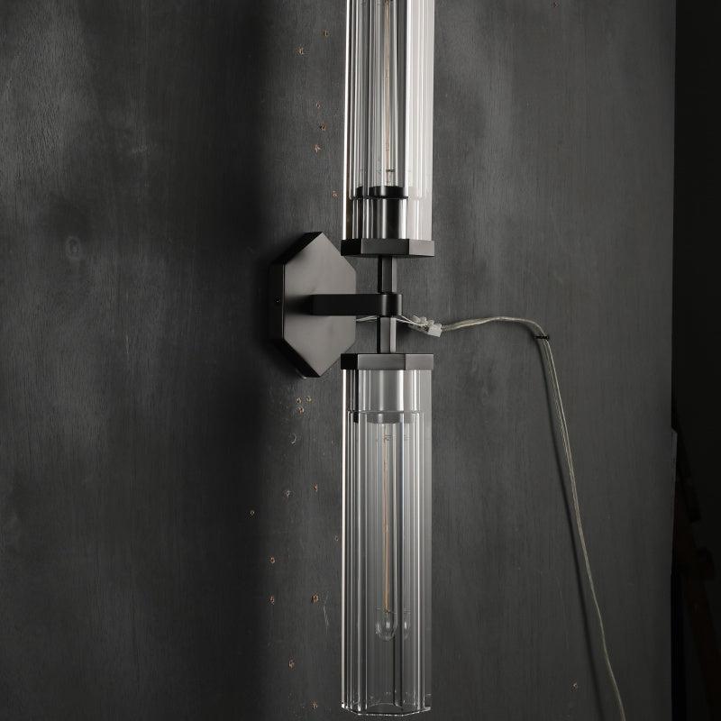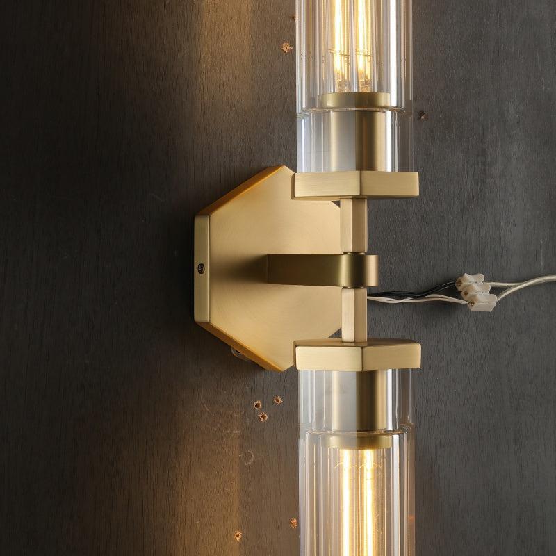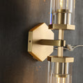 Noah series made of solid brass with a K9 crystal hexagonal shade. The designer has incorporated hexagonal elements in the backplate to echo the shape of the crystal lampshade, adding an industrial detail that provides a subtle decorative effect.