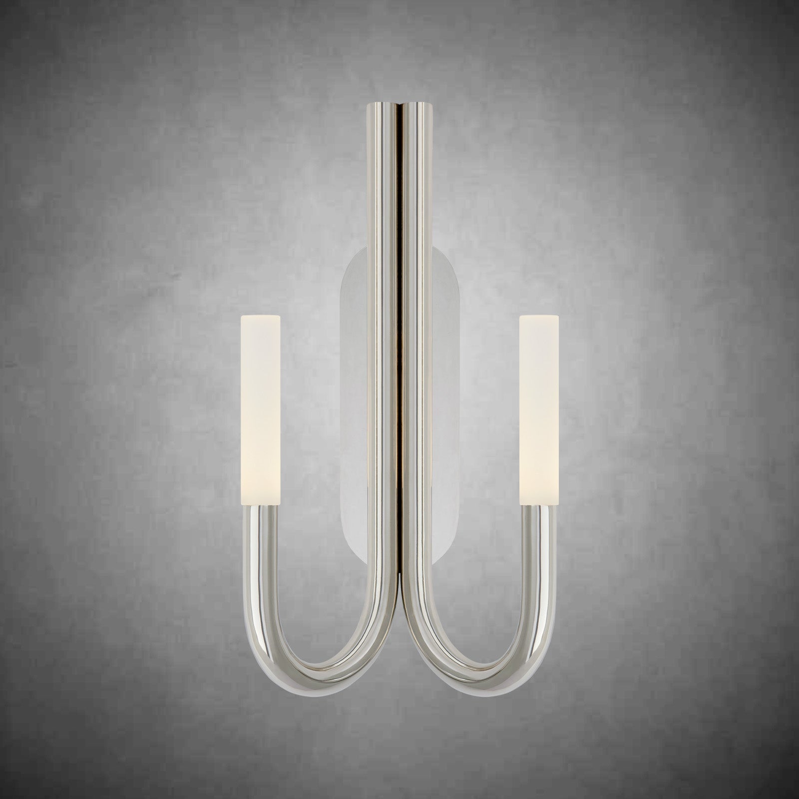 Inspired by minimalist midcentury Italian design, our contemporary interpretation of the chandelier offers reductionist form in a striking silhouette. Spare and understated, Rousseau’s gracefully upraised arms hold aloft an etched glass shade fitted with an integrated LED bulb. When lit, the fixture emits a warm, filtered glow.
