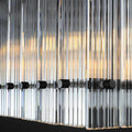 | This collection of fixtures features dozens of panels of glass that have been hand-raked into grooves within a sleek metal frame, producing dramatic light play and softly diffused light. The glamor of Italian glass fixtures from the 1960s is revisited. |