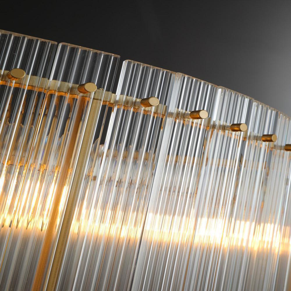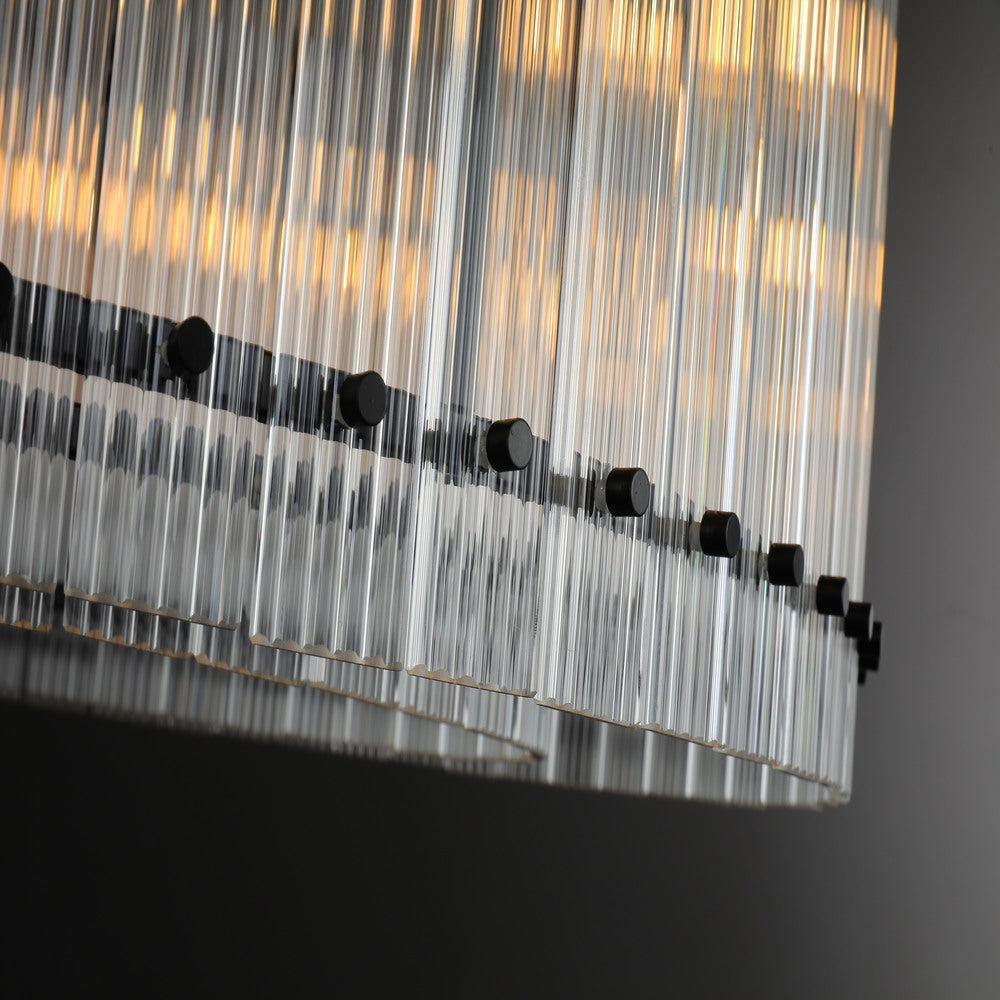 | This collection of fixtures features dozens of glass panels that have been hand-raked into grooves within a sleek metal frame, producing dramatic light play and softly diffused light. The glamour of Italian glass fixtures from the 1960s is revisited. |