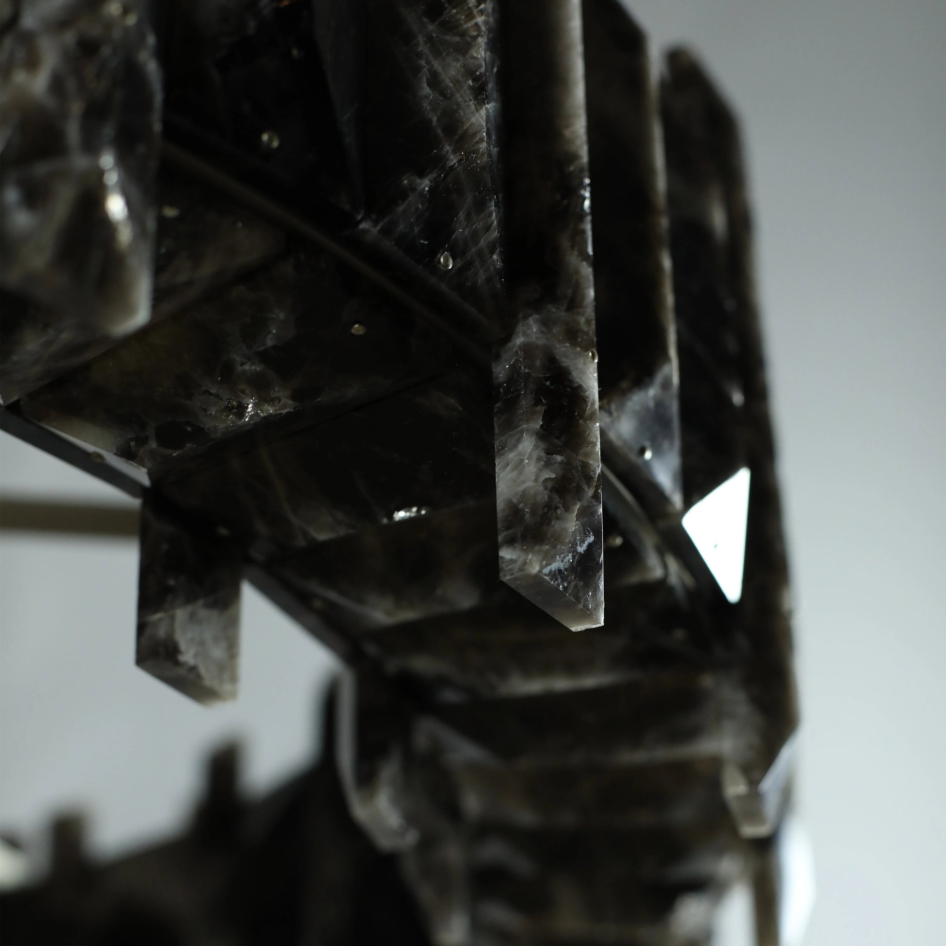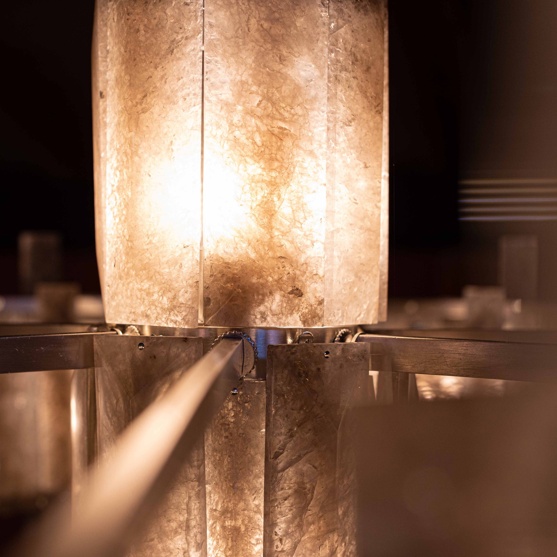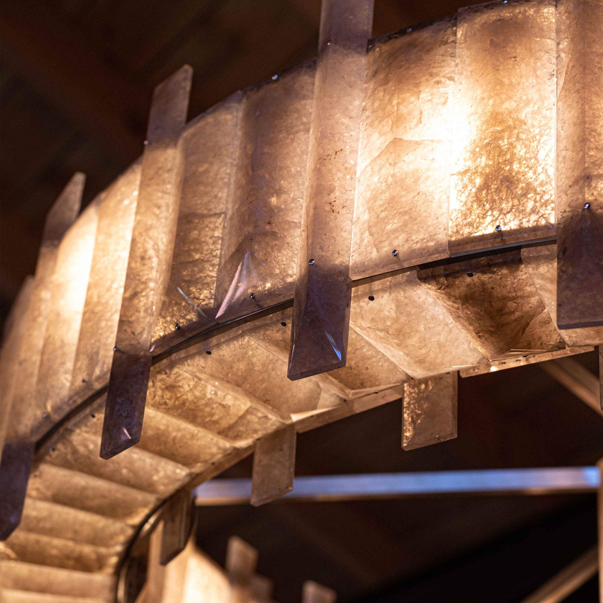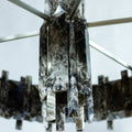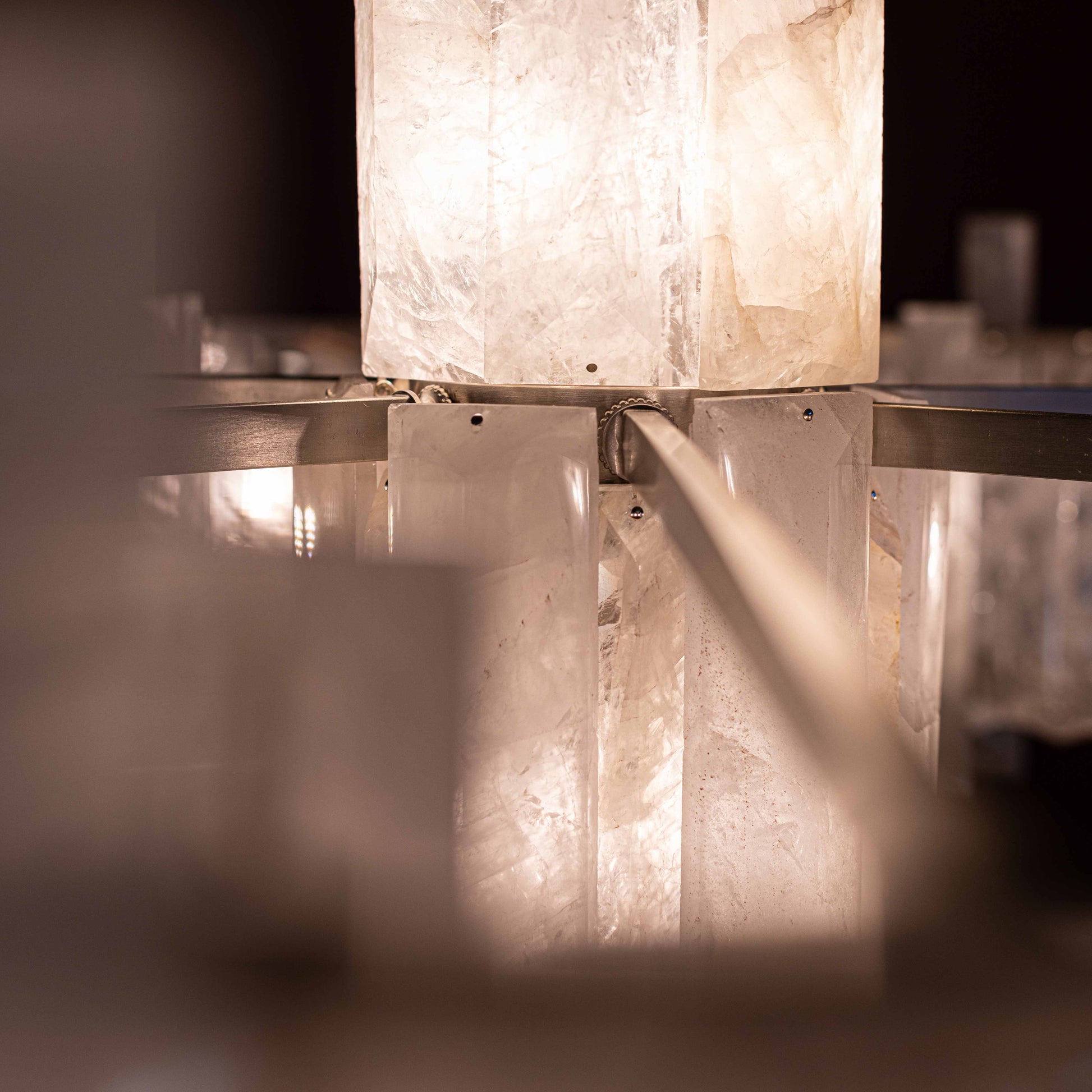 In the grand tradition of semi-precious stones, Mathieu shows a particularly innovative example with a very seductive aesthetic. This collection’s theme, interstellar, recounts the history of the planets; a shuttle covered in rock crystal allegedly stole light from the stars to light our sleepless nights. One can also imagine the mechanical gears and industrial design that inspired the art of the twentieth and twenty-first centuries chandelier becoming the signature of Mathieu Lustrerie. It was inevitable one should be acquired by the Mobilier National Français for its early twenty-first century decorative art collection.