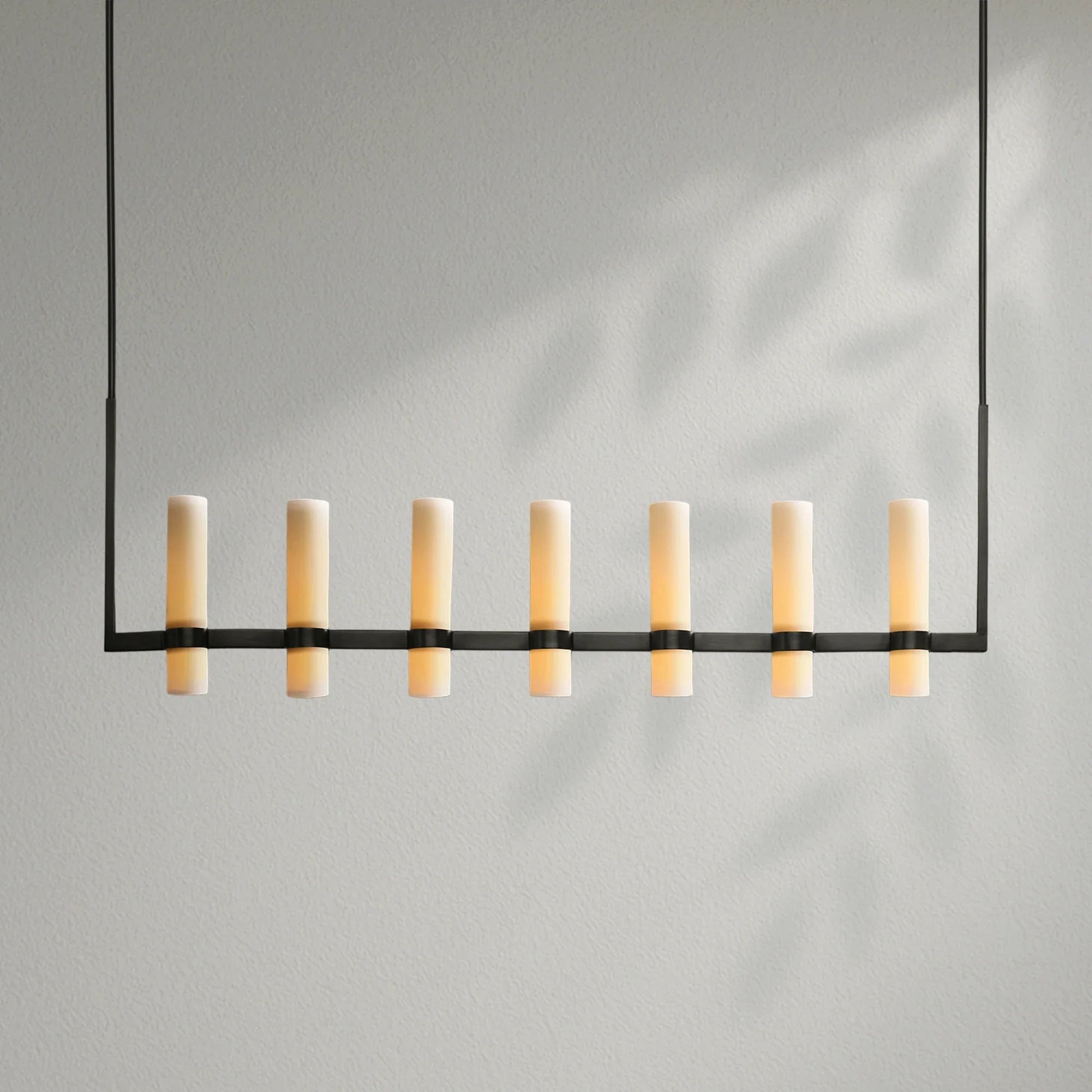 Art Deco forms are reimagined with a modern minimalist sensibility in this collection from renowned lighting. Crafted of solid steel, unadorned metal bands hold the slender glass cylinders in place, in a state of perfect equipoise. Within each, Edison bulbs glow with the warmth of candlelight.