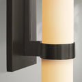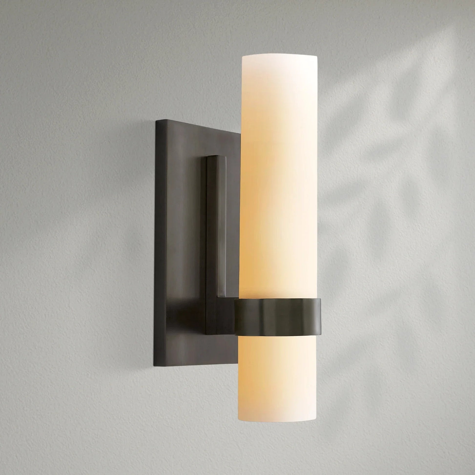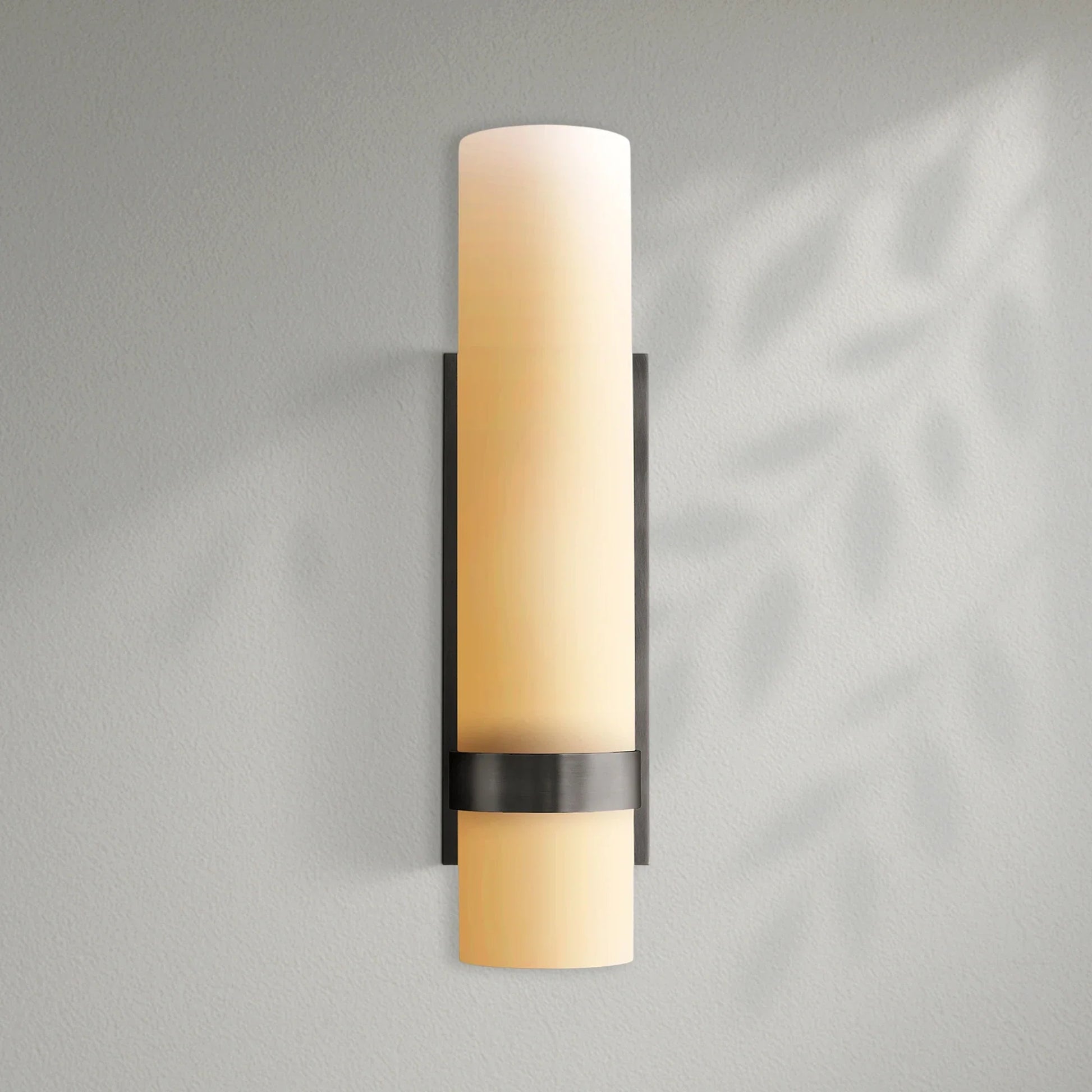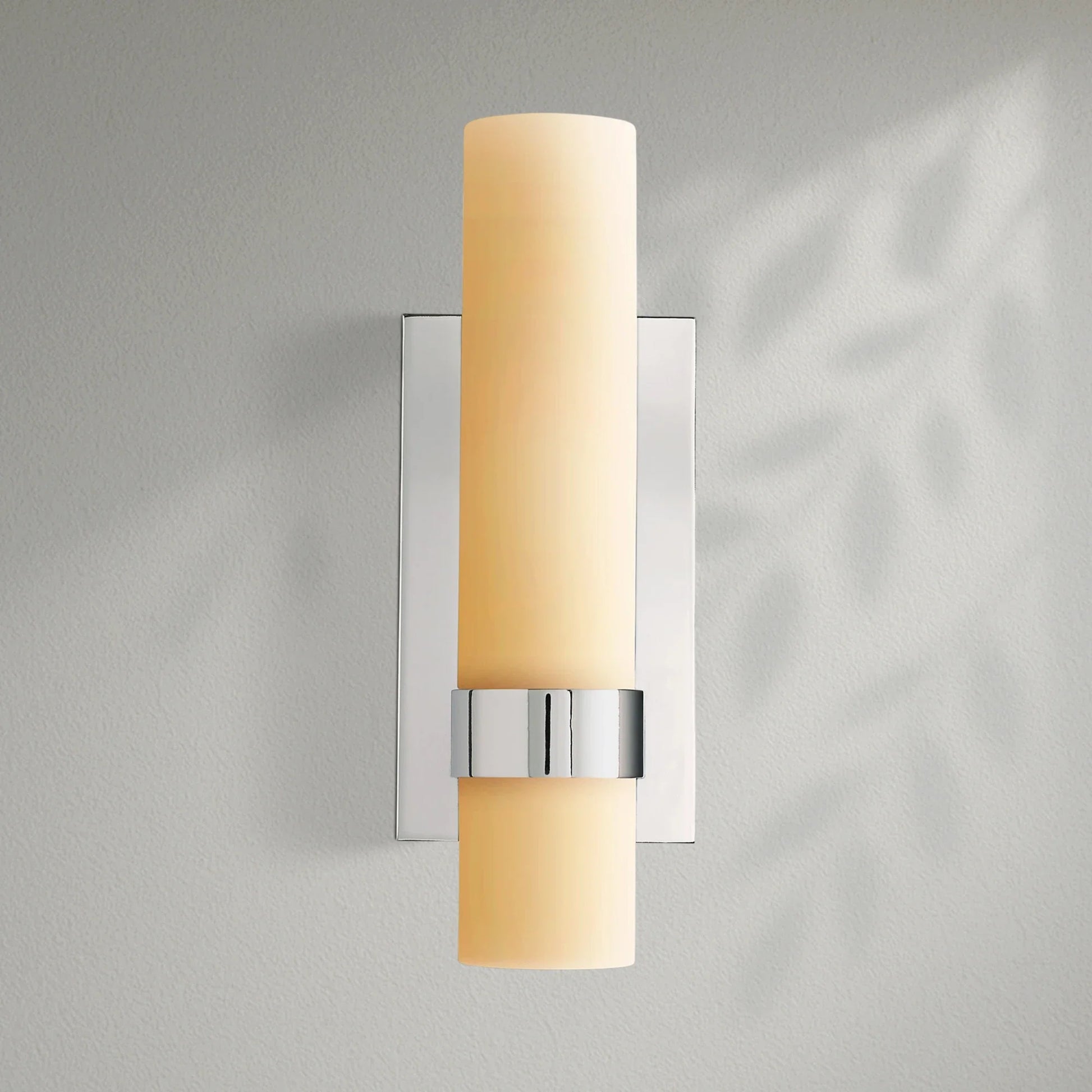 Art Deco forms are reimagined with a modern minimalist sensibility in this collection from renowned lighting designer. Crafted of solid steel, unadorned metal bands hold the slender glass cylinders in place, in a state of perfect equipoise. Within each, E