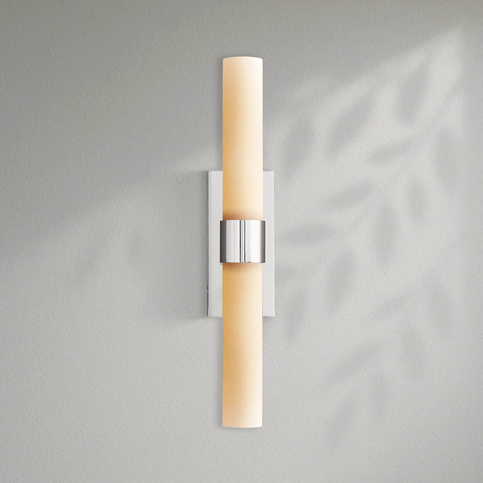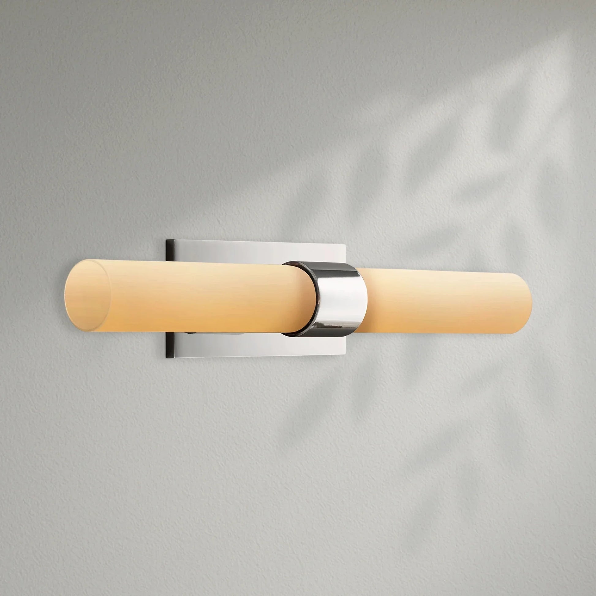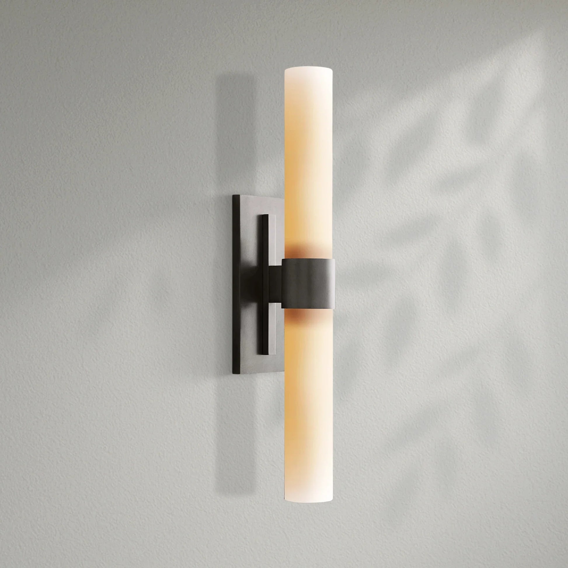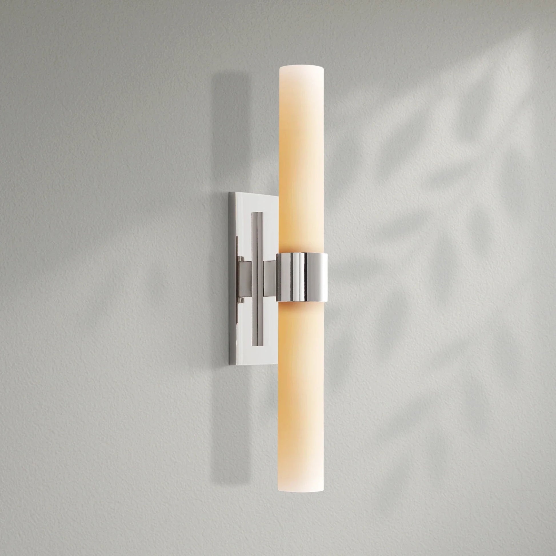 Art Deco forms are reimagined with a modern minimalist sensibility in this collection from renowned lighting designer. Crafted of solid steel, unadorned metal bands hold the slender glass cylinders in place, in a state of perfect equipoise. Within each, Edison bulbs glow with the warmth of candlelight.