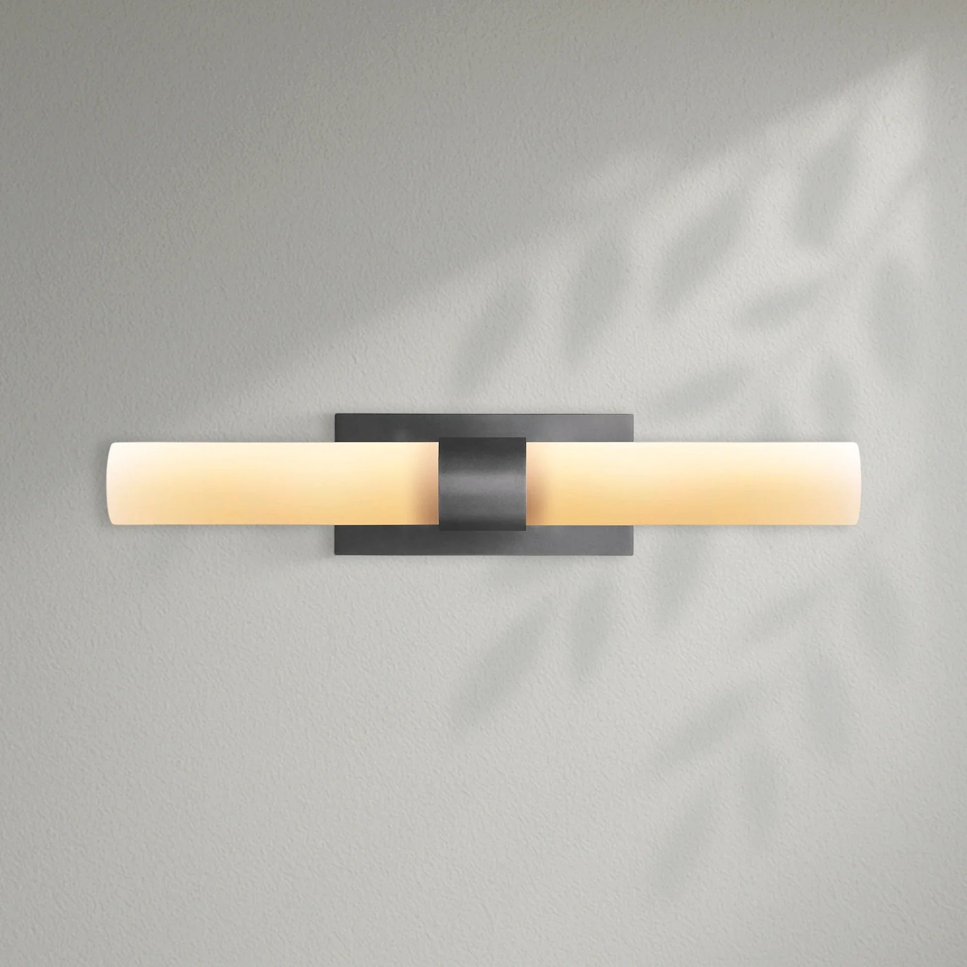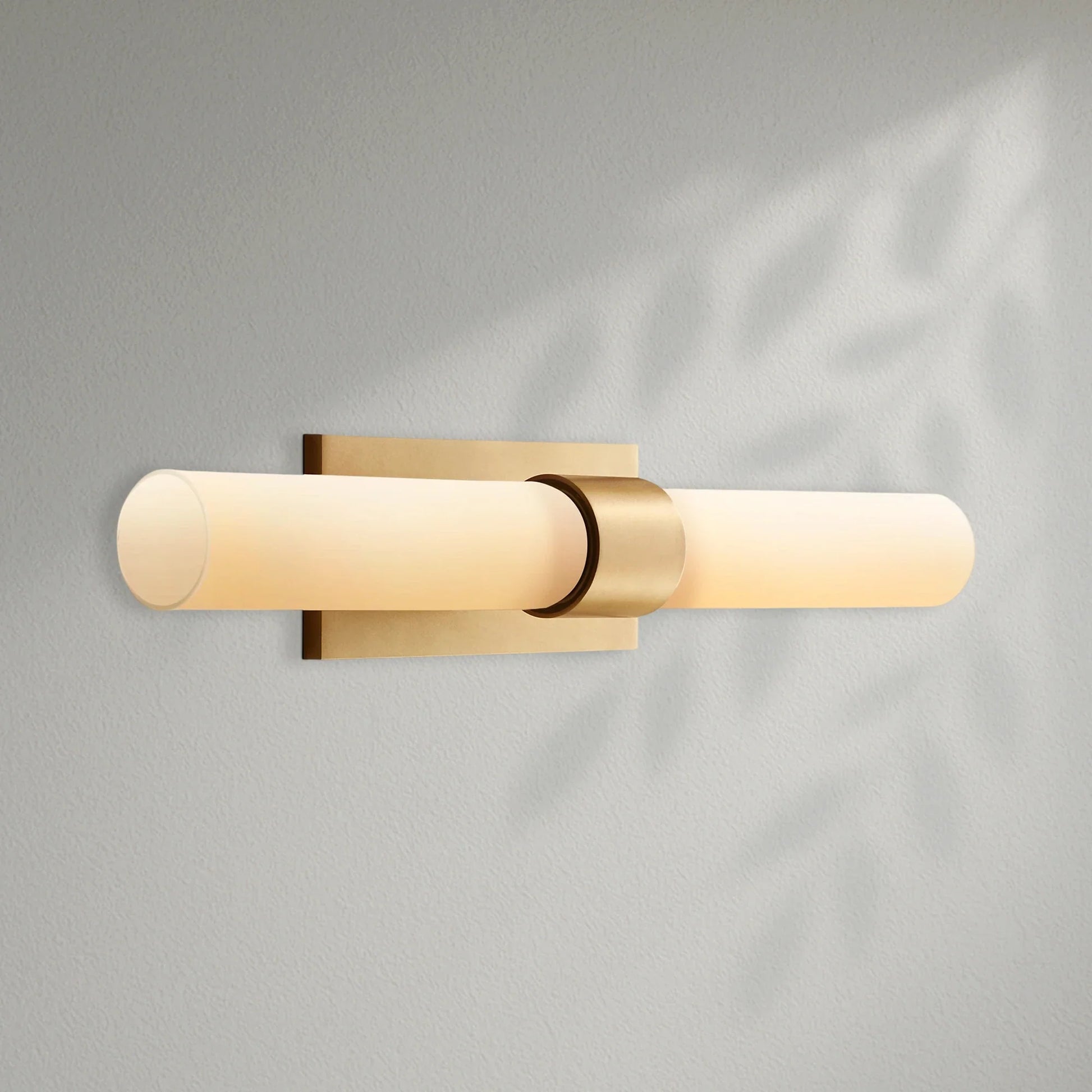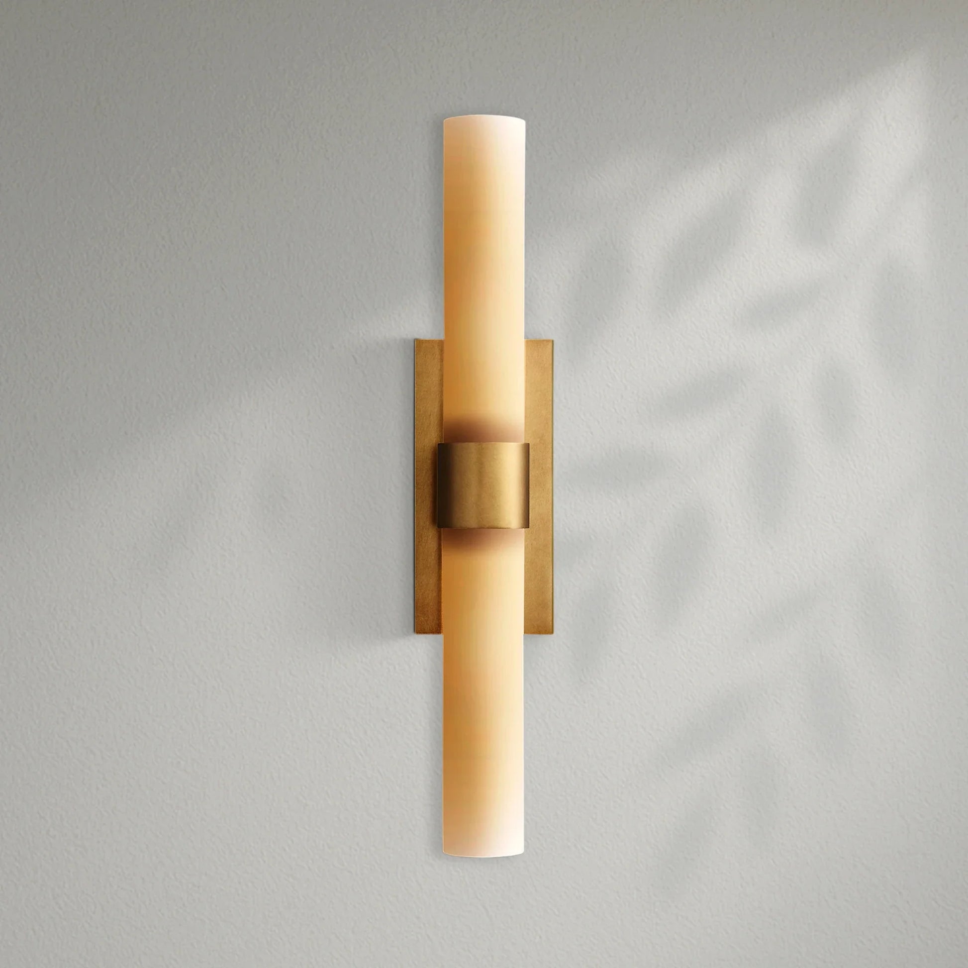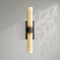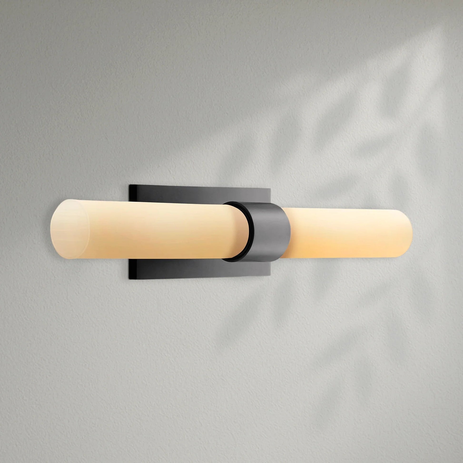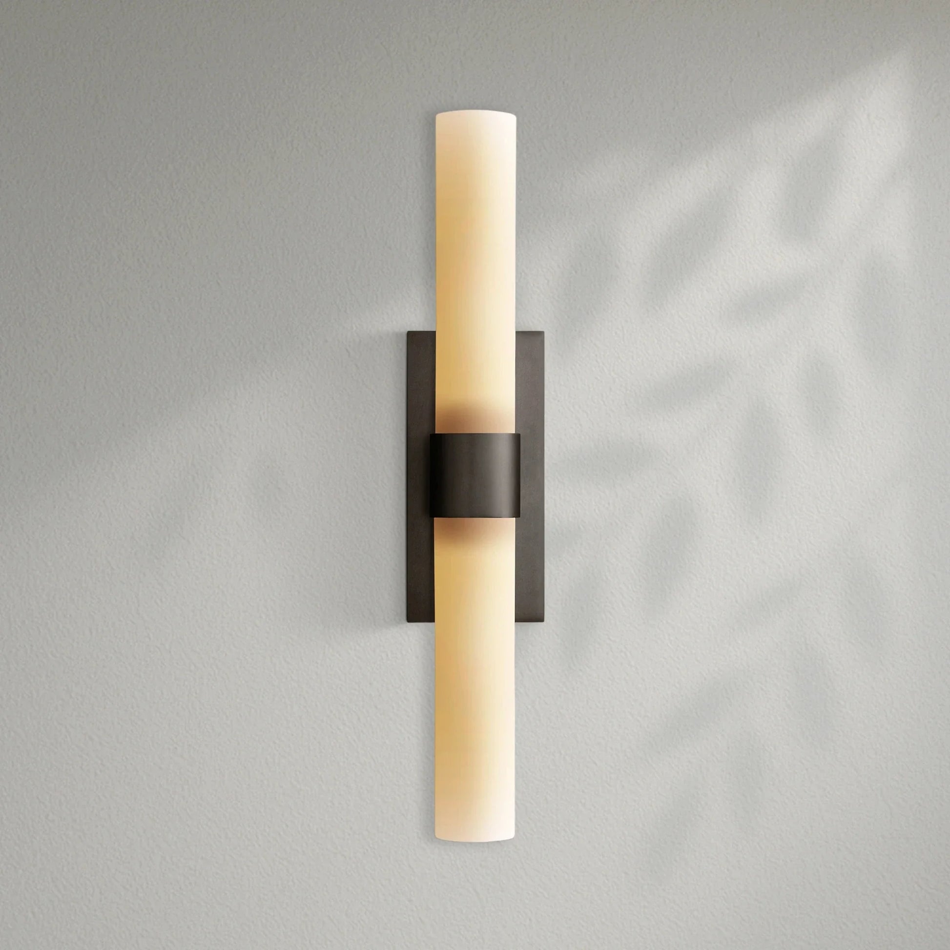 Art Deco forms are reimagined with a modern minimalist sensibility in this collection from renowned lighting designer. Crafted of solid steel, unadorned metal bands hold the slender glass cylinders in place, in a state of perfect equipoise. Within each, Edison bulbs glow with the warmth of candlelight.