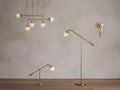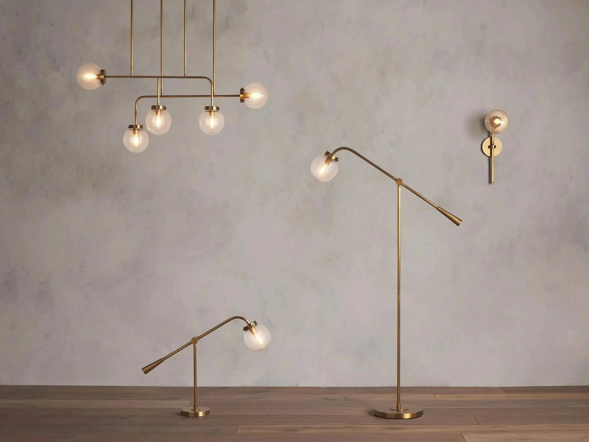 - Crafted from steel with a plated Burnished Brass finish complemented by mouth-blown glass globes with a ribbed texture.