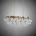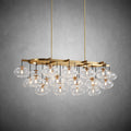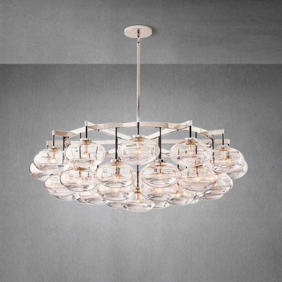 The Cabretle collection of luminaires features hand-blown oval glass shades that appear to be suspended overhead. Supported by industrial metal frames and suspended from black cords, these glass globes combine clean geometric shapes with understated elegance.