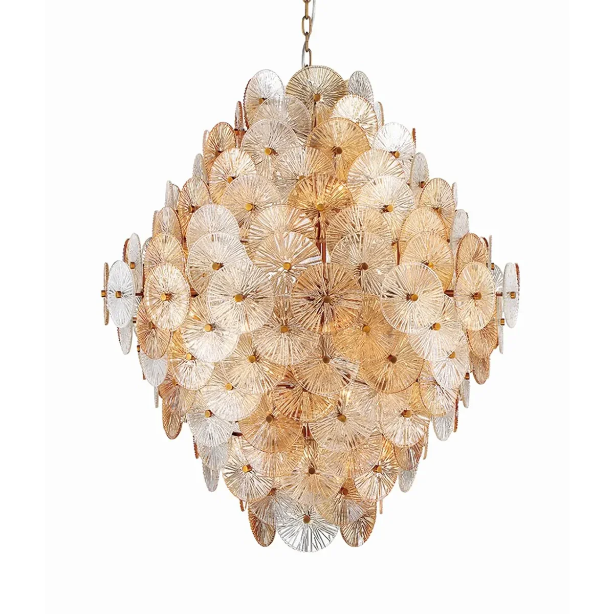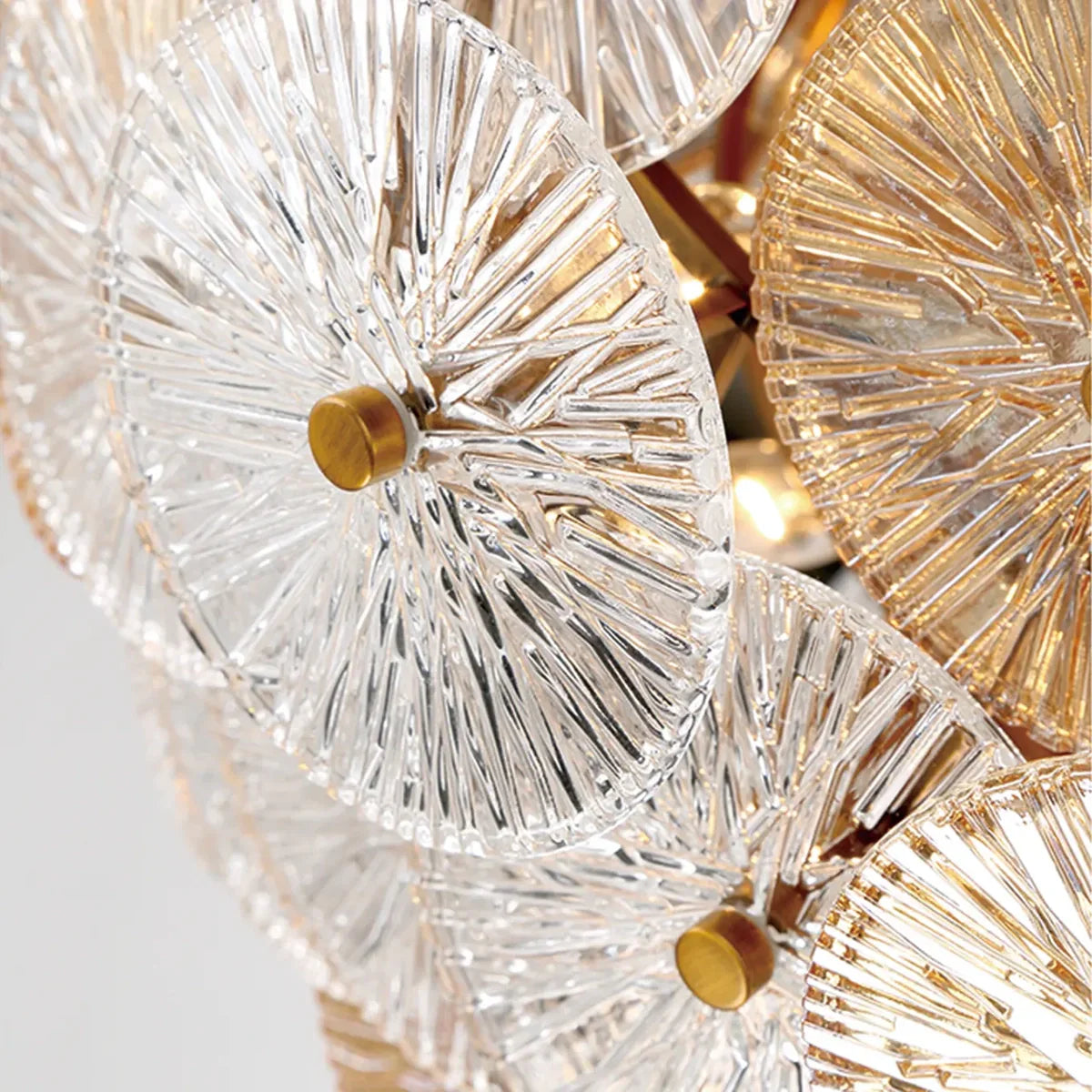 Exemplary glasswork is showcased in the grand, robust detailing of this piece. Handmade pressed ribbed glass imparts uniqueness, while intricate detailing and naturally tinted glass enhance its distinctive characteristics.