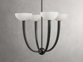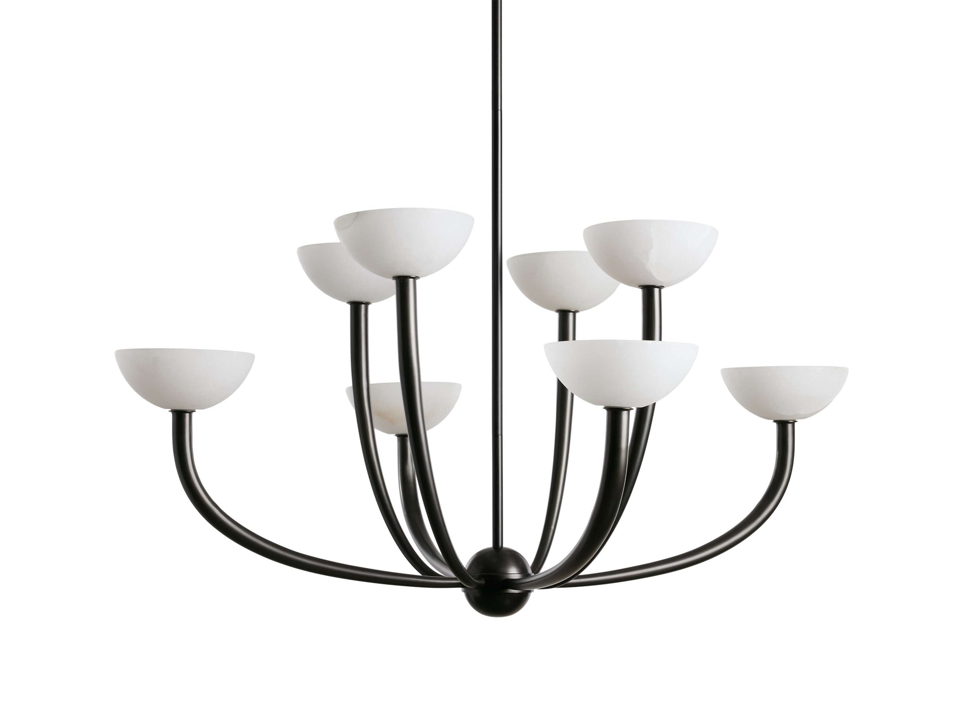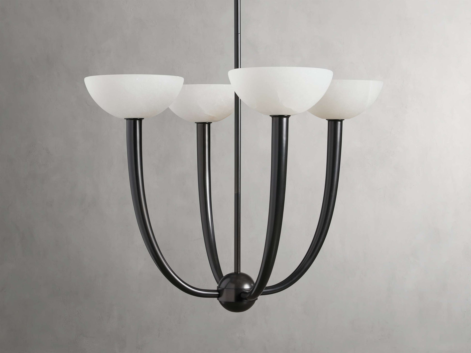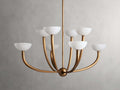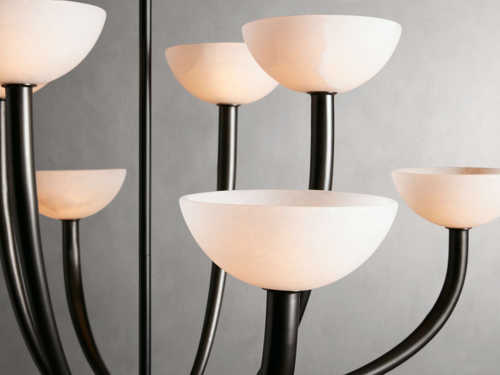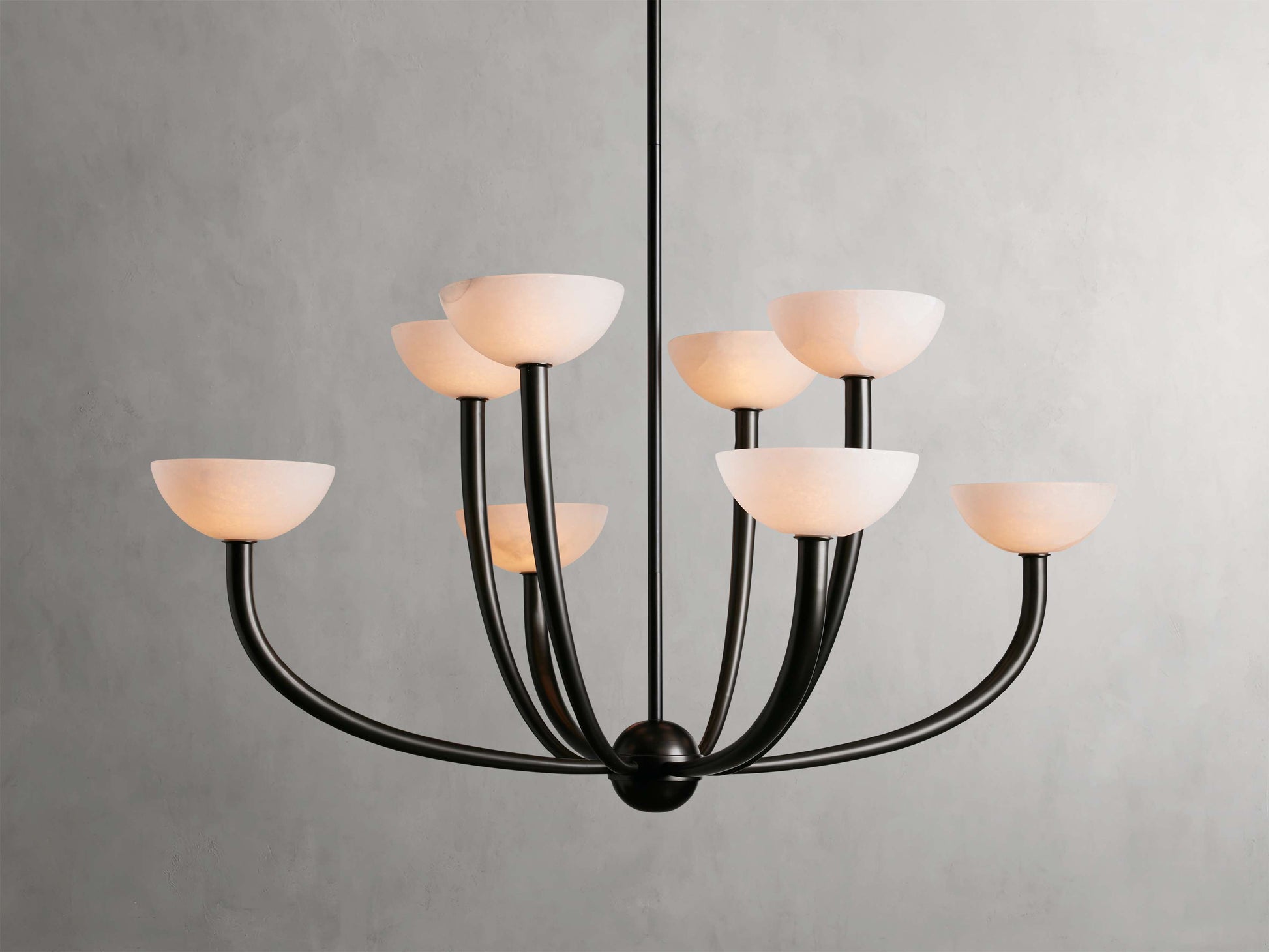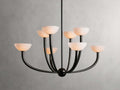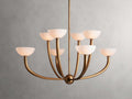 - Crafted from iron with an antique brass or bronze finish and alabaster shades.