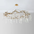 | An eight-light halo of organically formed brass branches dripping with hand-blown glass teardrops will add a dynamic setting in any room. |