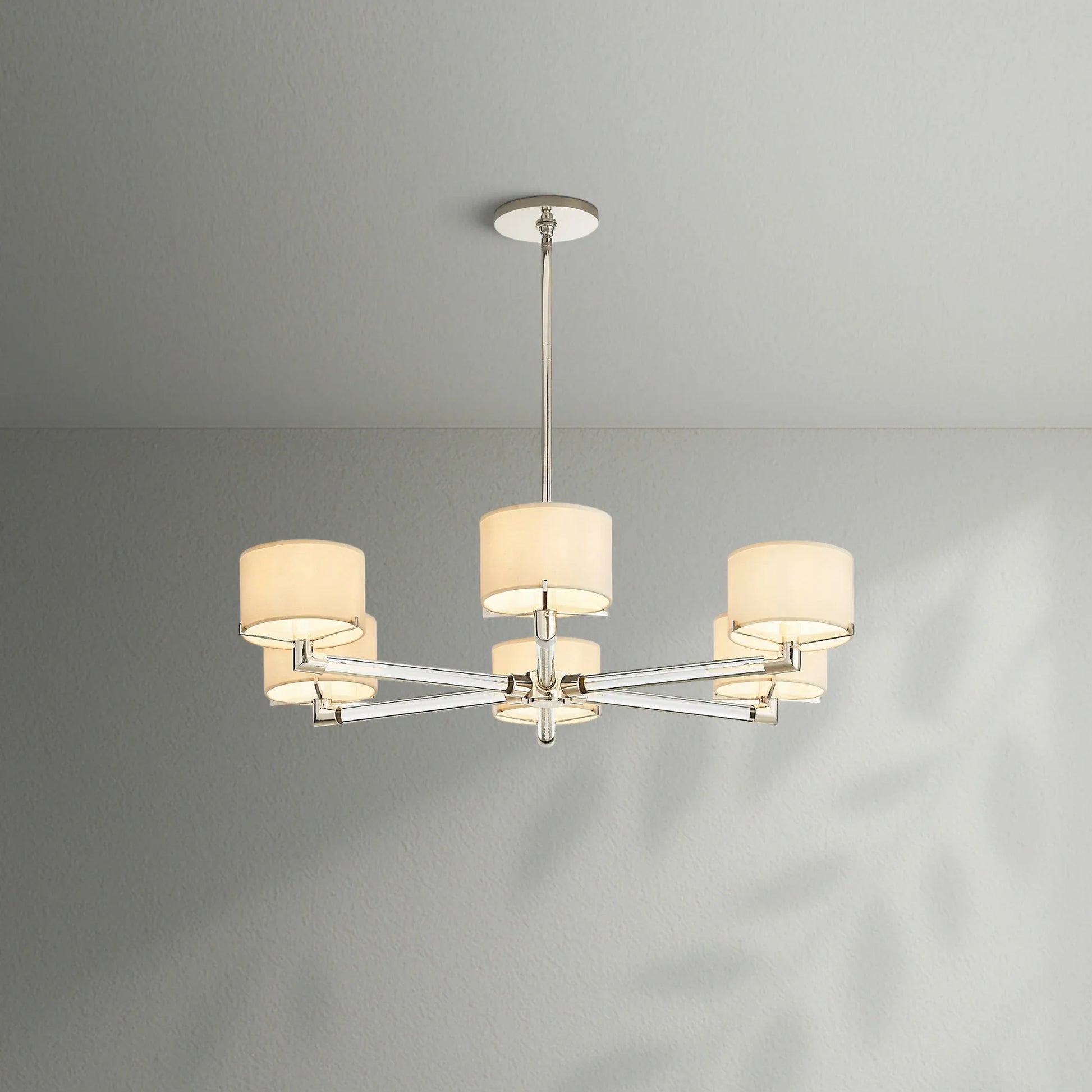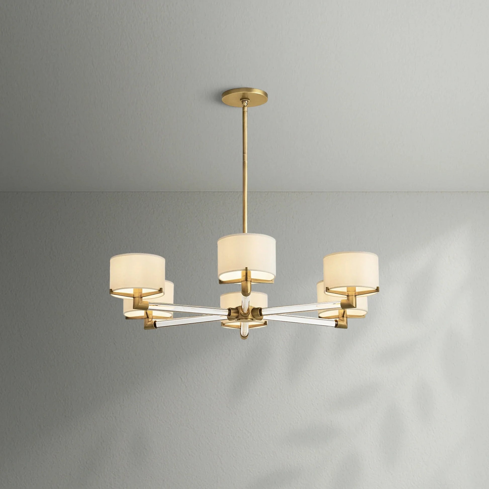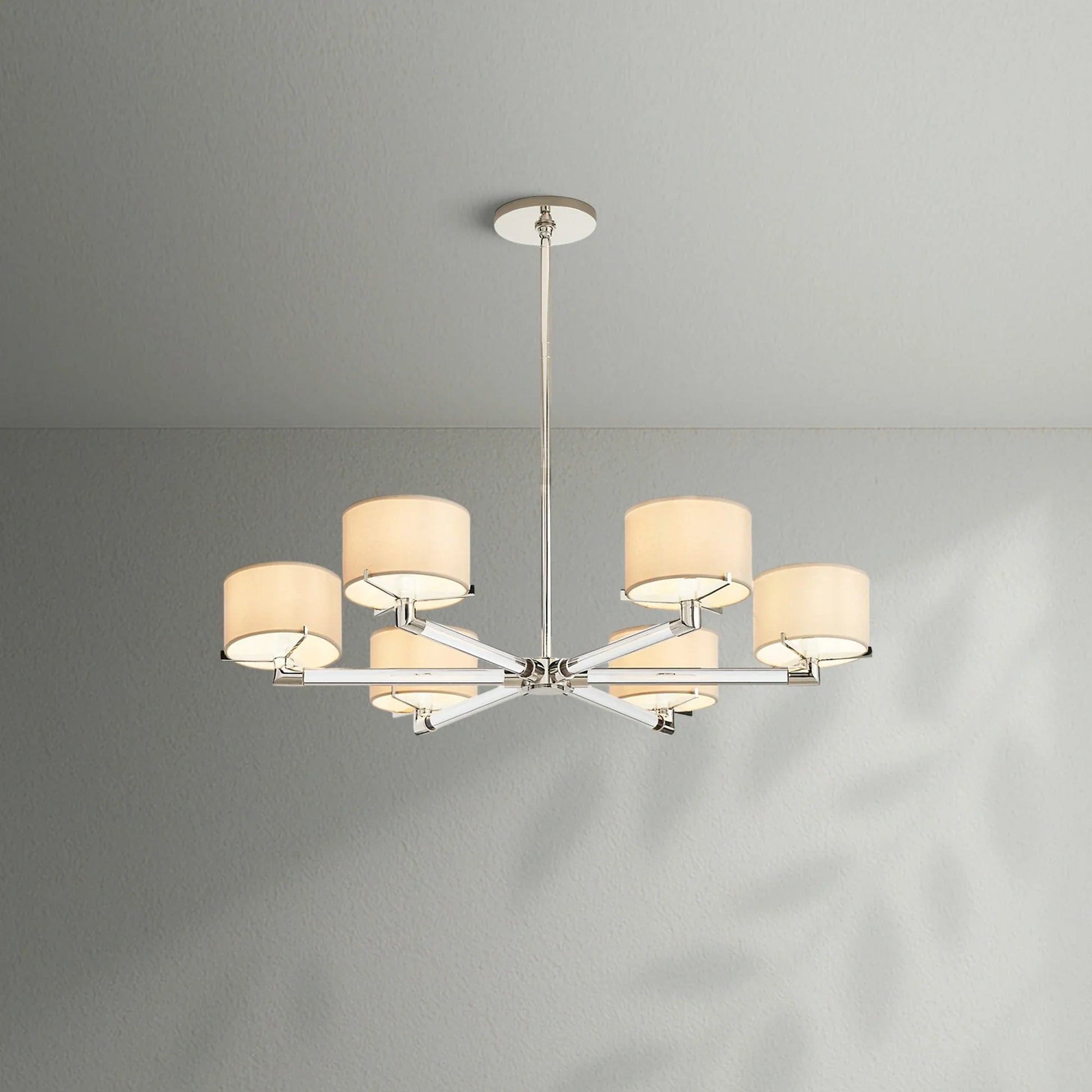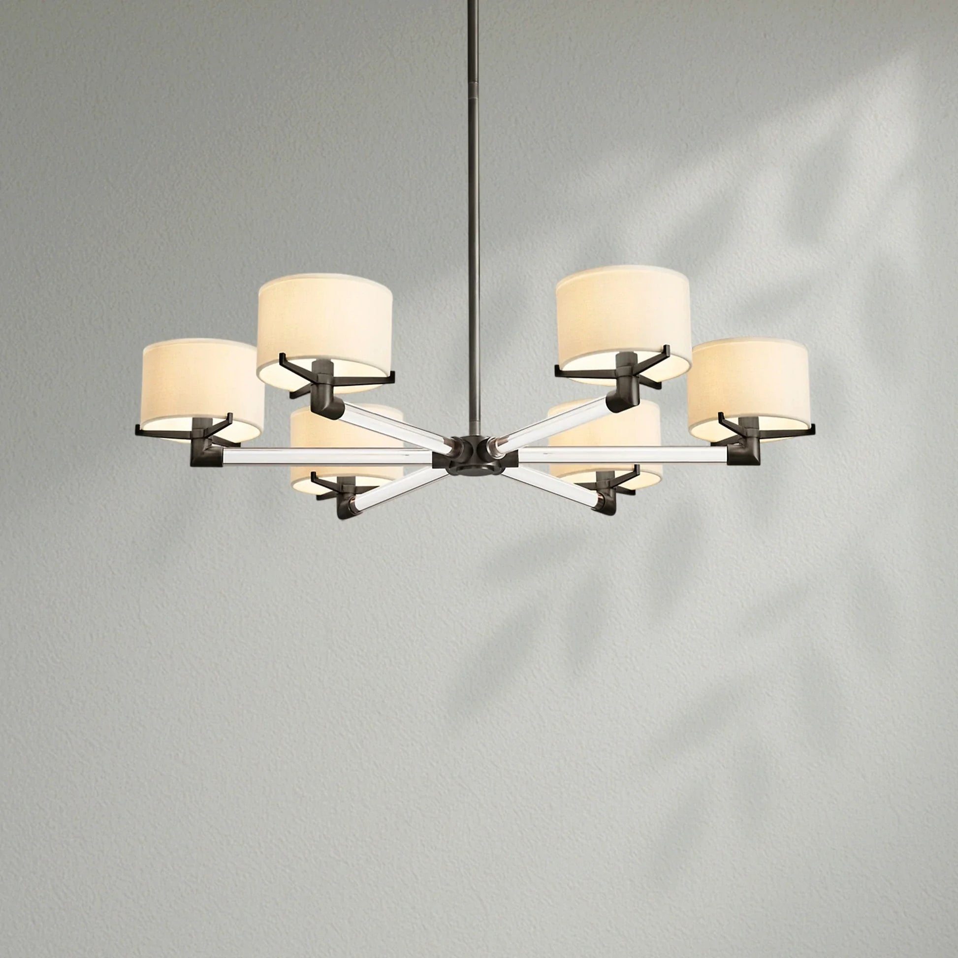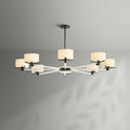 - Each arm is fitted with an Ivory linen closed-top drum shade