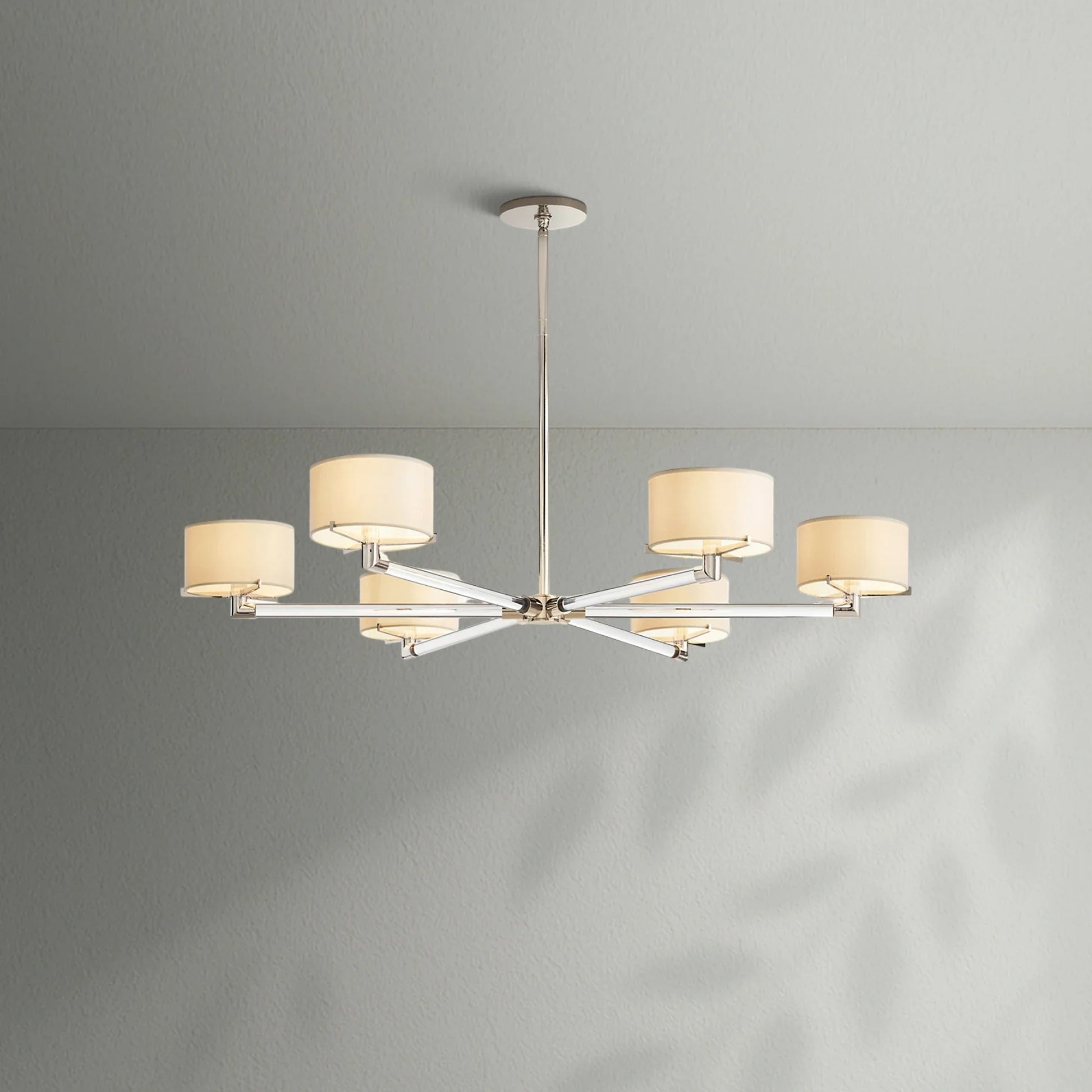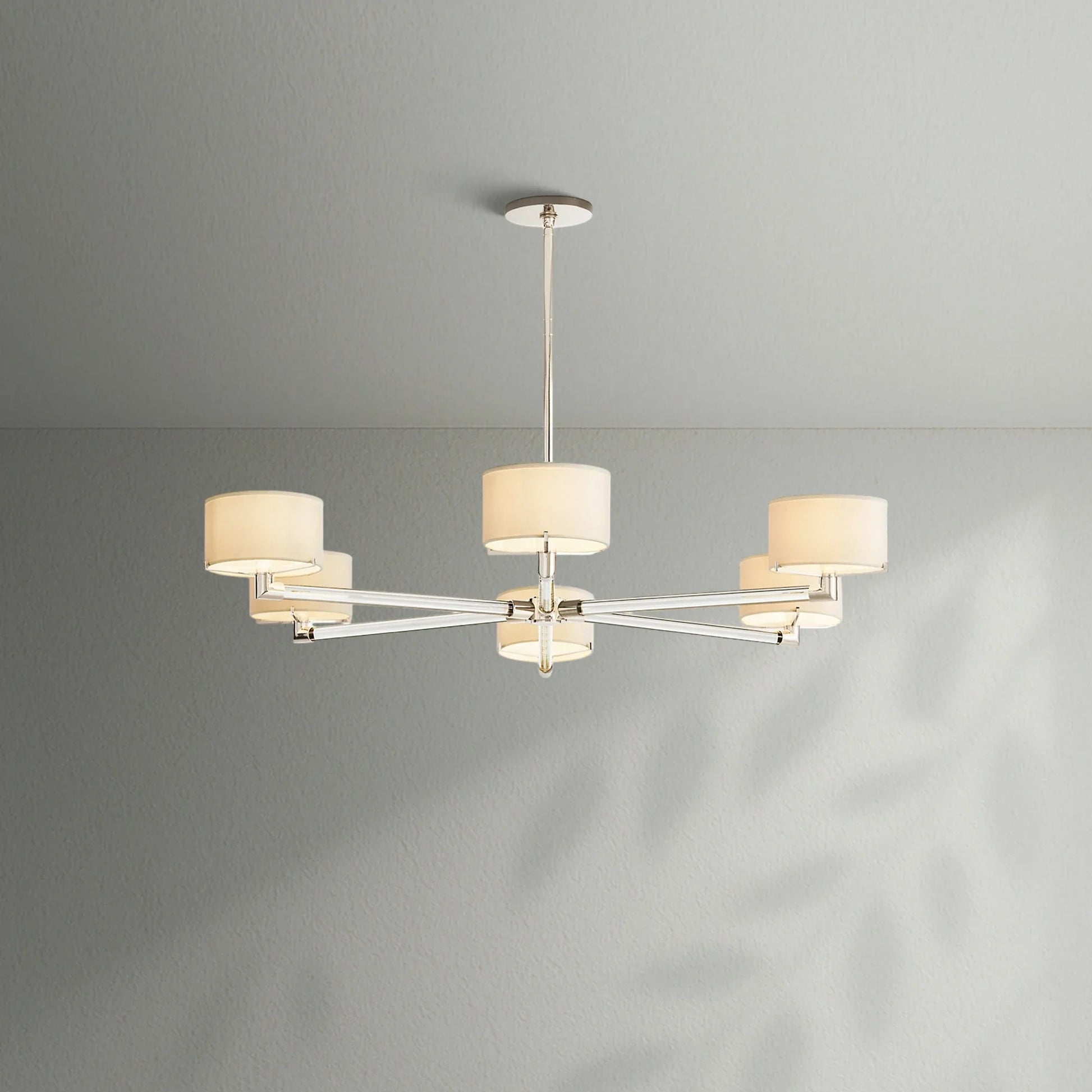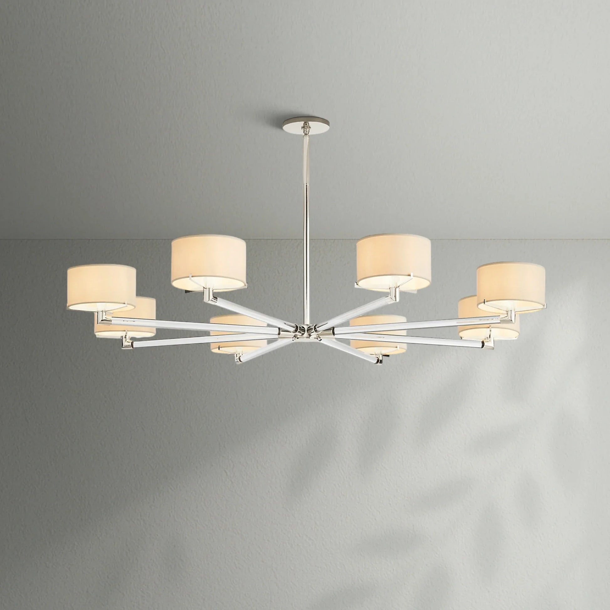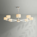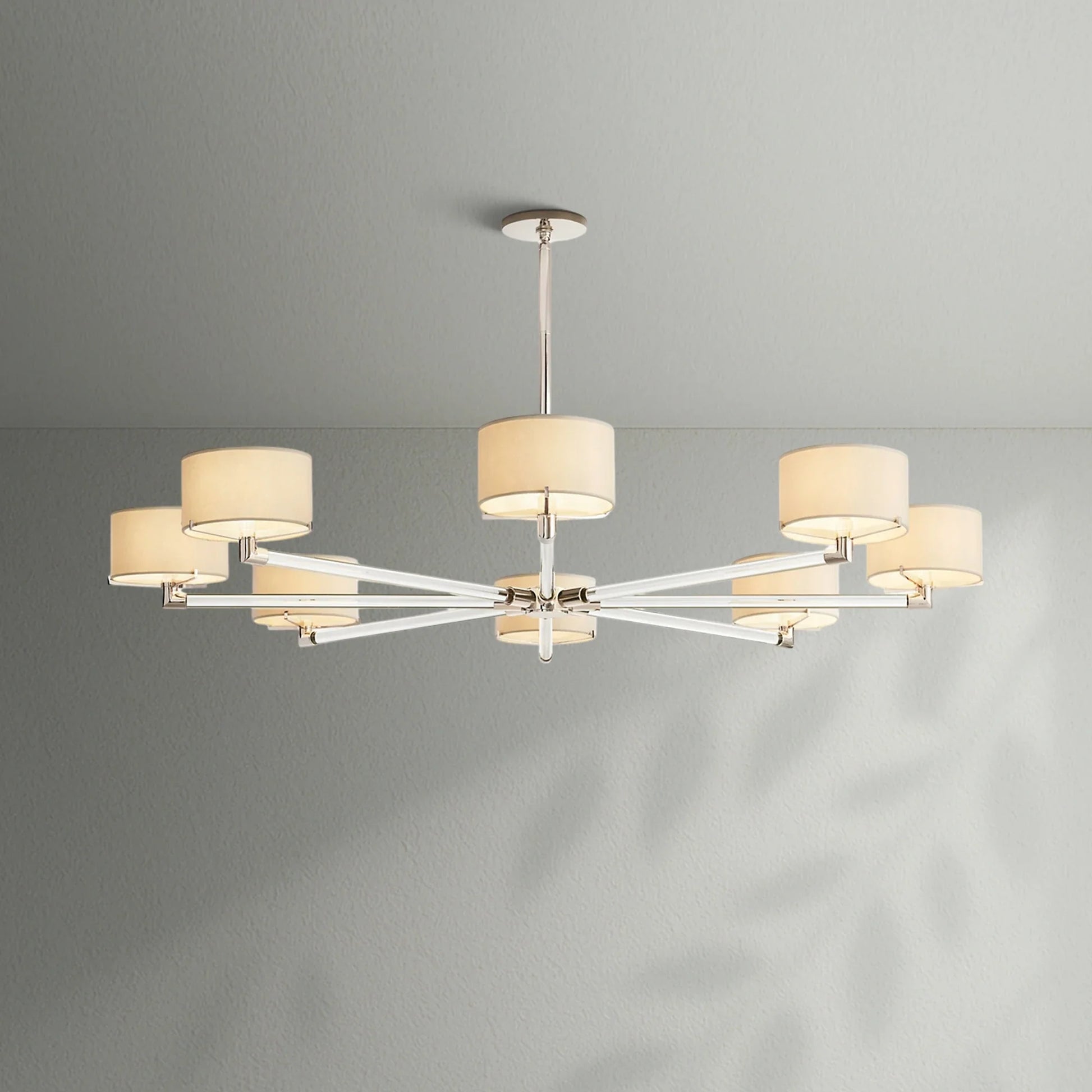 - Each arm is fitted with an Ivory linen closed-top drum shade
