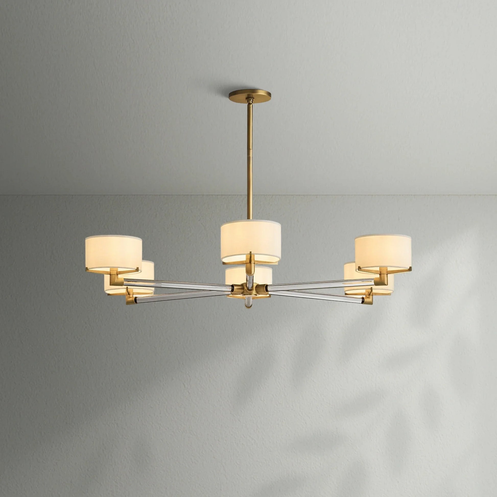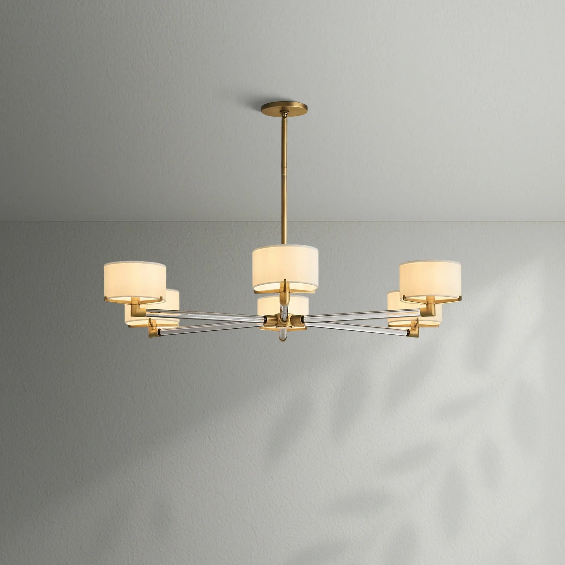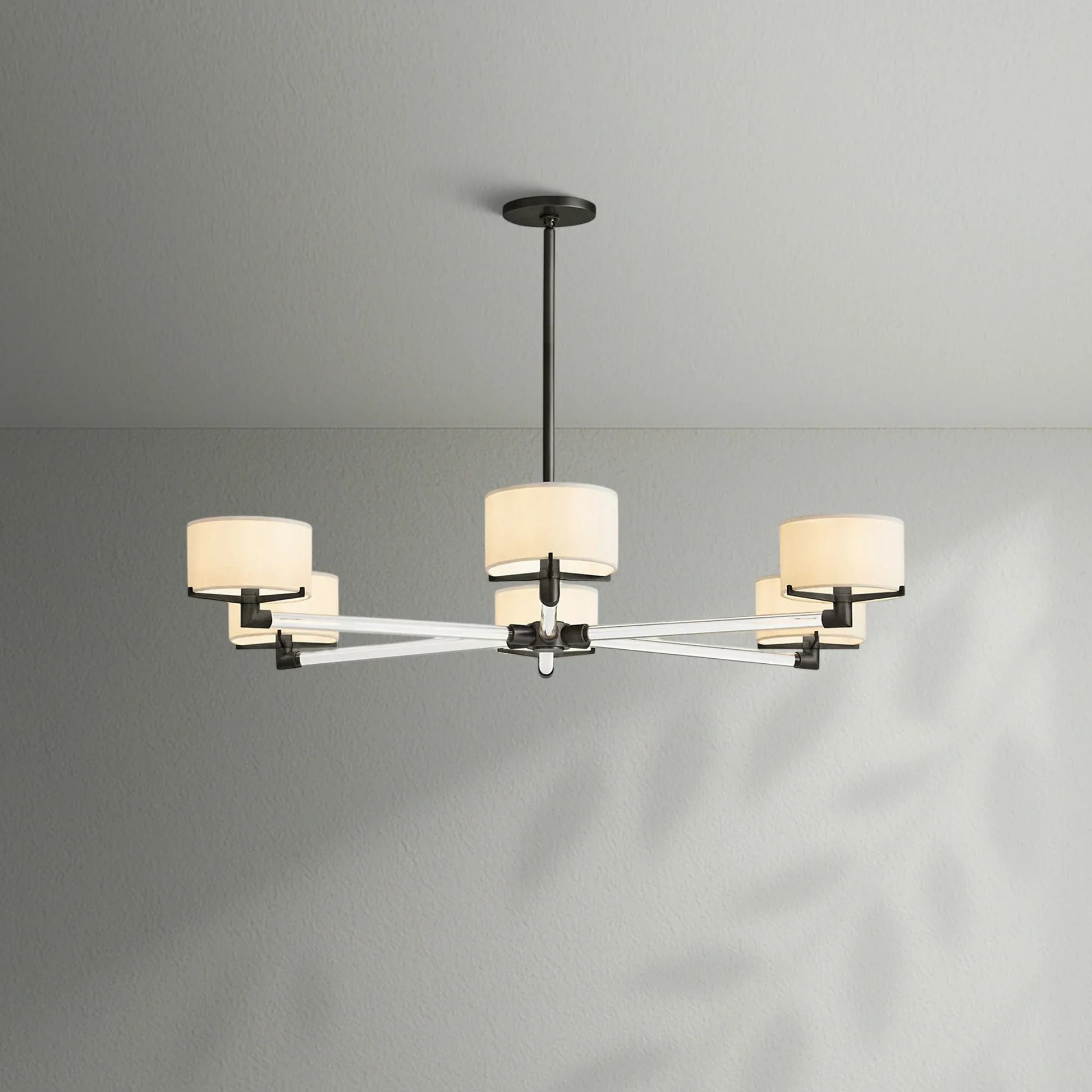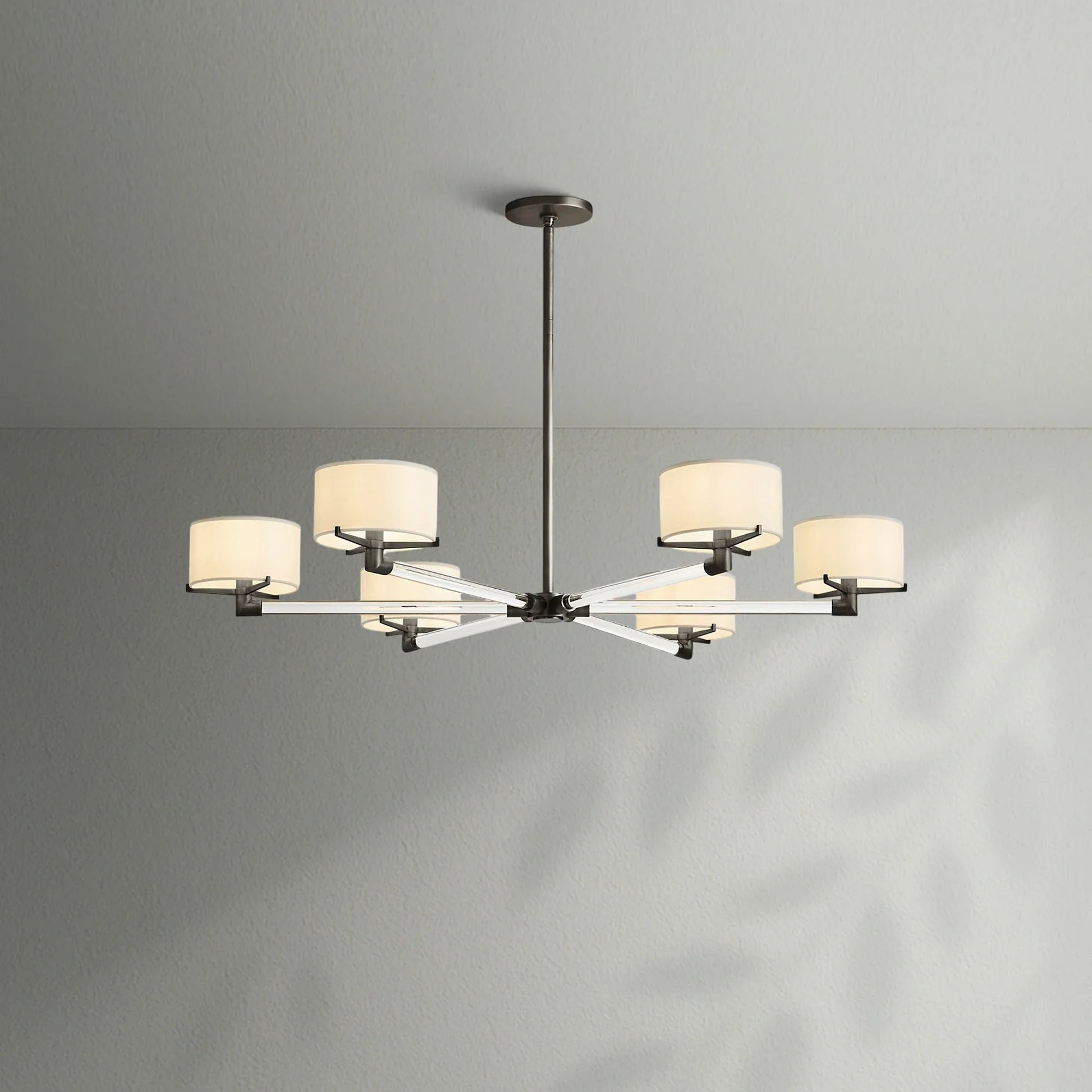 - Each arm is fitted with an Ivory linen closed-top drum shade