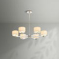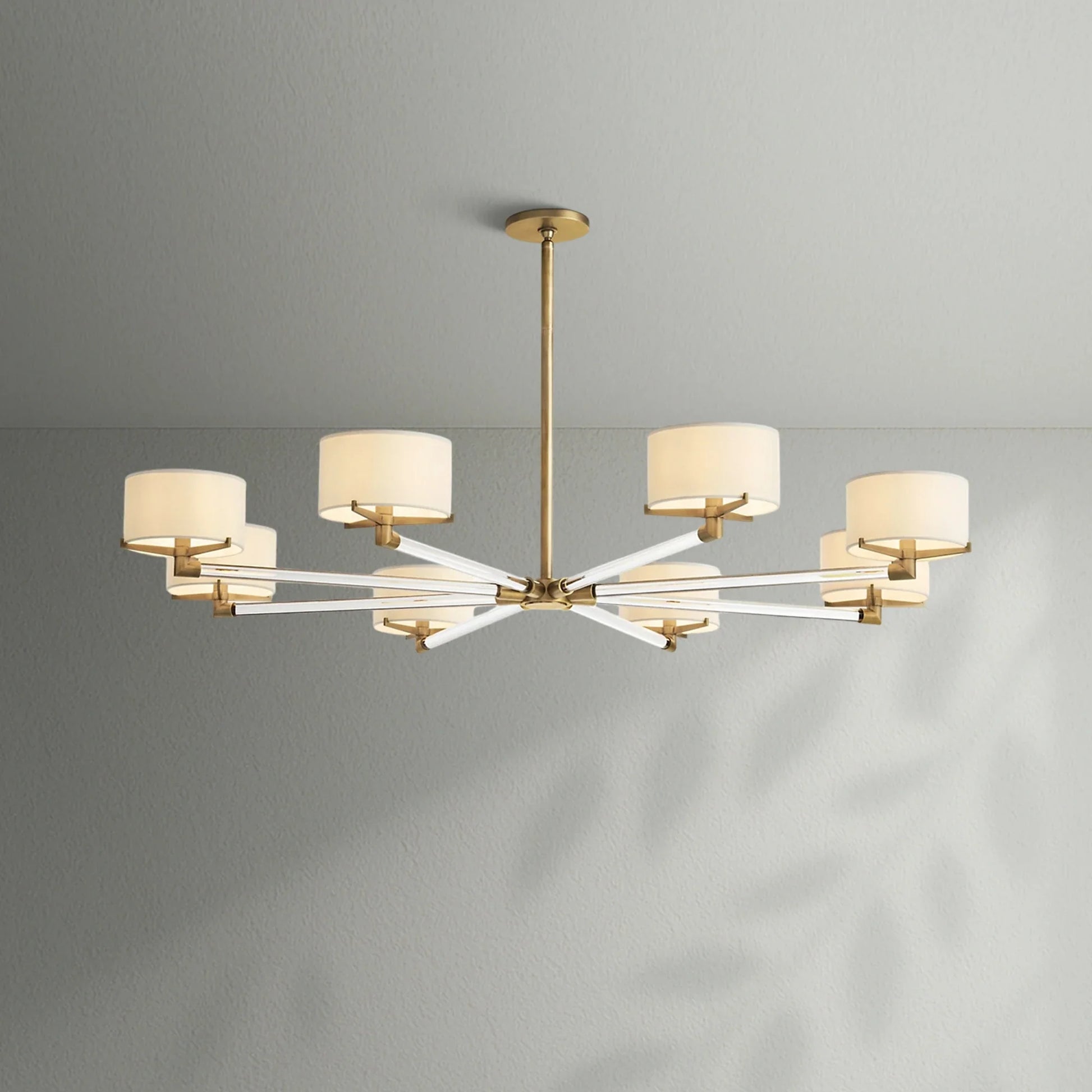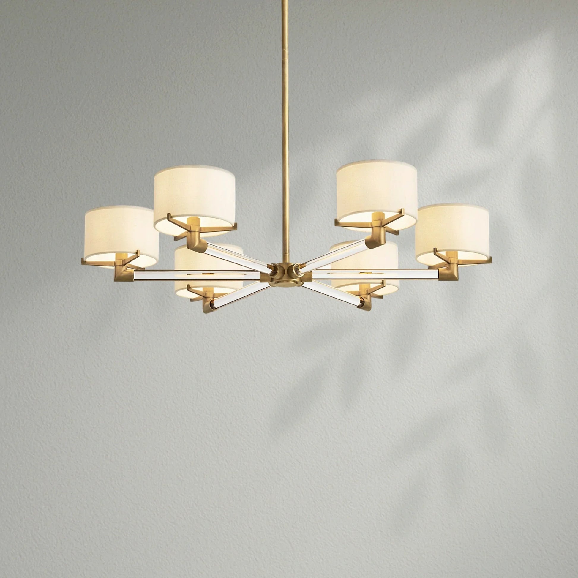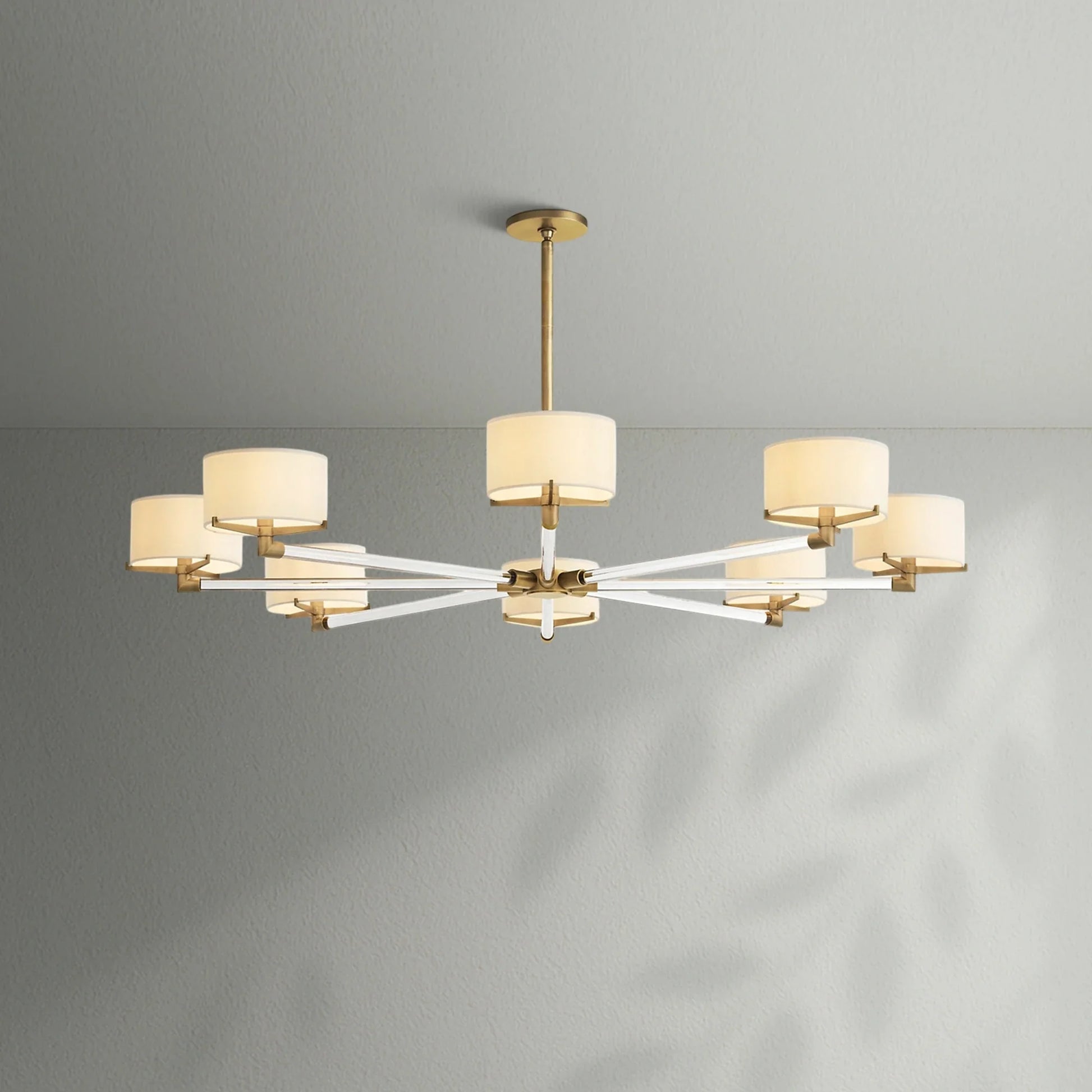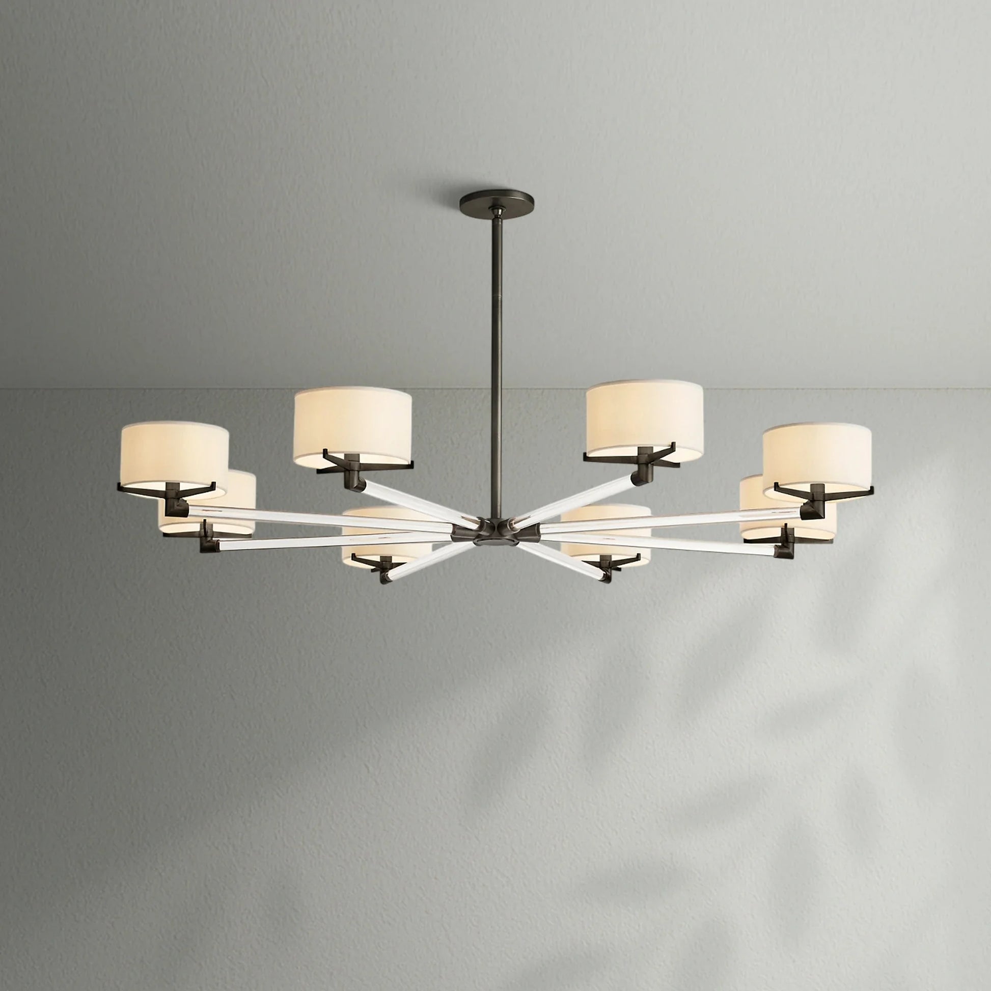 - Each arm is fitted with an Ivory linen closed-top drum shade