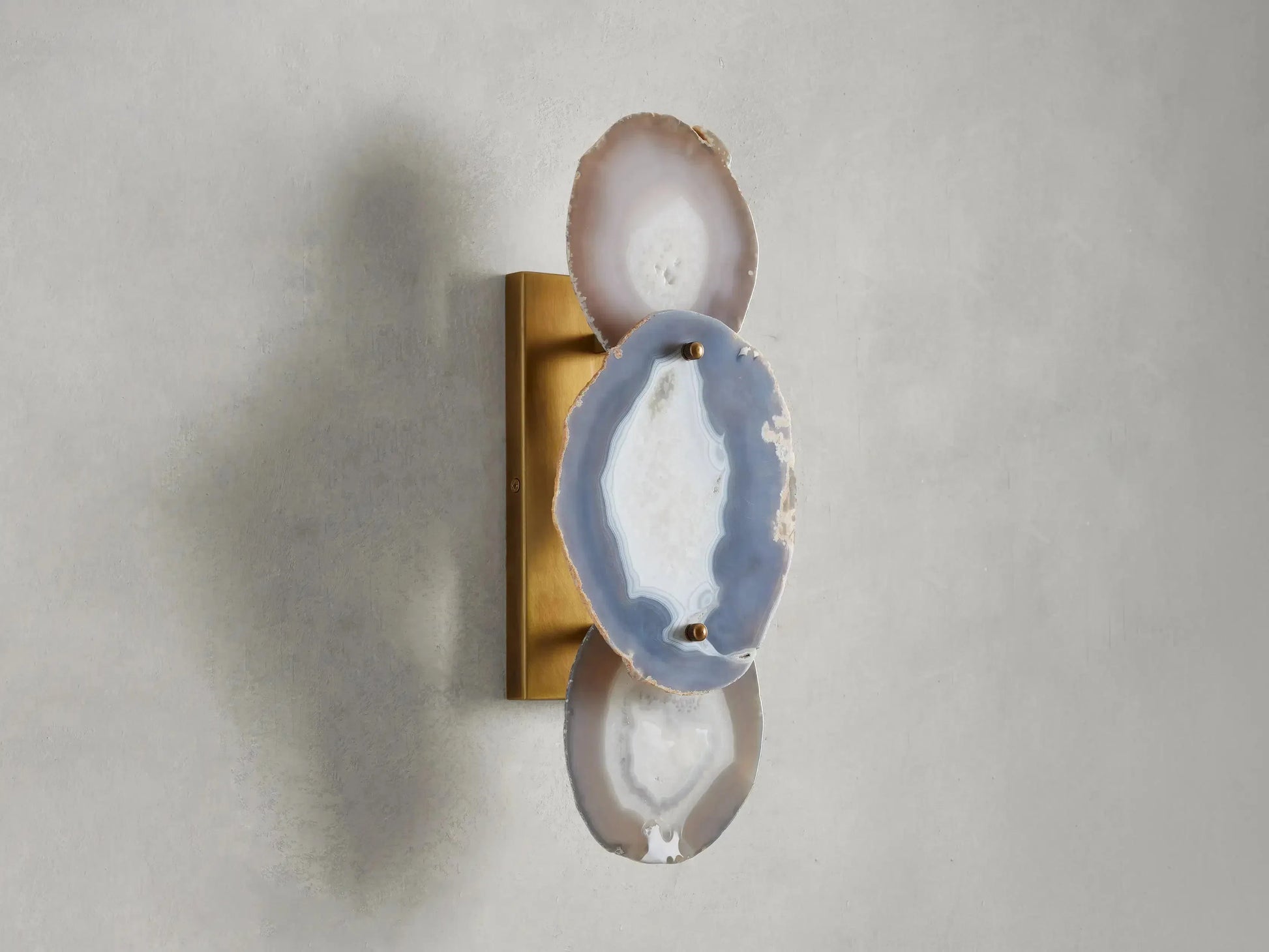 - Add natural luxury and organic texture to any space with our Turlough Wall Sconce. Three stunning slices of natural agate are individually arranged to create each extraordinary sconce, a true work of art held together with sturdy steel hardware. Warm light glows from behind the agate slices, creating a soft statement to illuminate your home wherever you need the welcoming accent light the most.