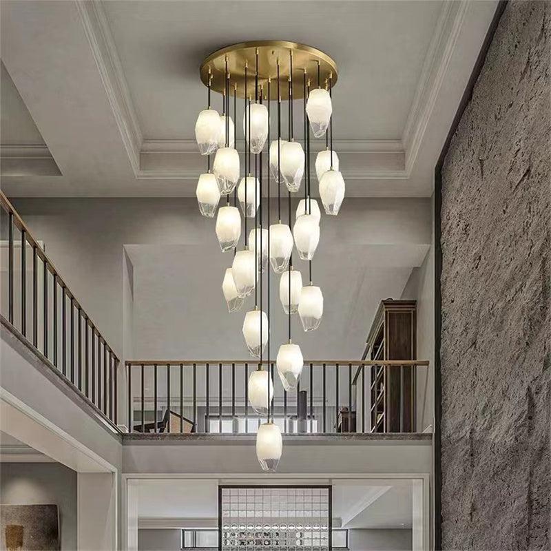 Besides the general rule that the chandelier’s bottom should be at least 7 and a half feet away from the floor. For two stories, what you also need to consider is how will it look from the second floor. In general, staircase chandeliers will be a good choice for space. In term of placing, below are two commonly seen guidance: