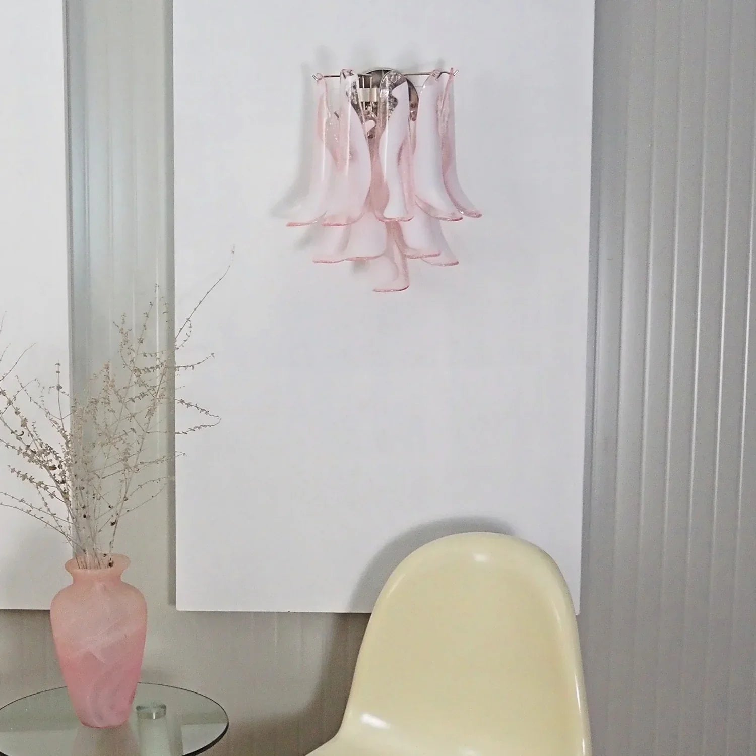 Vintage Murano Pink Wall Lights, Enhance your space. Crafted with Pink and white glass petals in a metal frame, these lights instantly add a touch of elegance. Experience the beautiful light and effects they cast when opened or closed.