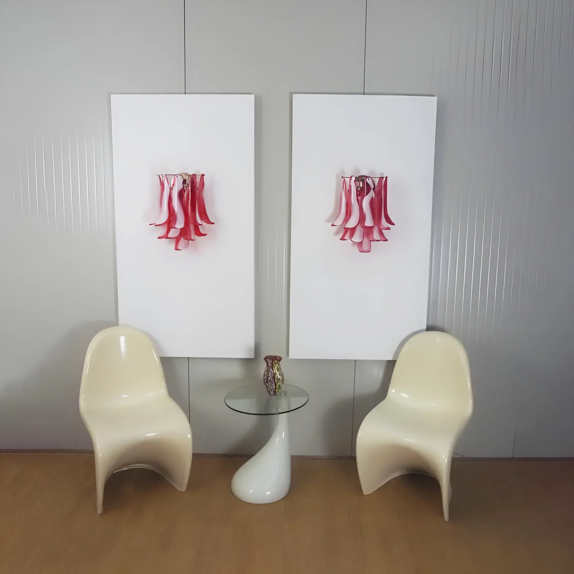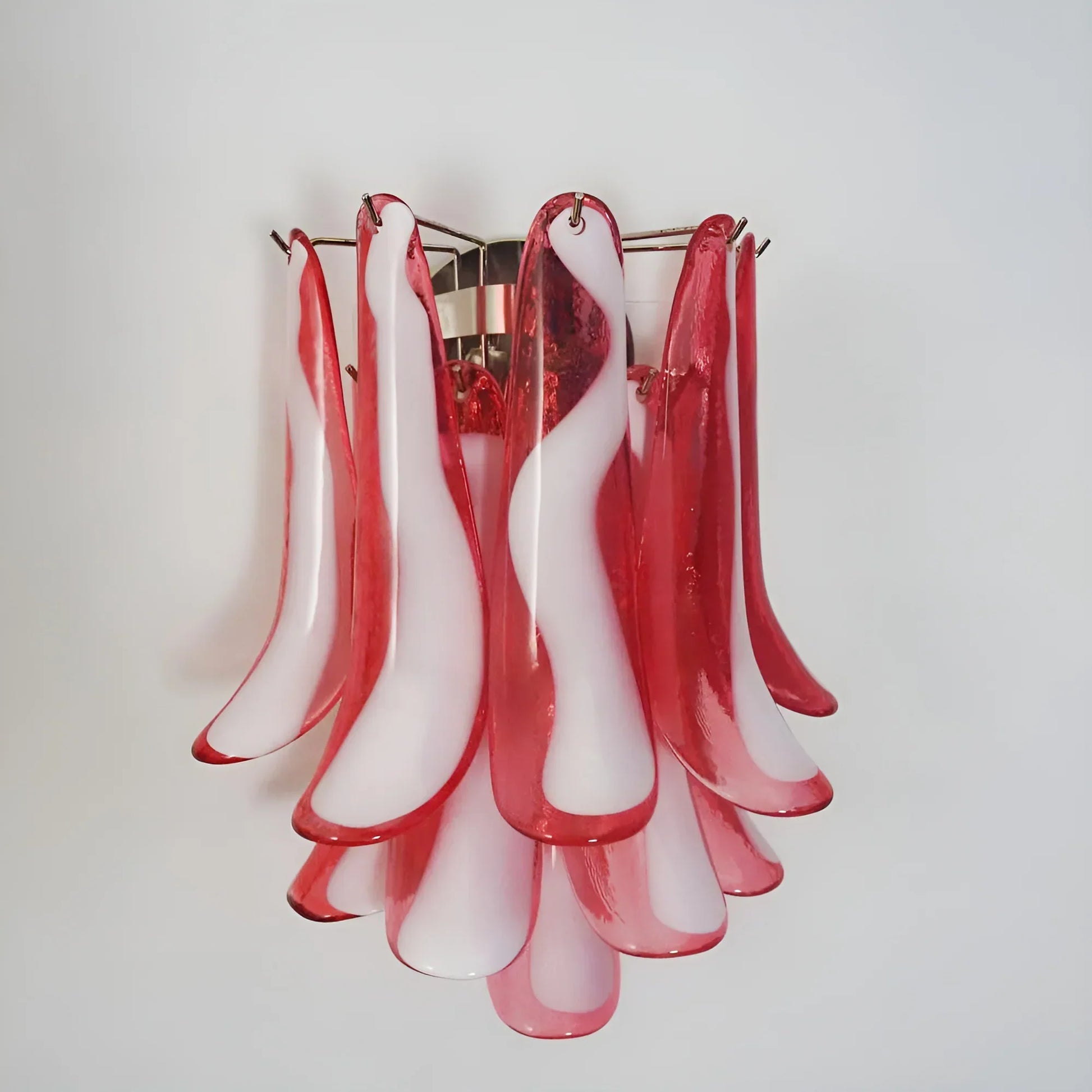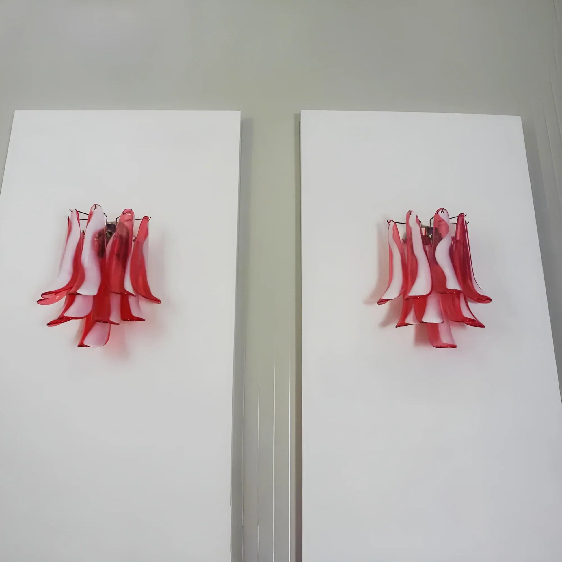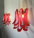 Vintage Murano Red Wall Lights, Enhance your space. Crafted with red and white glass petals in a metal frame, these lights instantly add a touch of elegance. Experience the beautiful light and effects they cast when opened or closed.