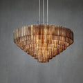| The collection's chandeliers combine traditional glassmaking techniques with modernist style. It is a study in geometric repetition, with textured ribbons of cast glass cascading in concentric circles, casting a warm glow to stunning effect. |