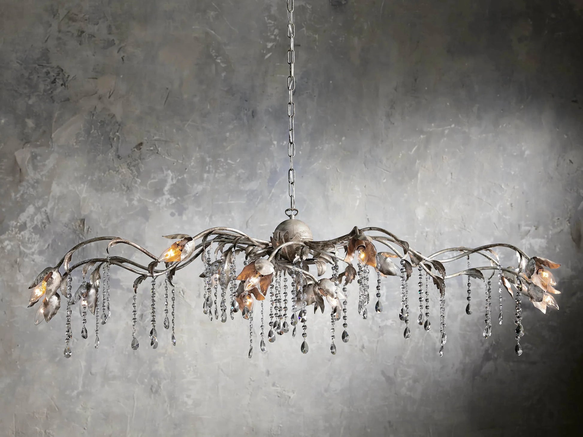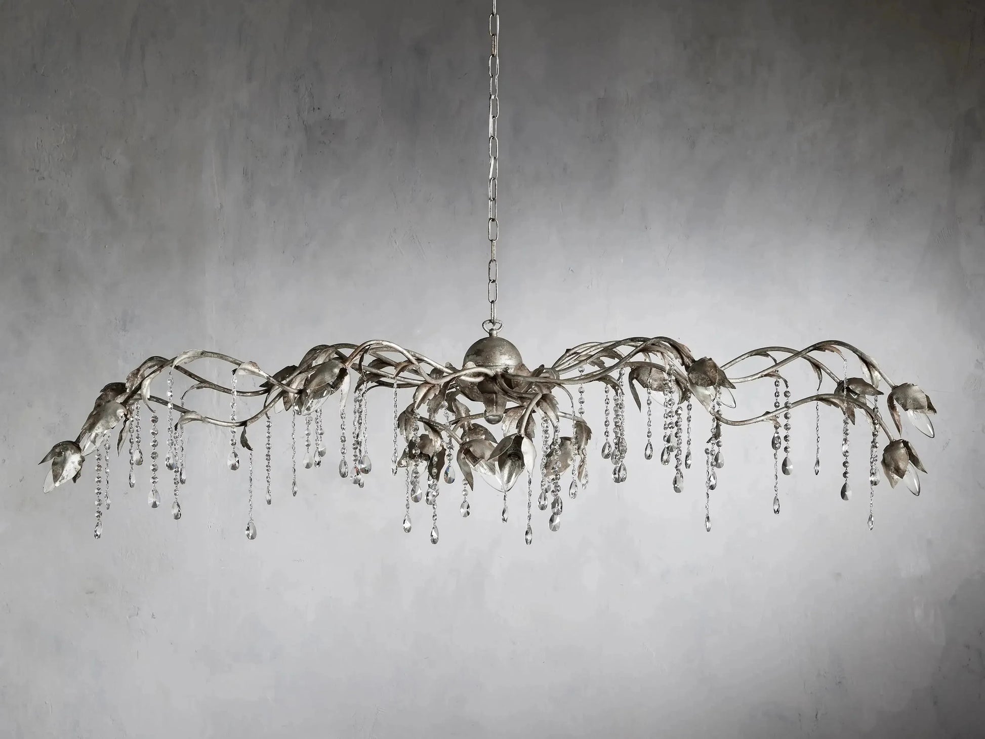 - Like freshly fallen rain on draped garden vines, our Viticcio Chandelier is hand-moulded by artisans from solid iron. Floral flourishes are elegantly accentuated by a hand-applied silver finish, and hand-strung crystals dangle to scatter drops of light around your space.